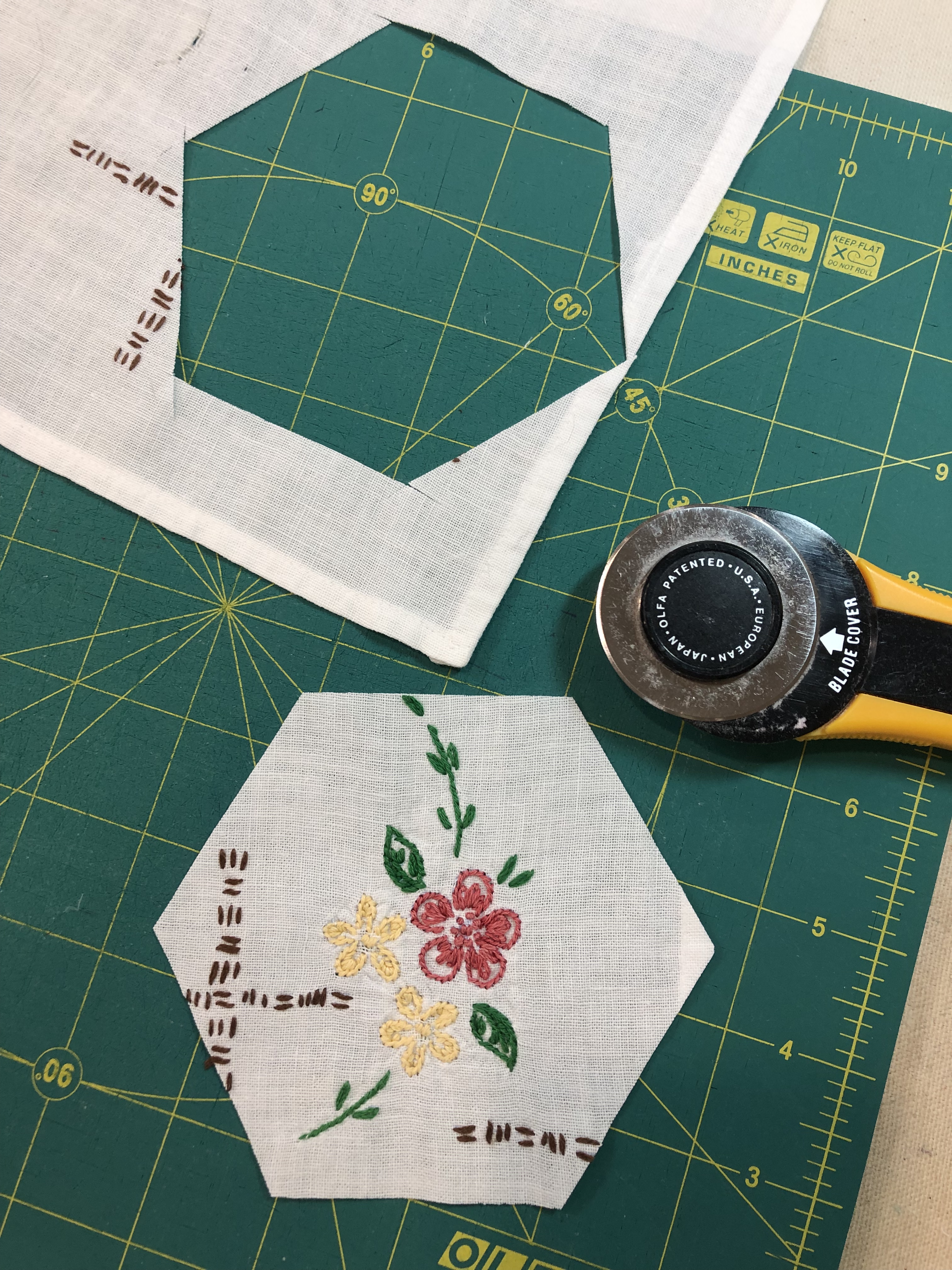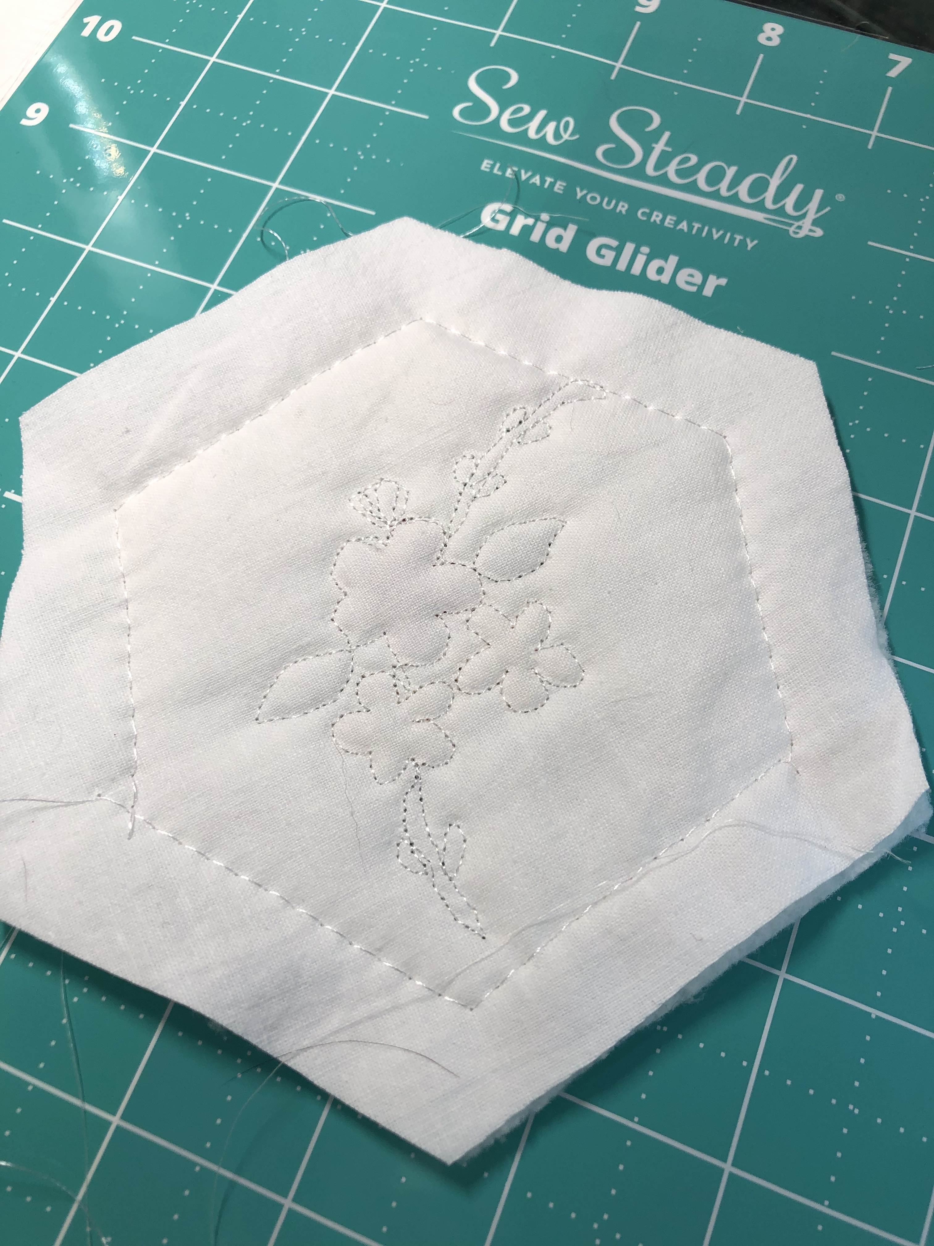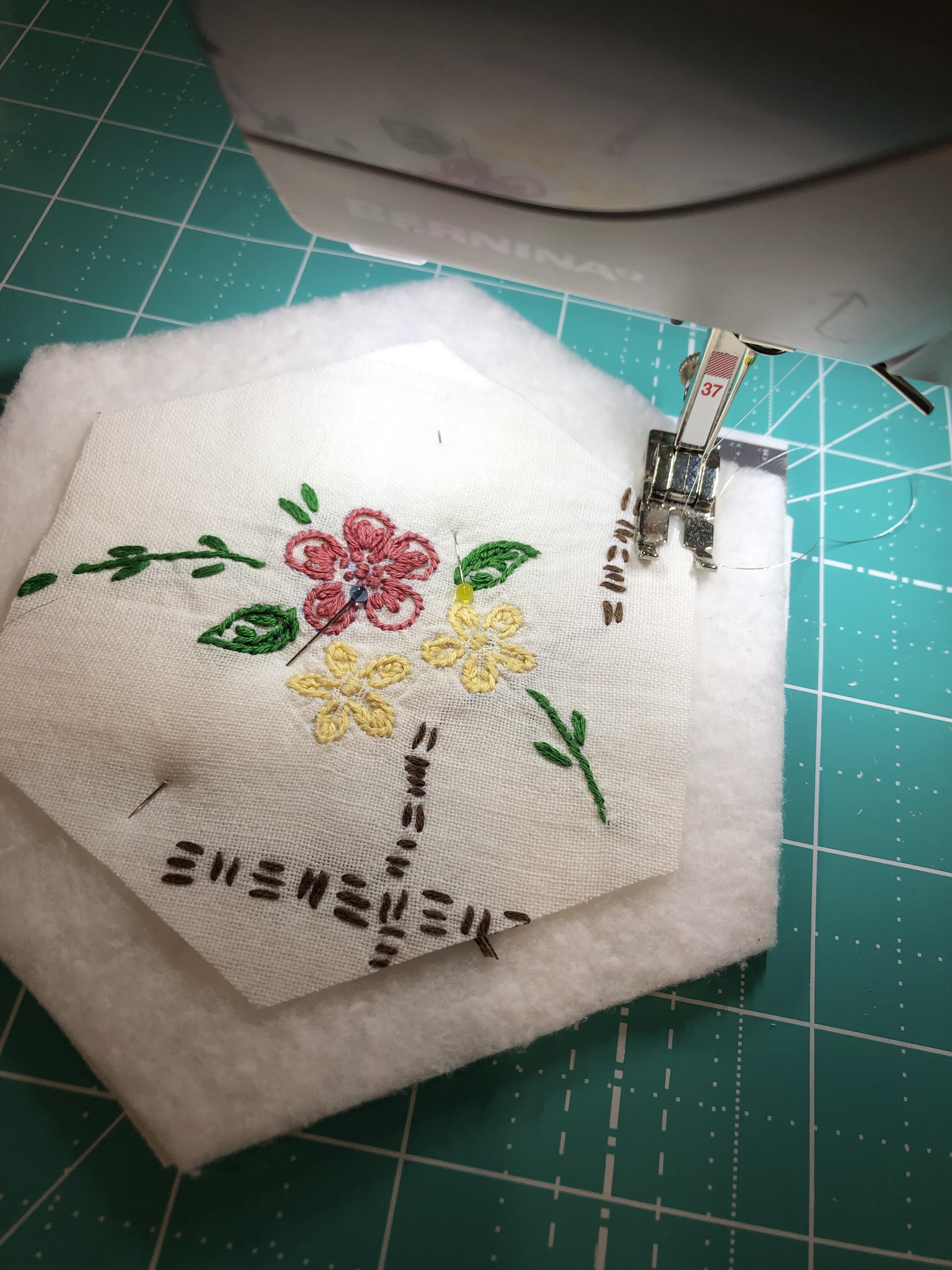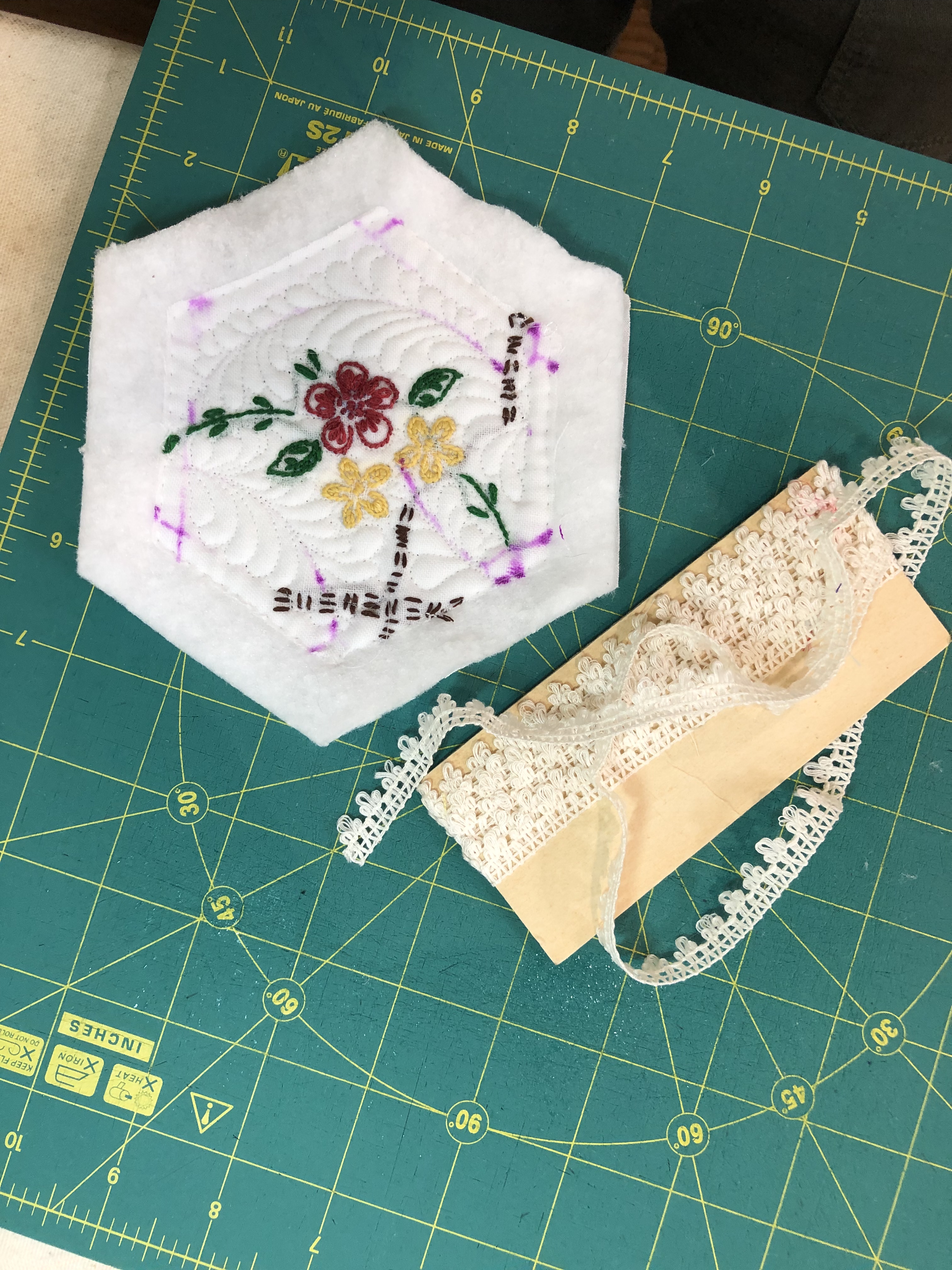 The backing fabric is cut 5/8″ larger on all sides. It is folded once to meet the raw edge of the embellished hexagon and the final fold will take it over the edge to the front where it frames the hexagon nicely and is hand stitched in place.