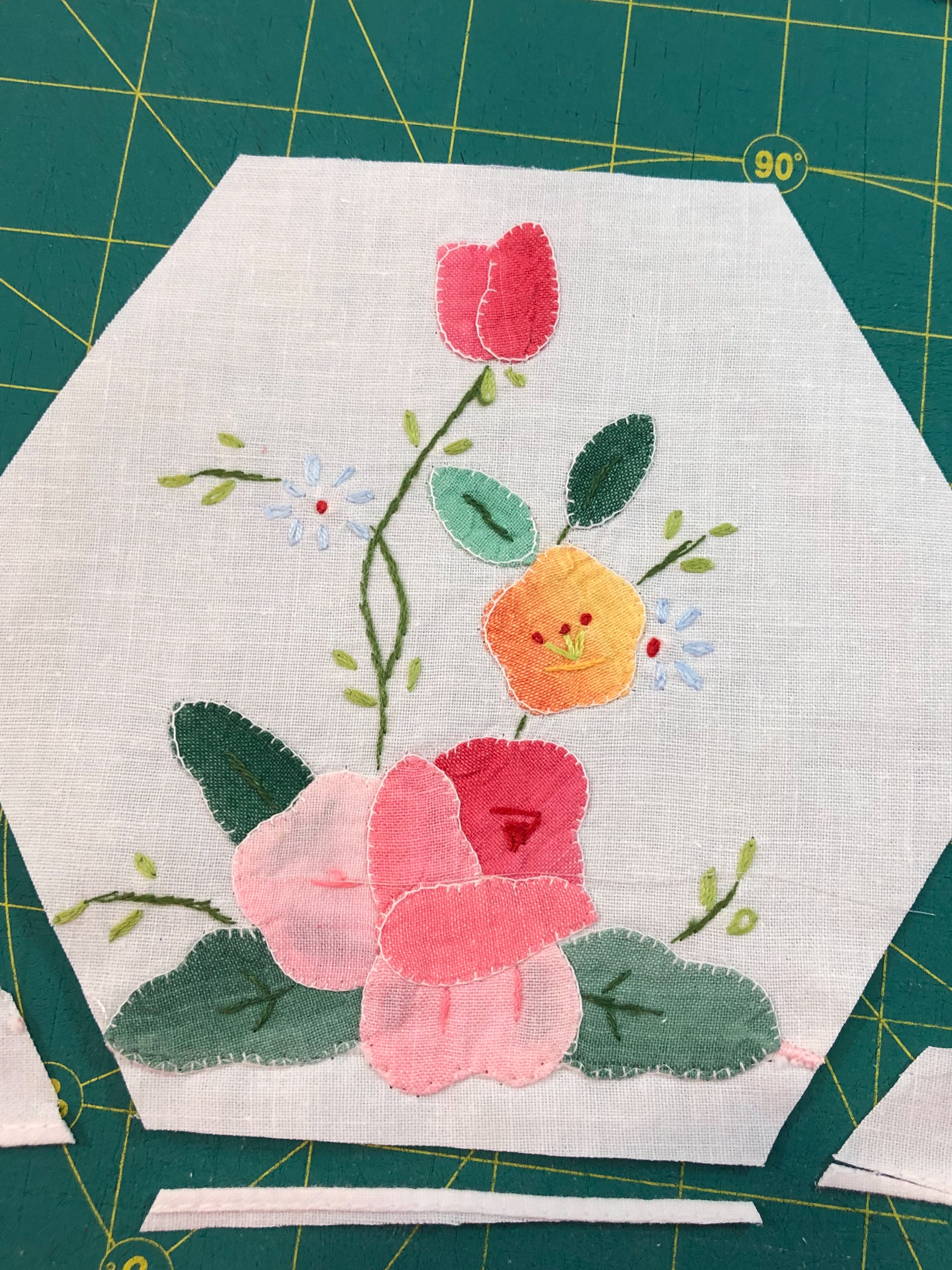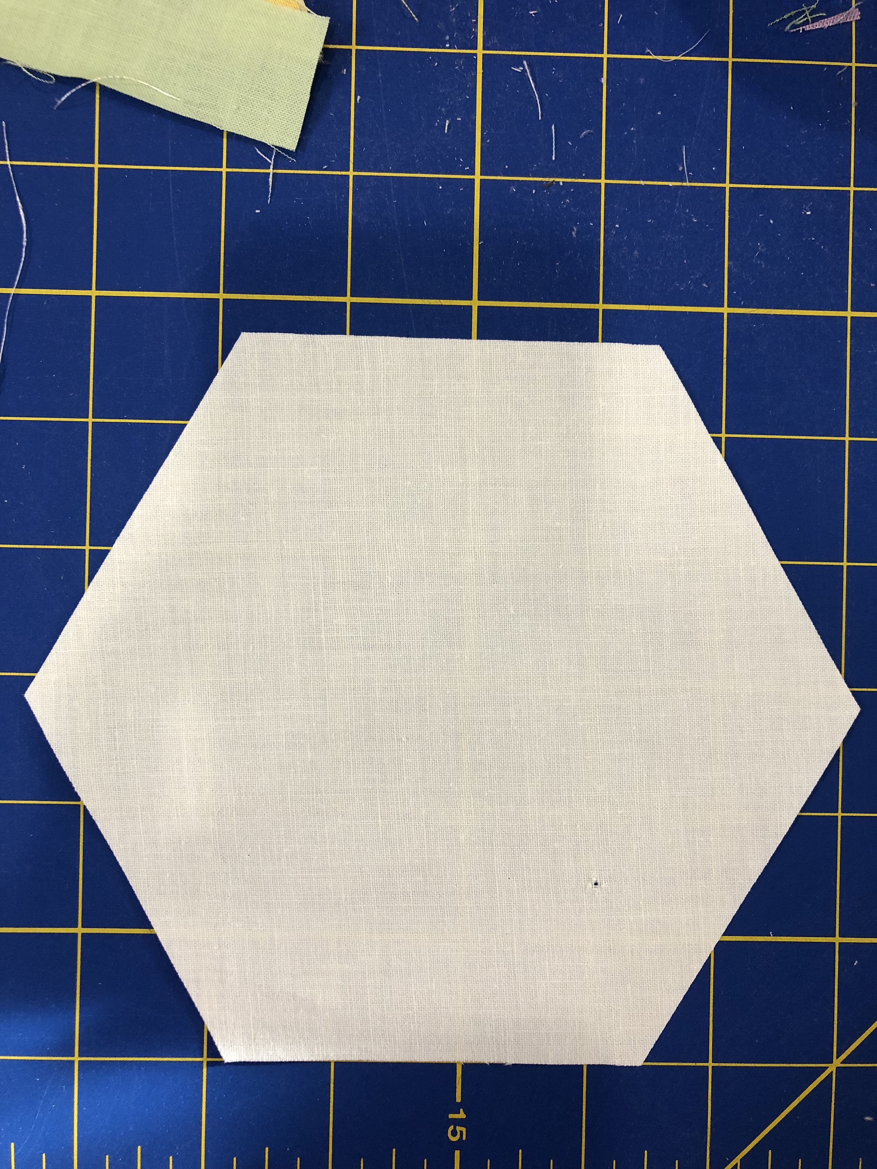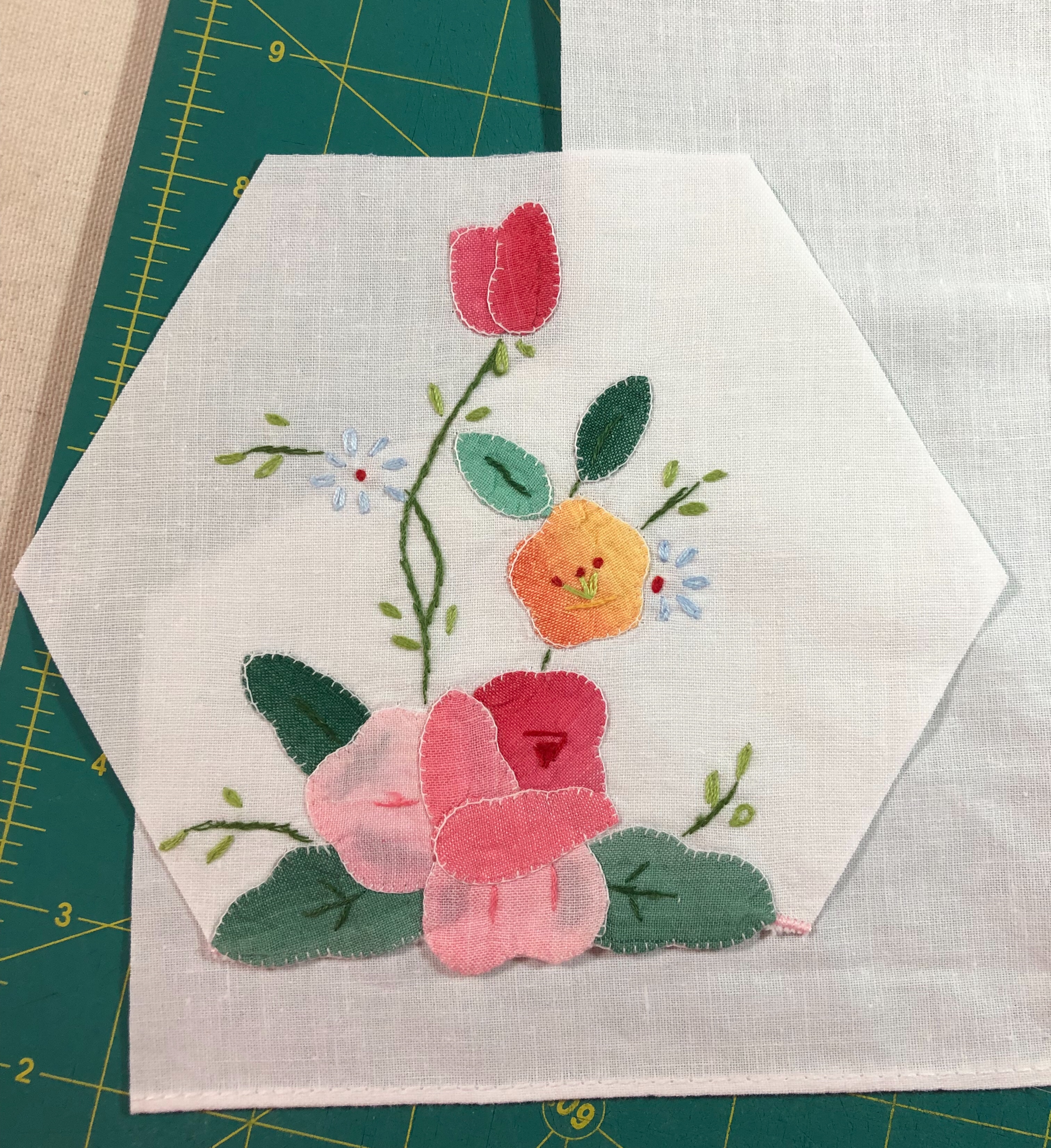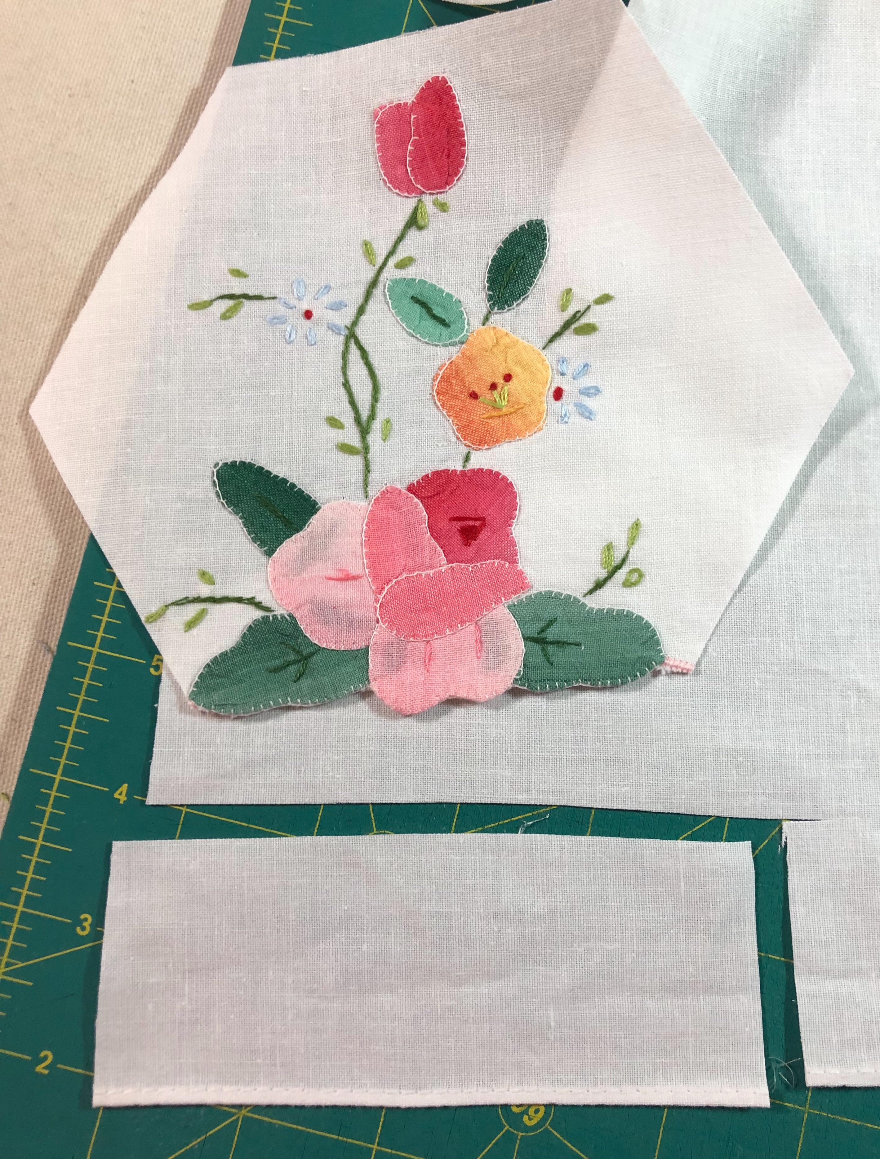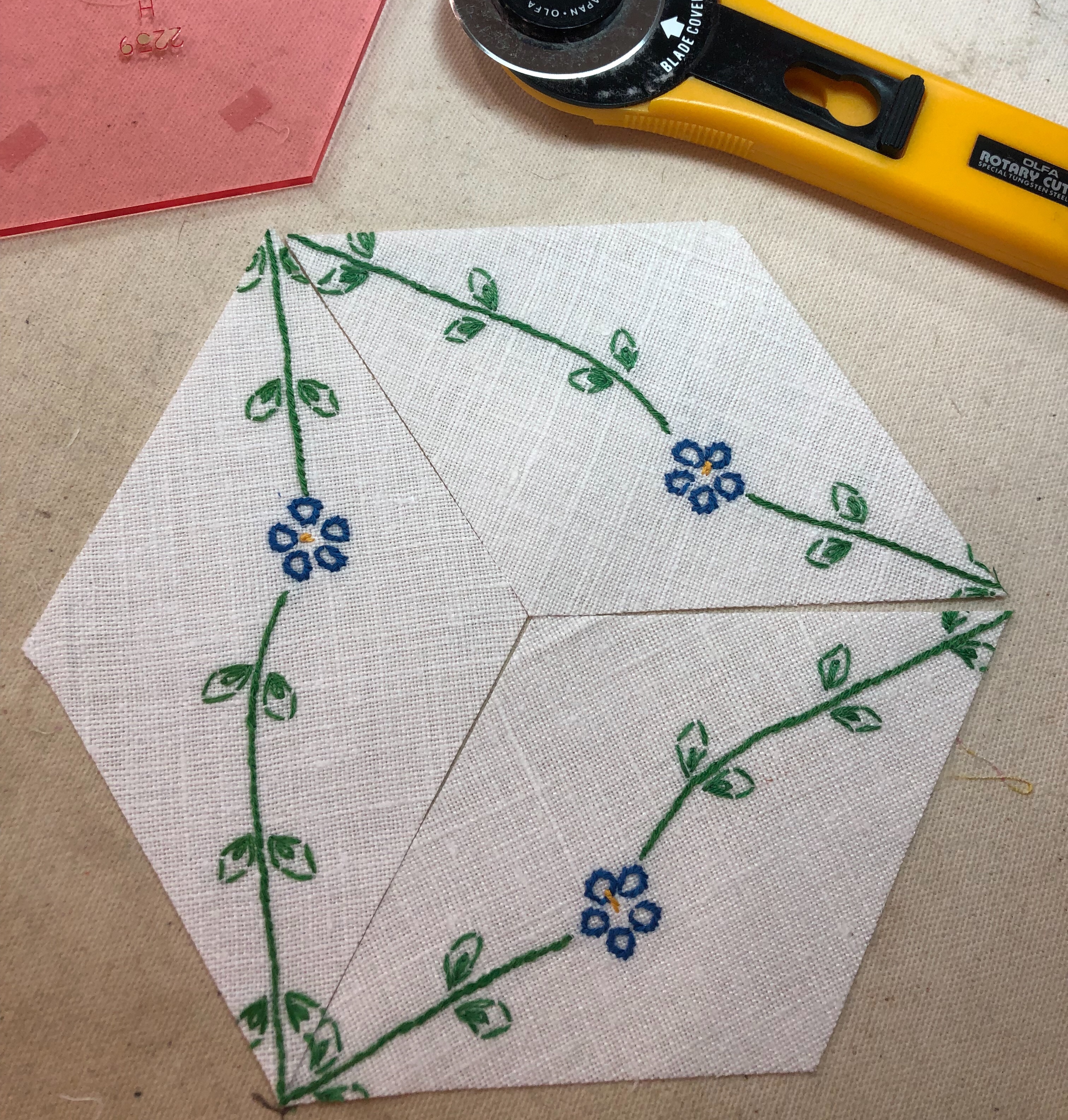 The backing fabric is cut 5/8″ larger on all sides. It is folded once to meet the raw edge of the embellished hexagon and the final fold will take it over the edge to the front where it frames the hexagon nicely and is hand stitched in place.