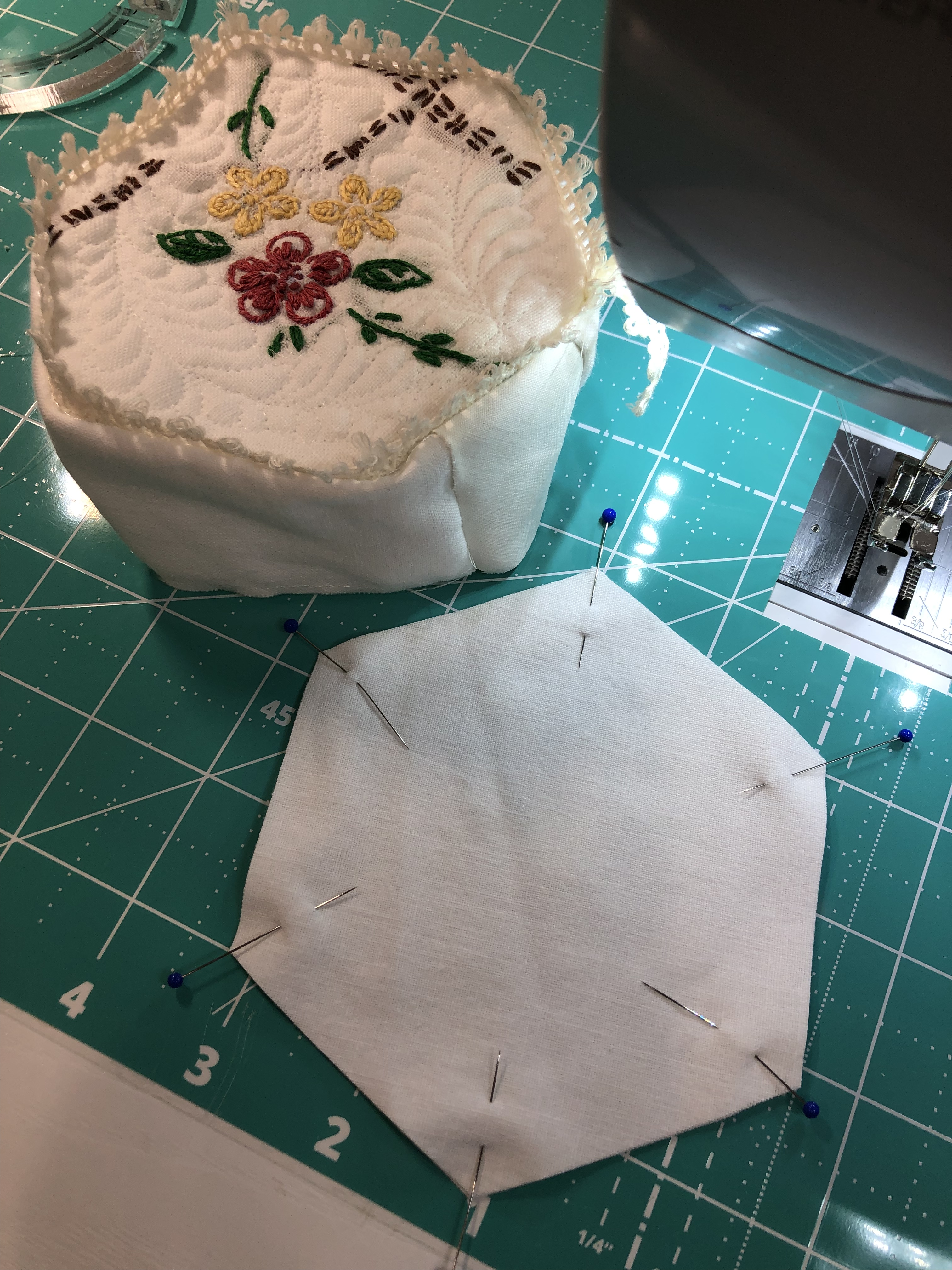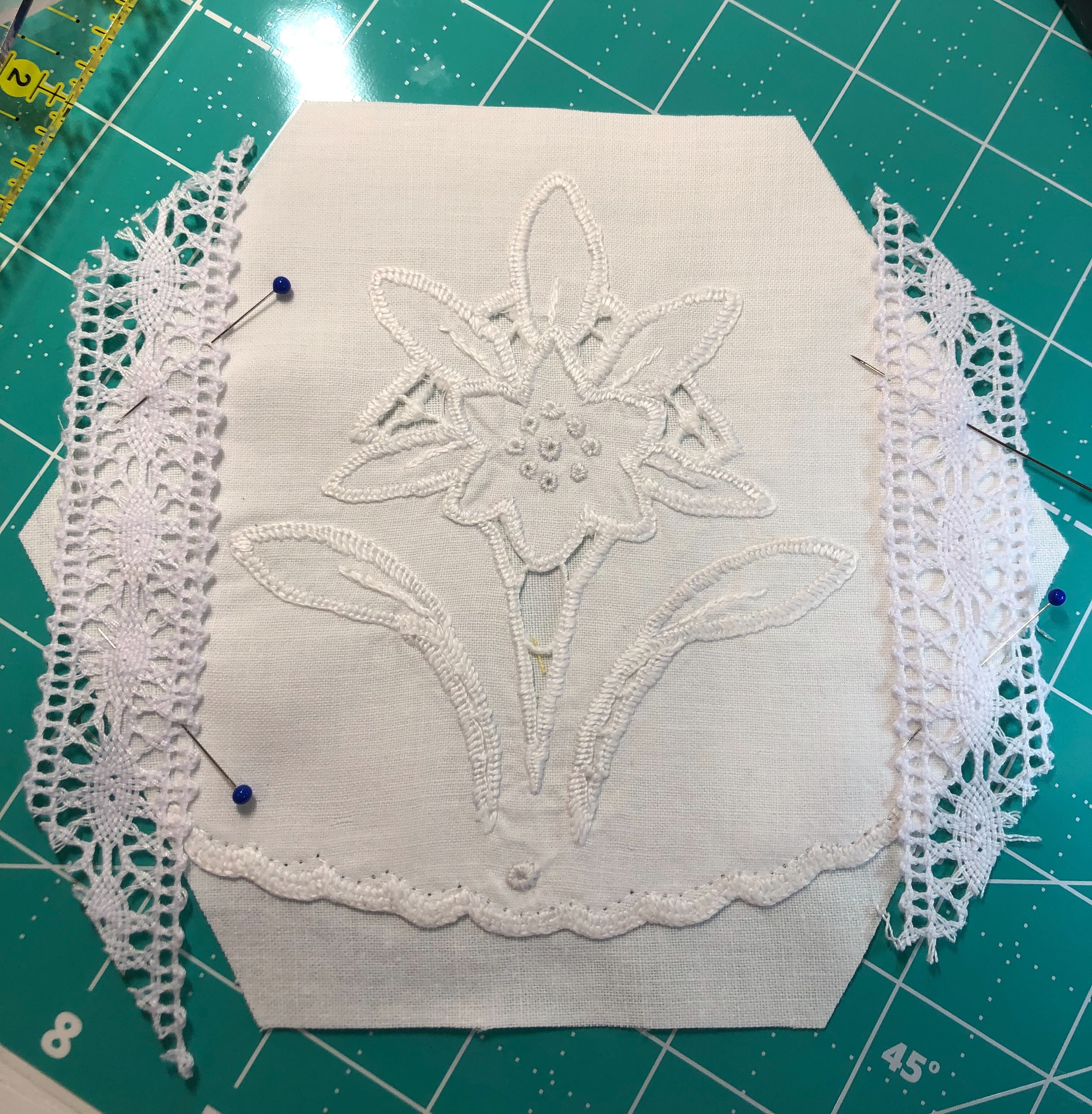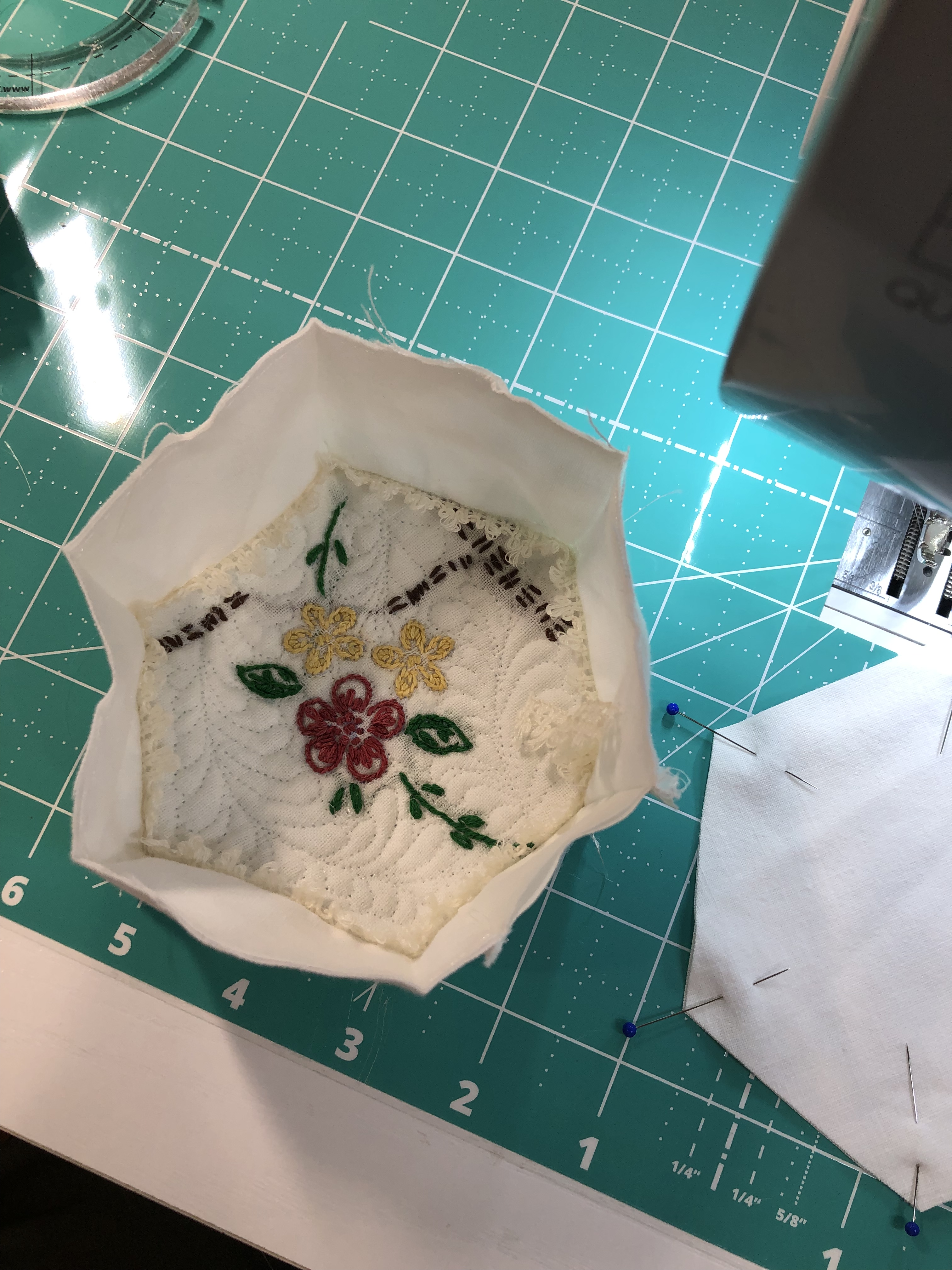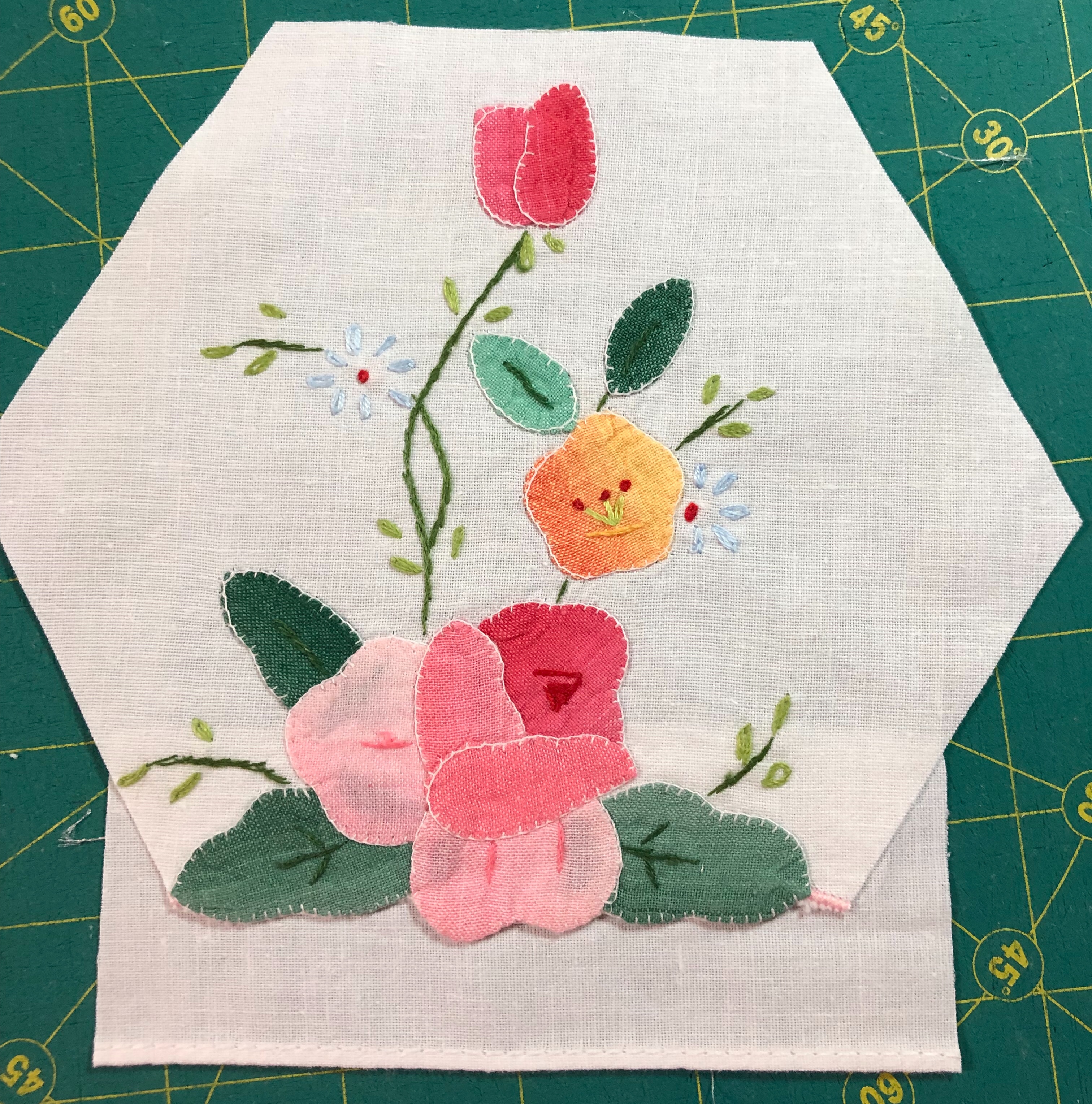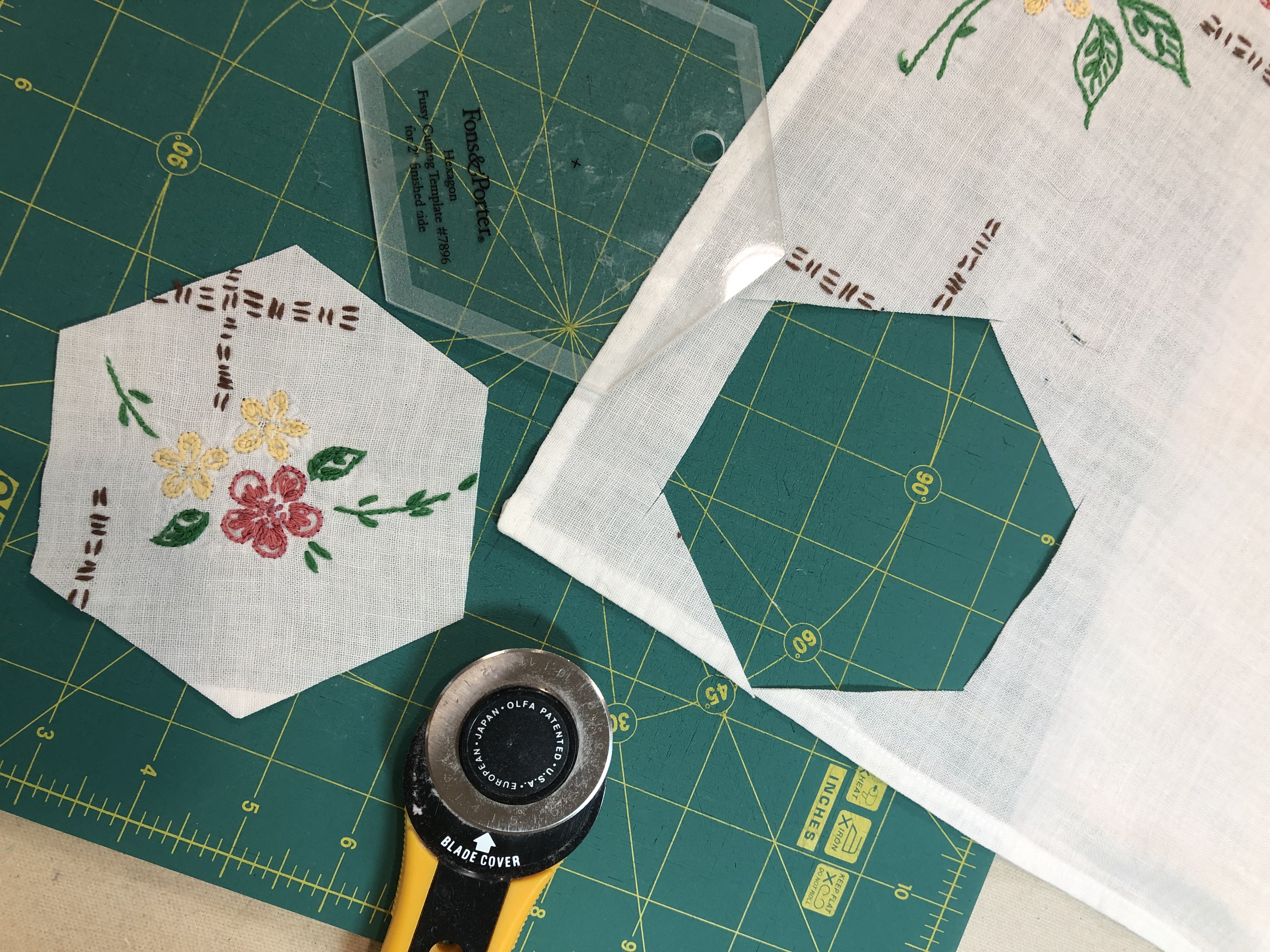 The backing fabric is cut 5/8″ larger on all sides. It is folded once to meet the raw edge of the embellished hexagon and the final fold will take it over the edge to the front where it frames the hexagon nicely and is hand stitched in place.