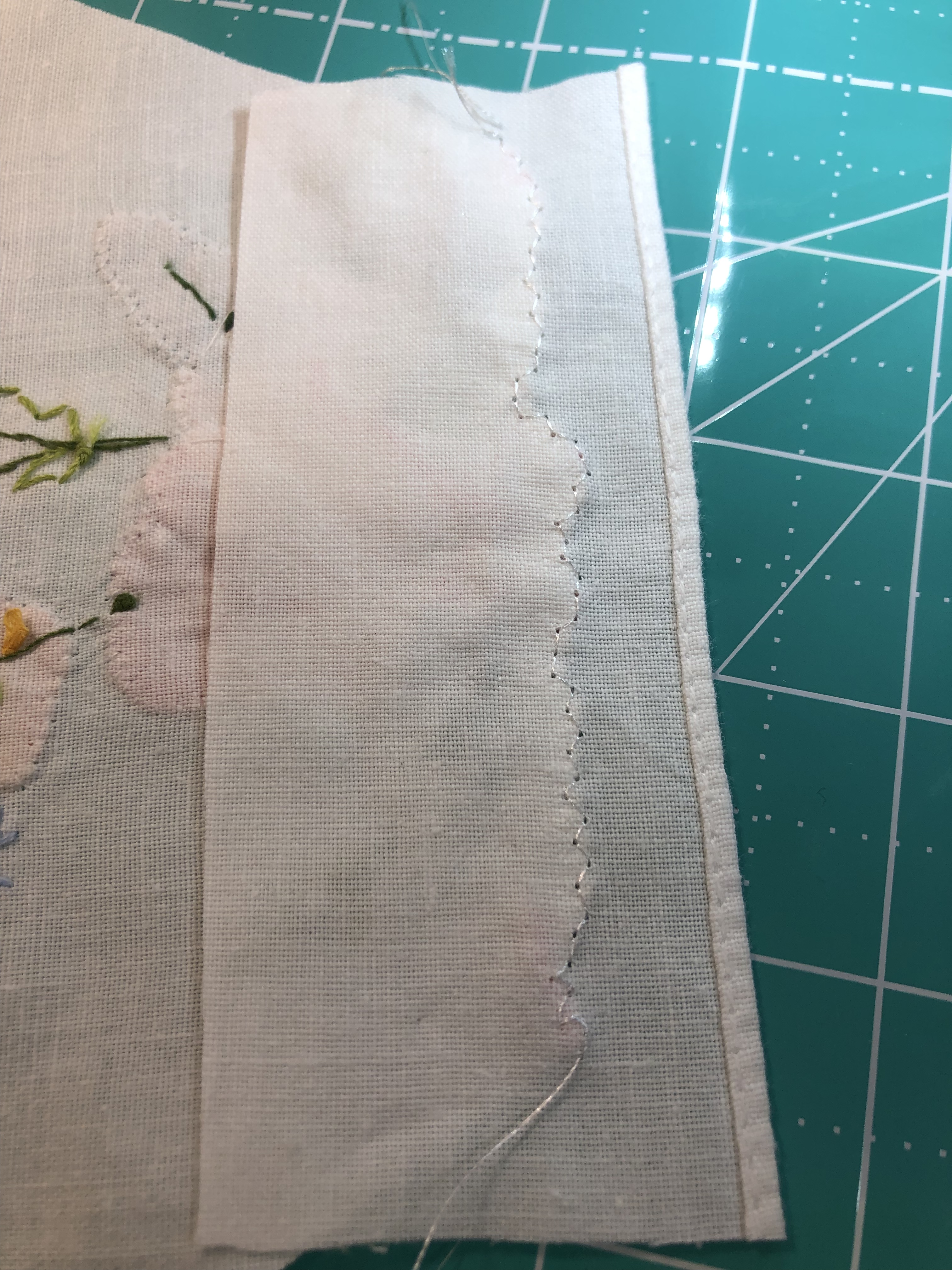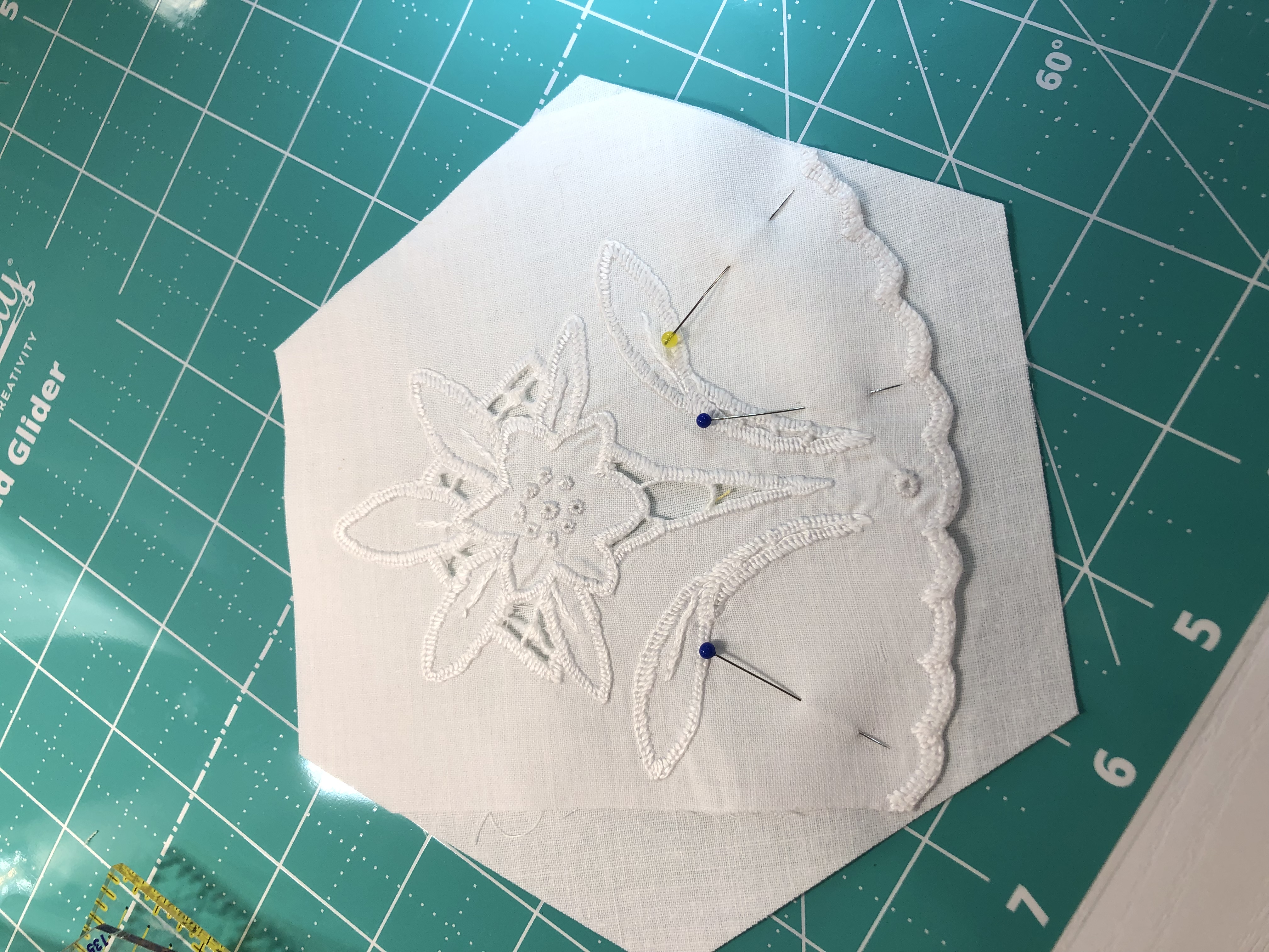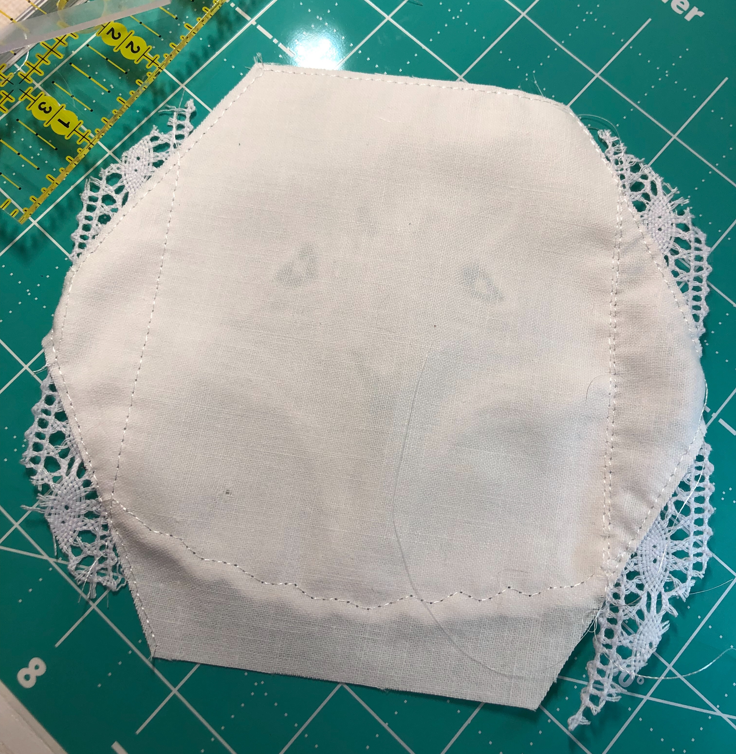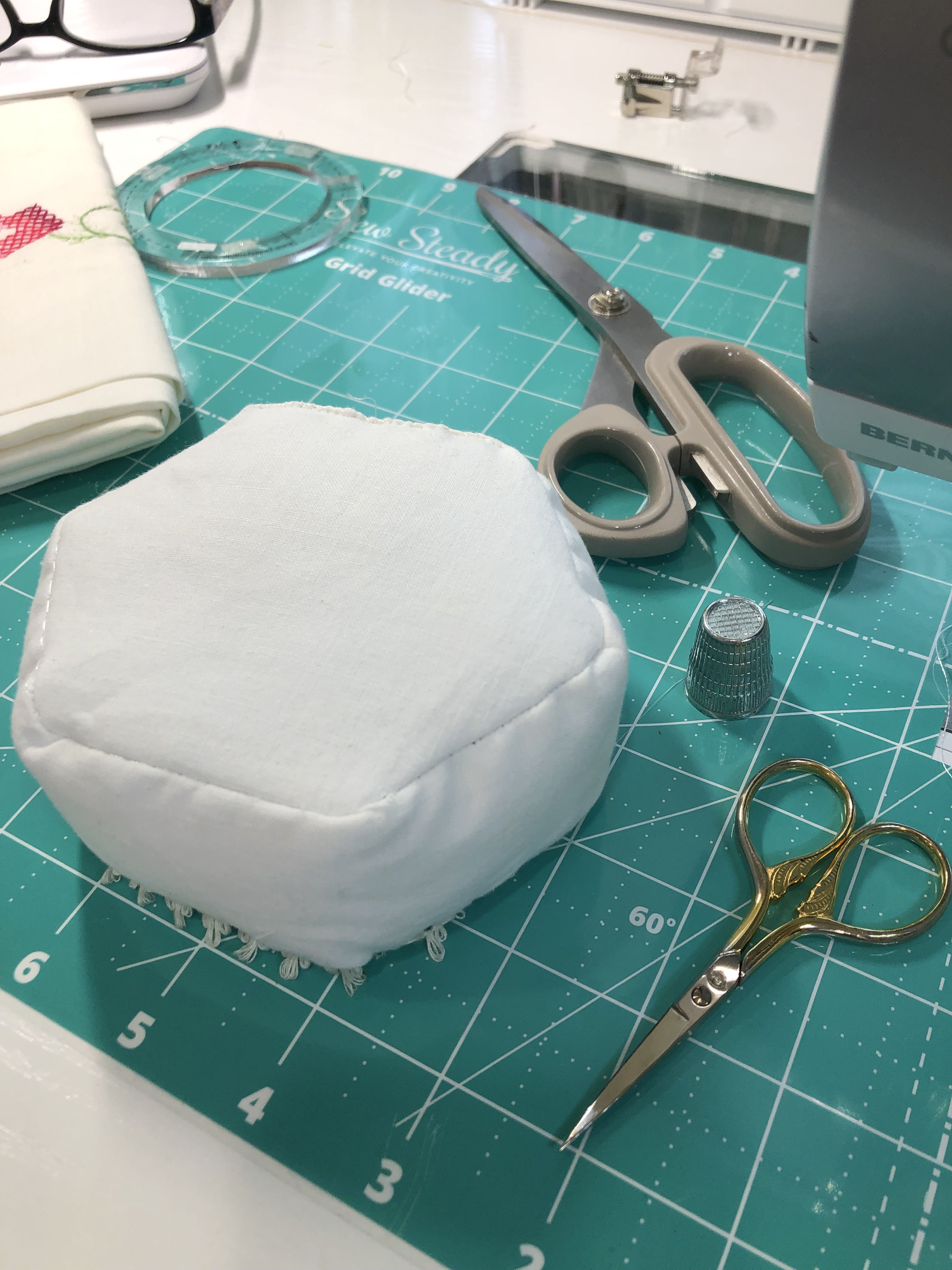 The backing fabric is cut 5/8″ larger on all sides. It is folded once to meet the raw edge of the embellished hexagon and the final fold will take it over the edge to the front where it frames the hexagon nicely and is hand stitched in place.