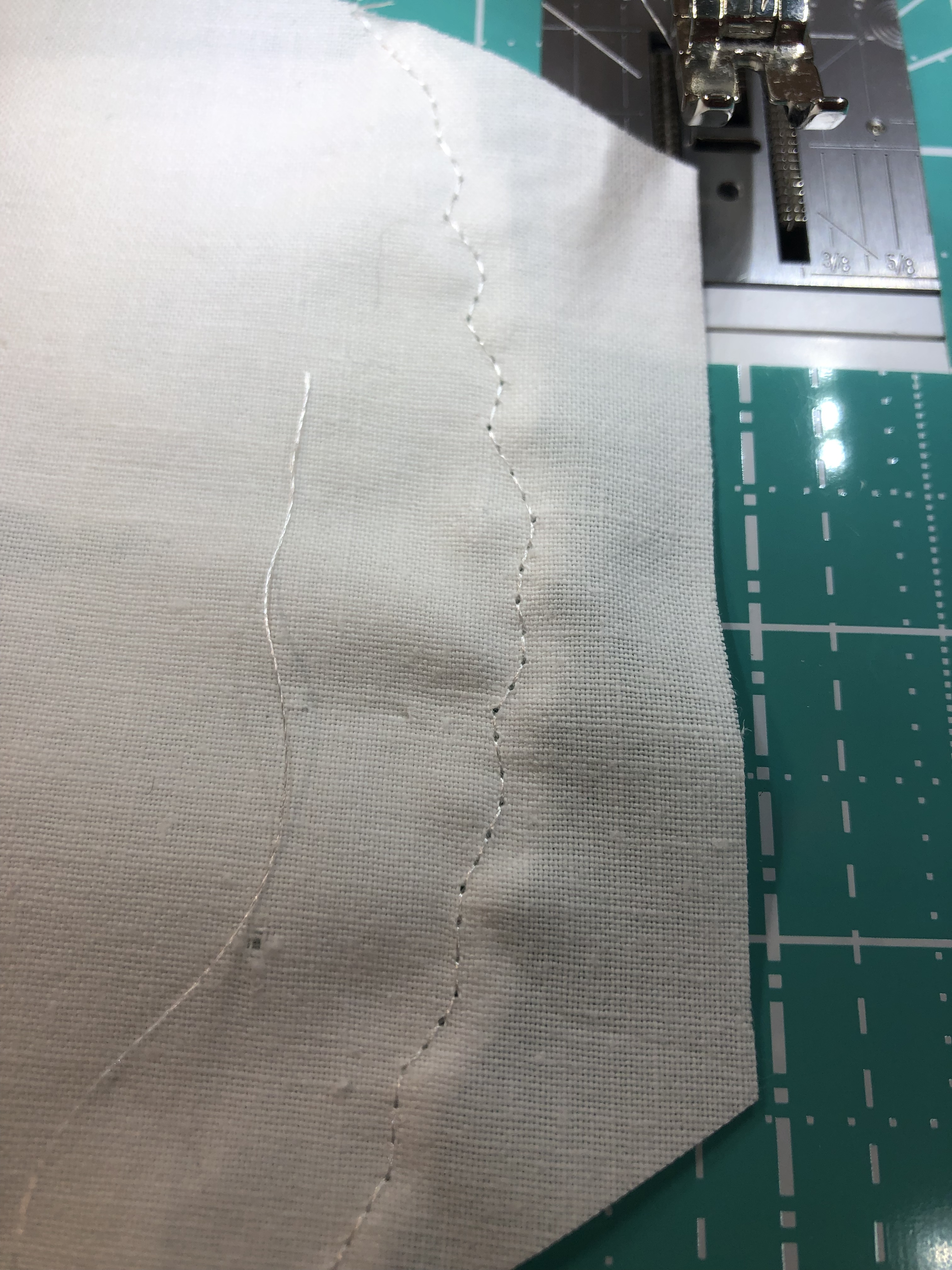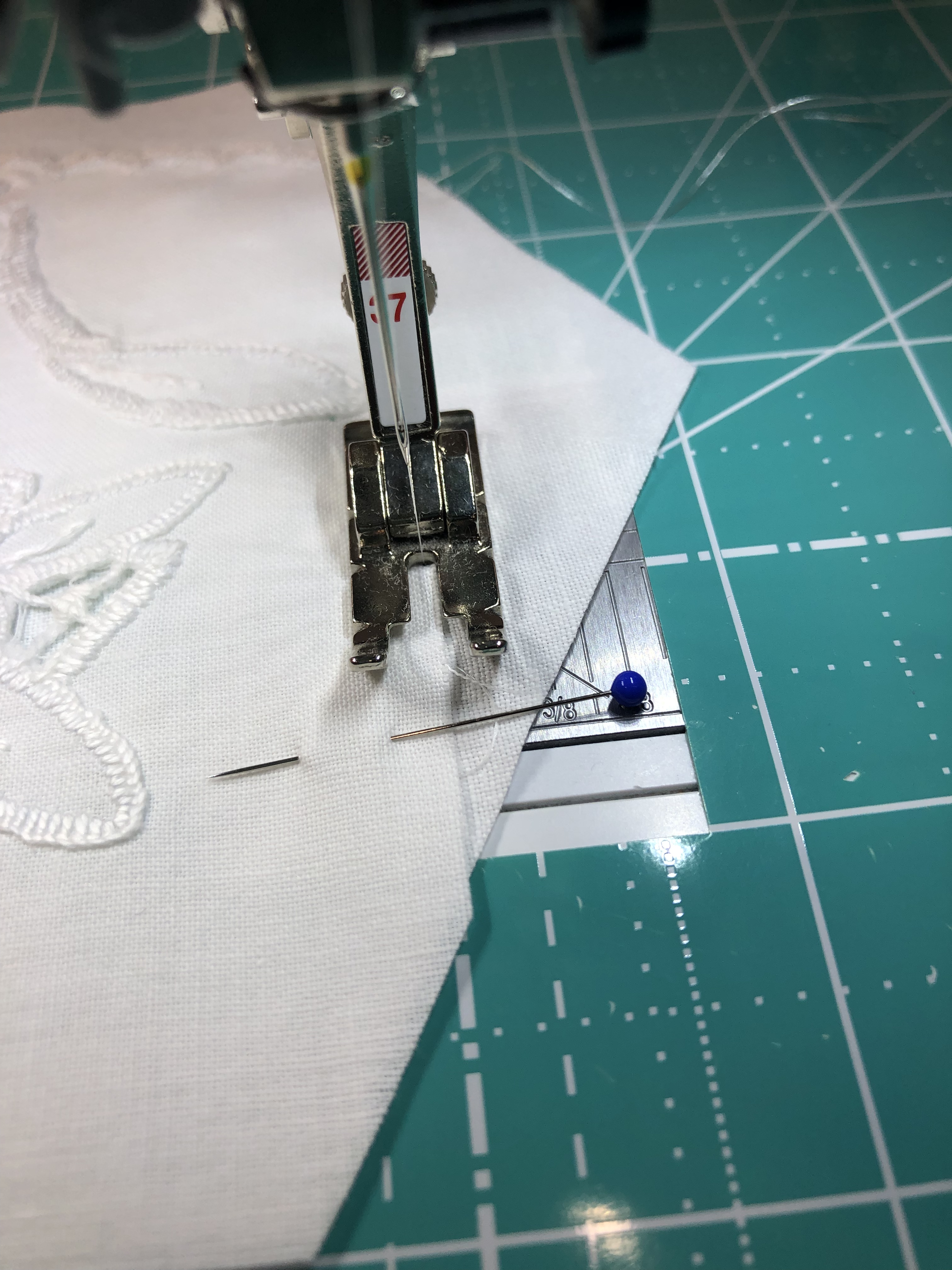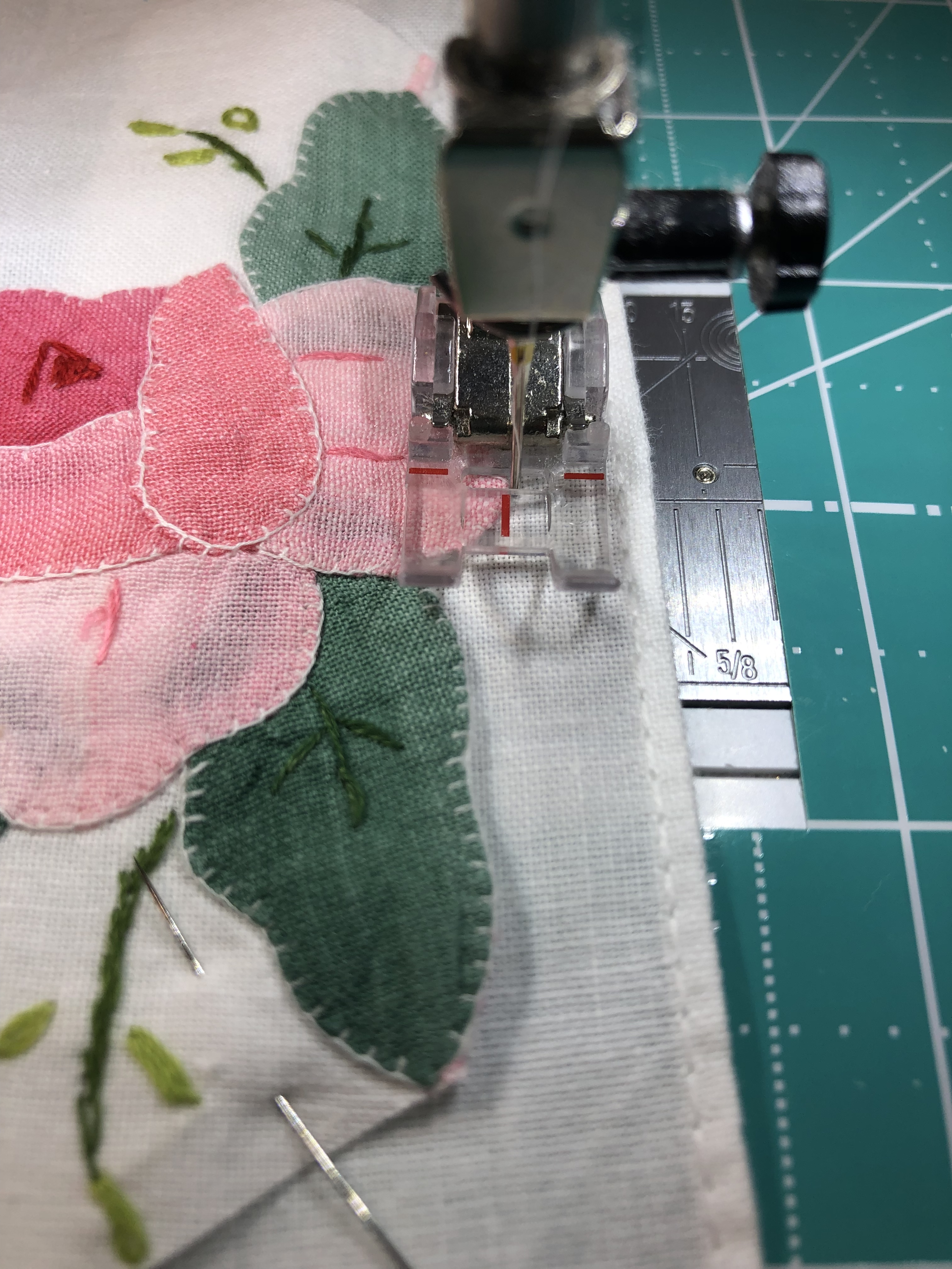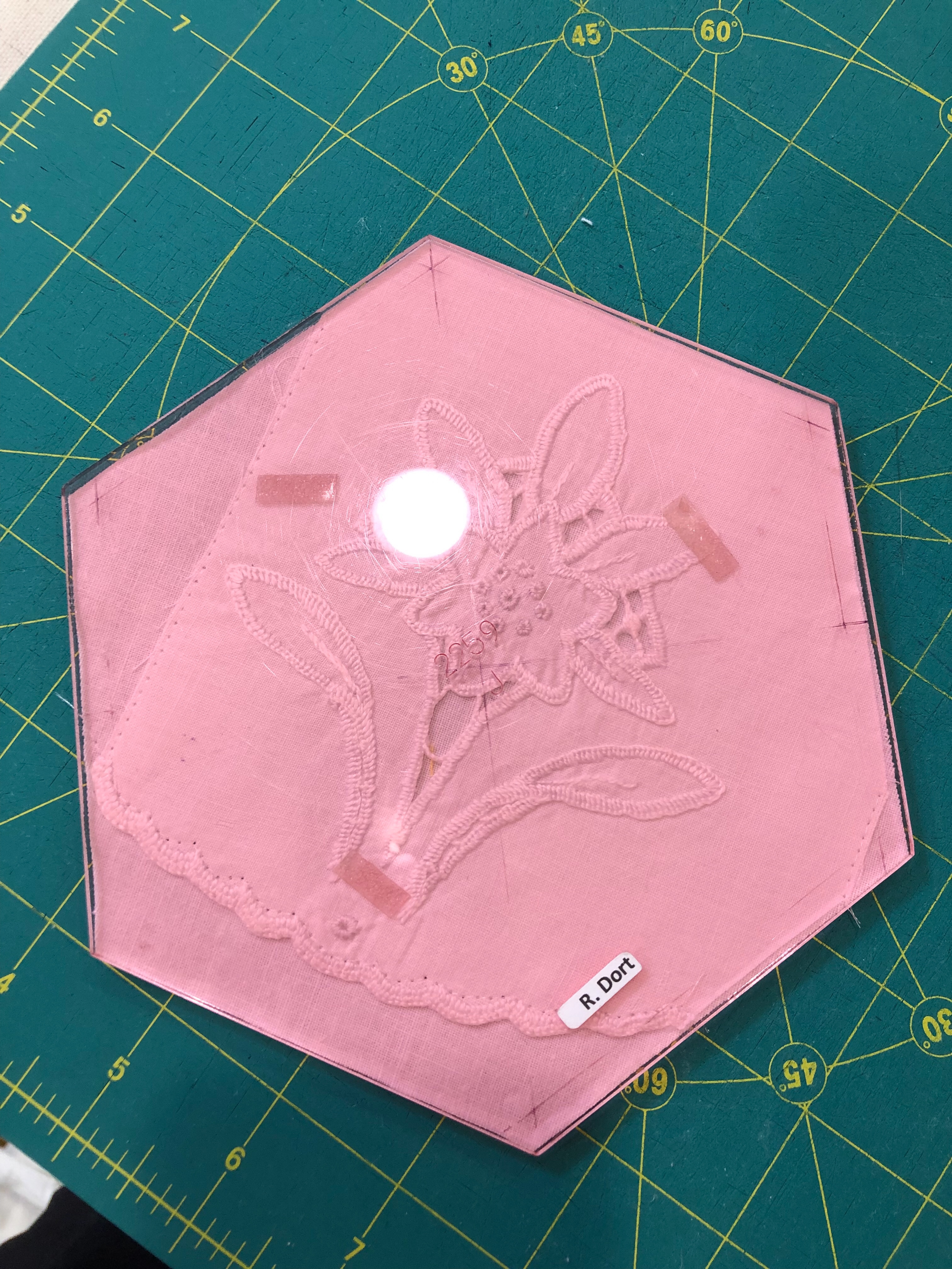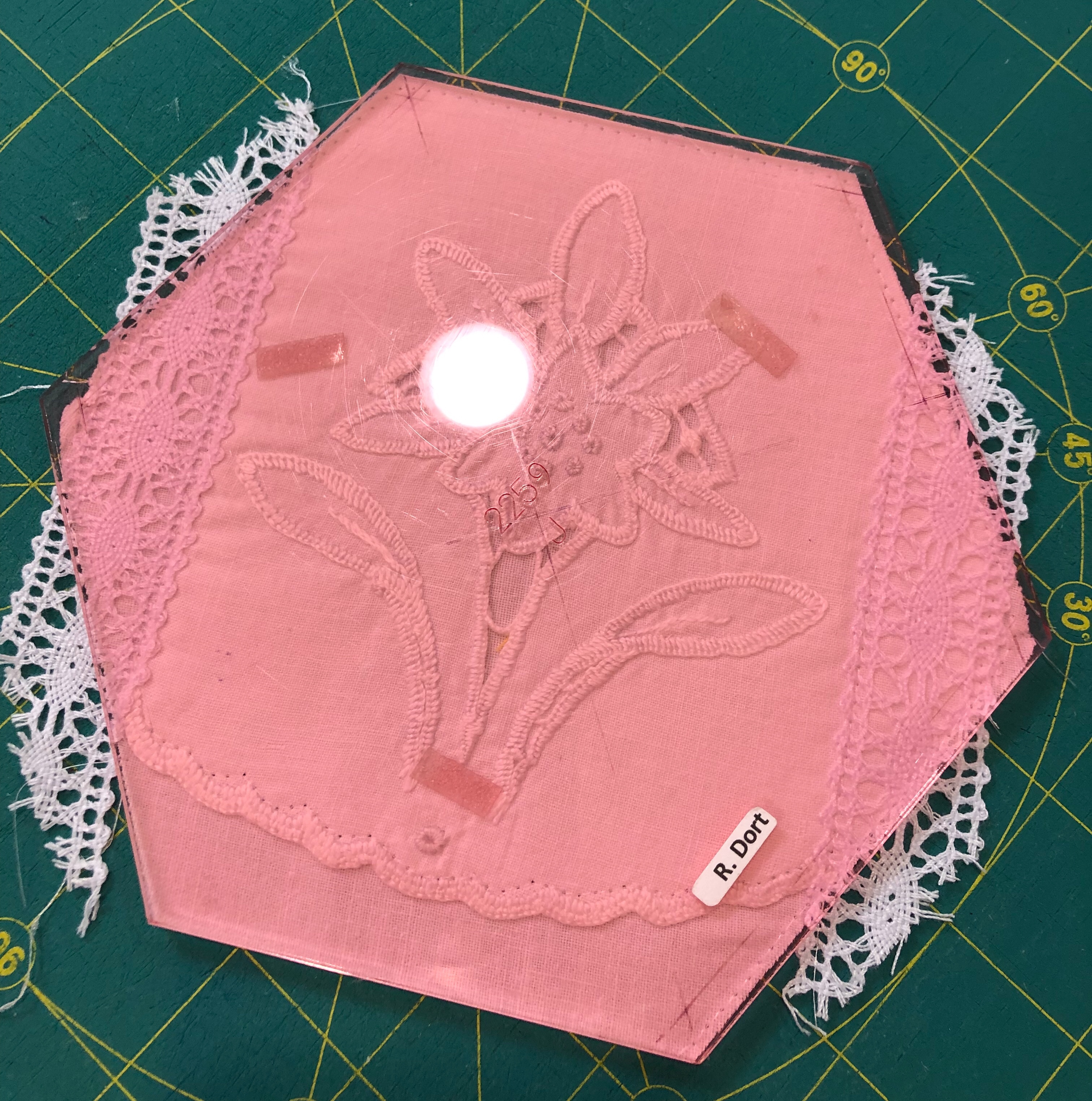 The backing fabric is cut 5/8″ larger on all sides. It is folded once to meet the raw edge of the embellished hexagon and the final fold will take it over the edge to the front where it frames the hexagon nicely and is hand stitched in place.