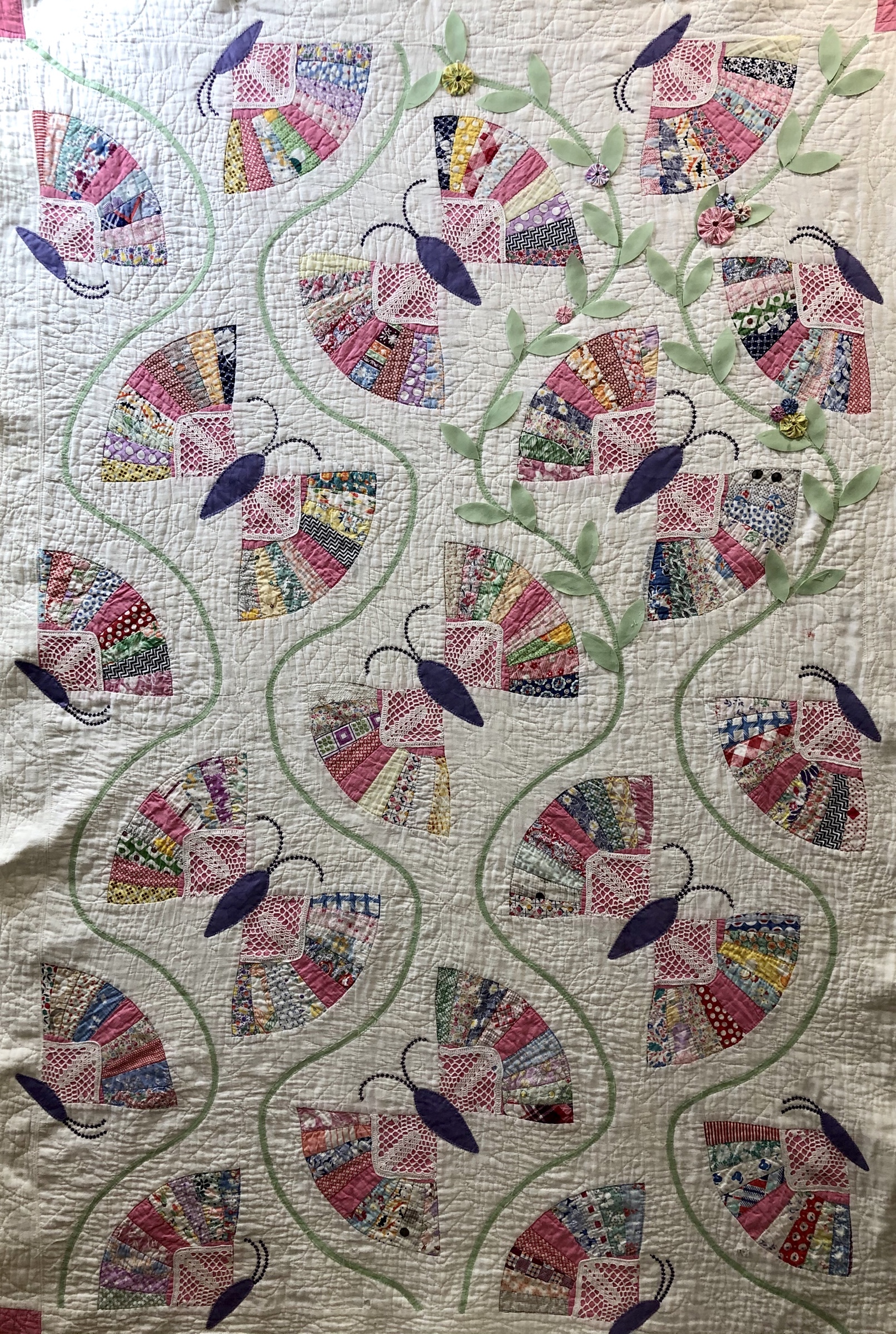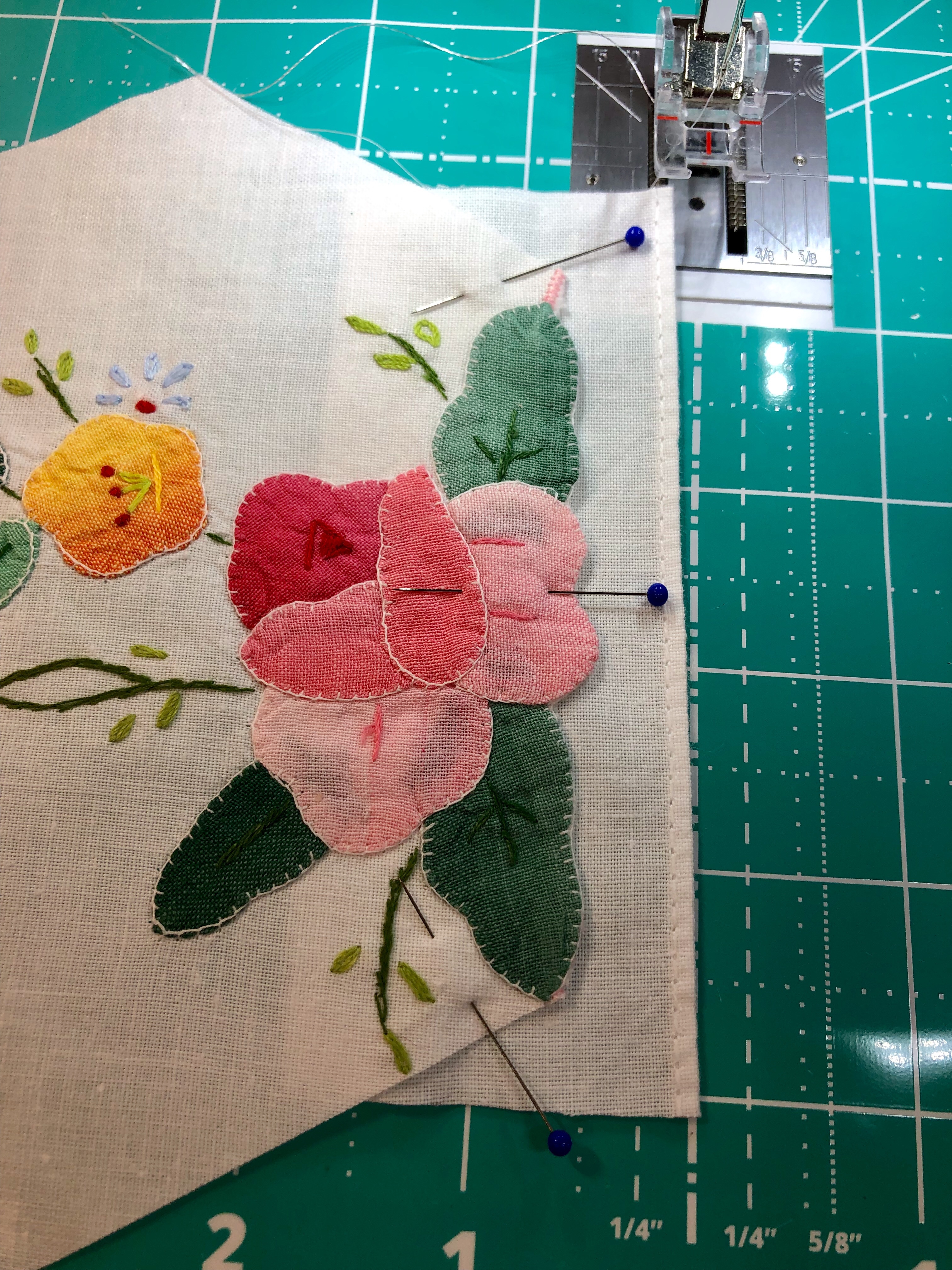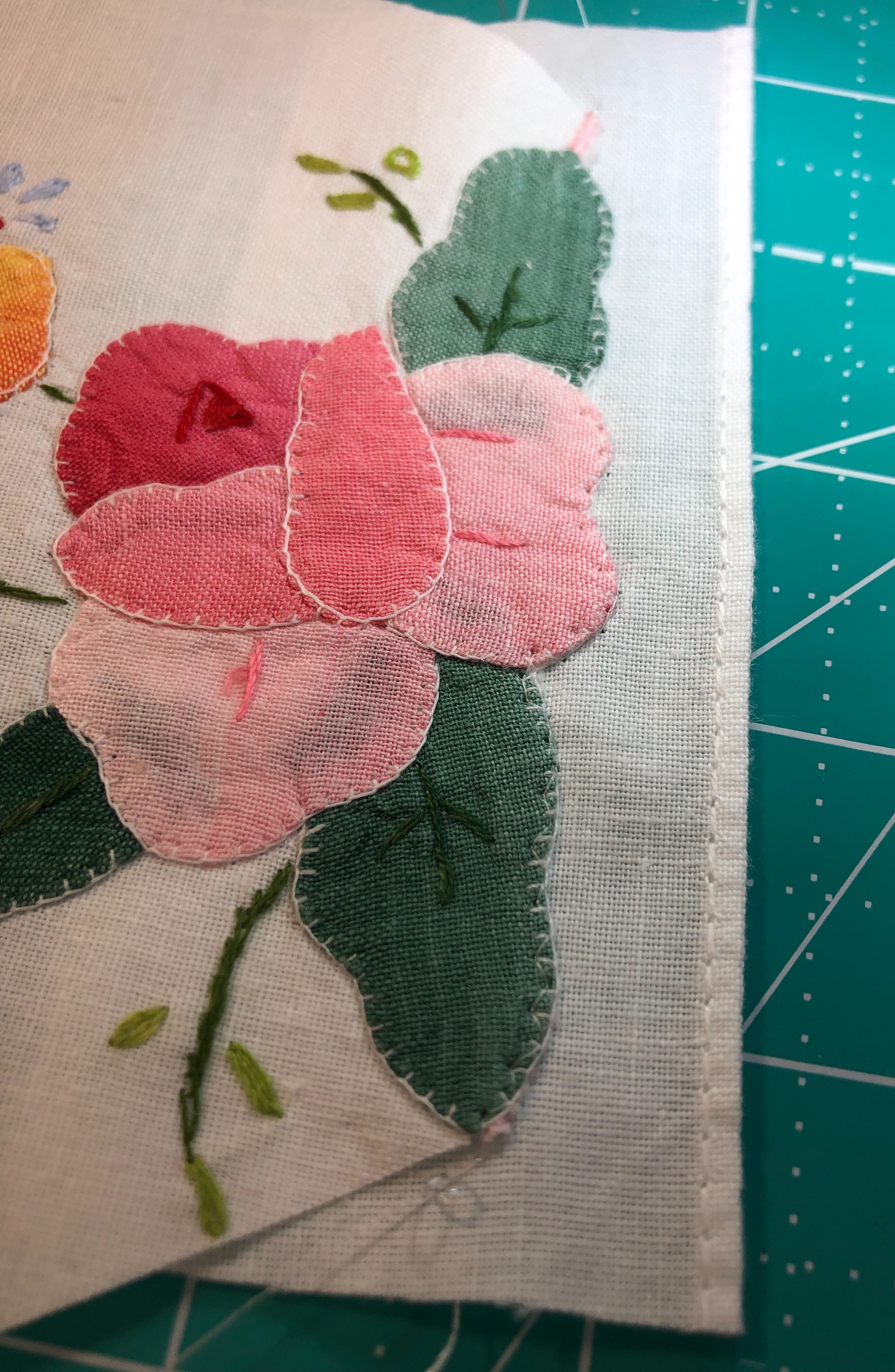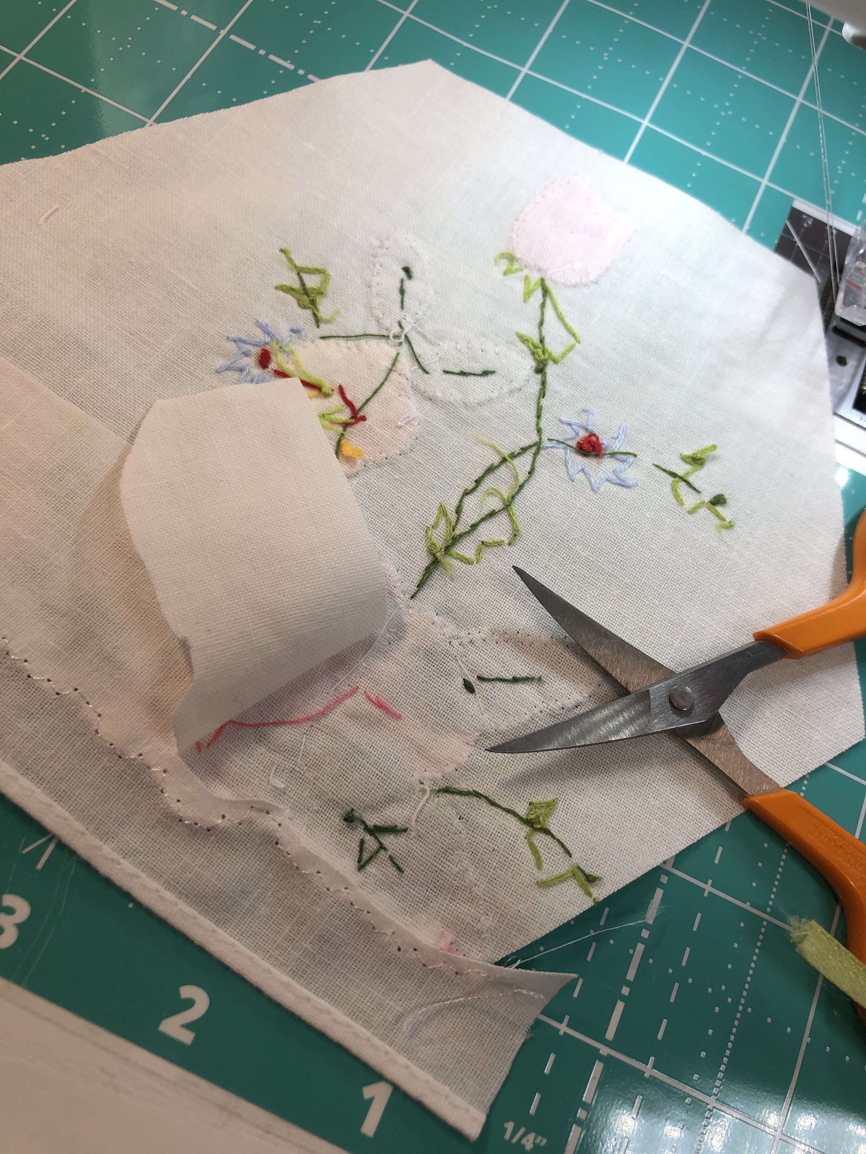 I added lots of hand embroidery to this piece. I used a strong pink to couch the dark blue lines of embroidery, added the yellow wheat looking sprays, learned how to do a bullion stitch (never again…..) added the spring green leaves and the yellow french knots to the flower centers. See all the other embroidery? I did that too. This piece needed a lot!