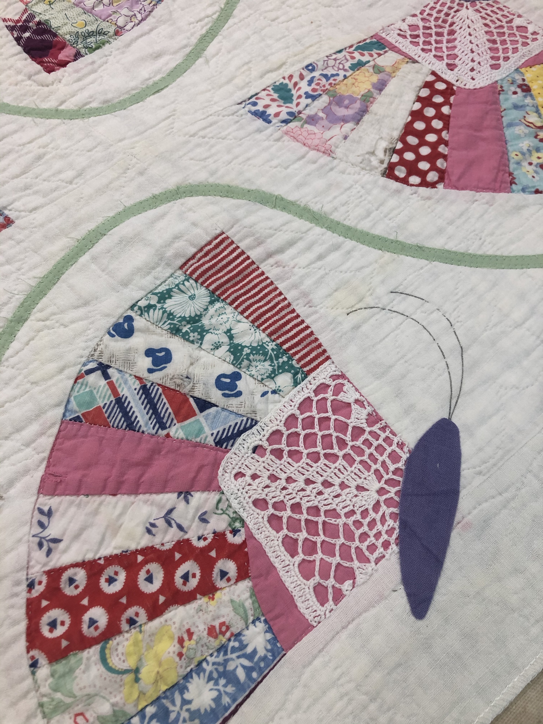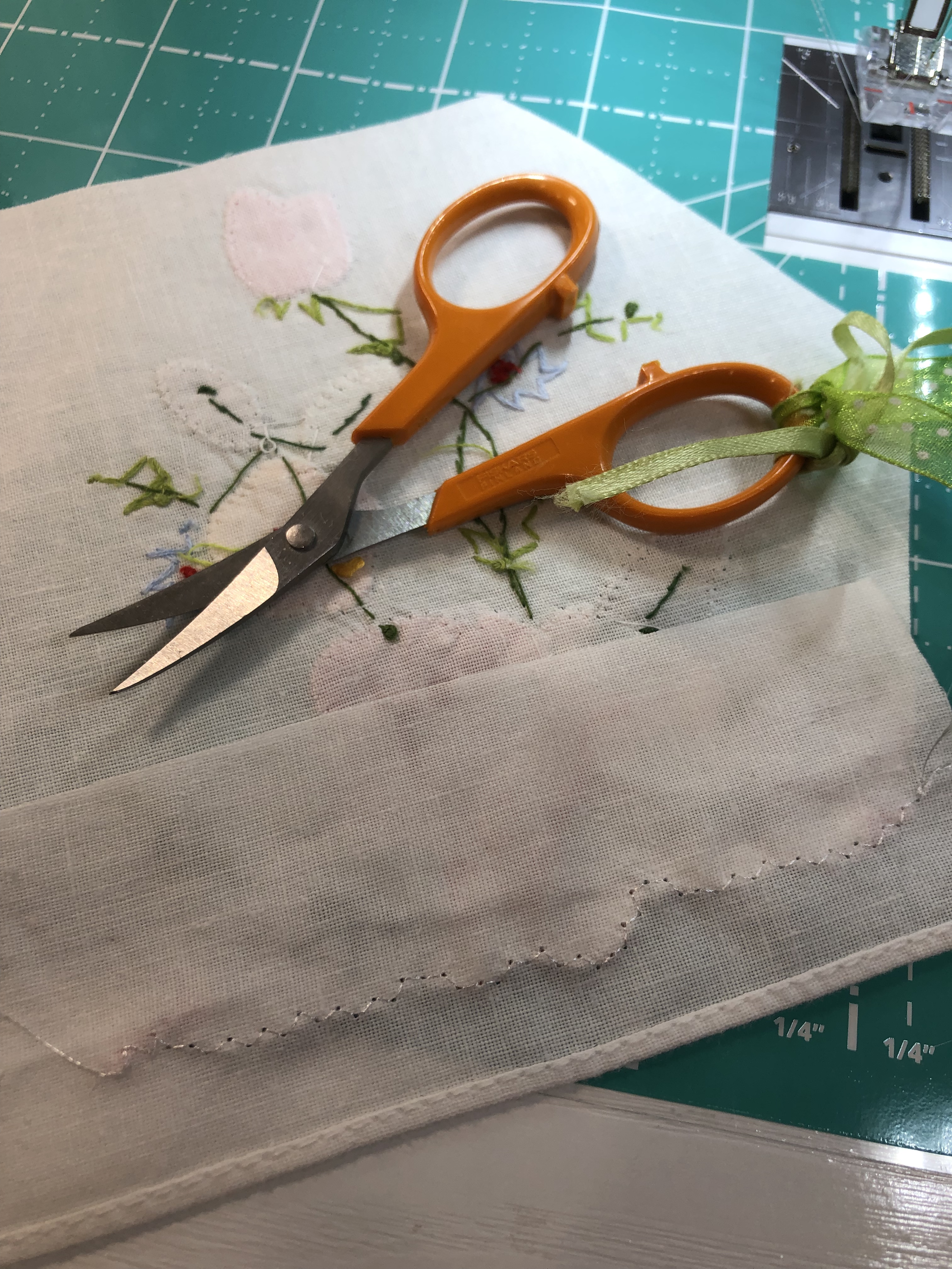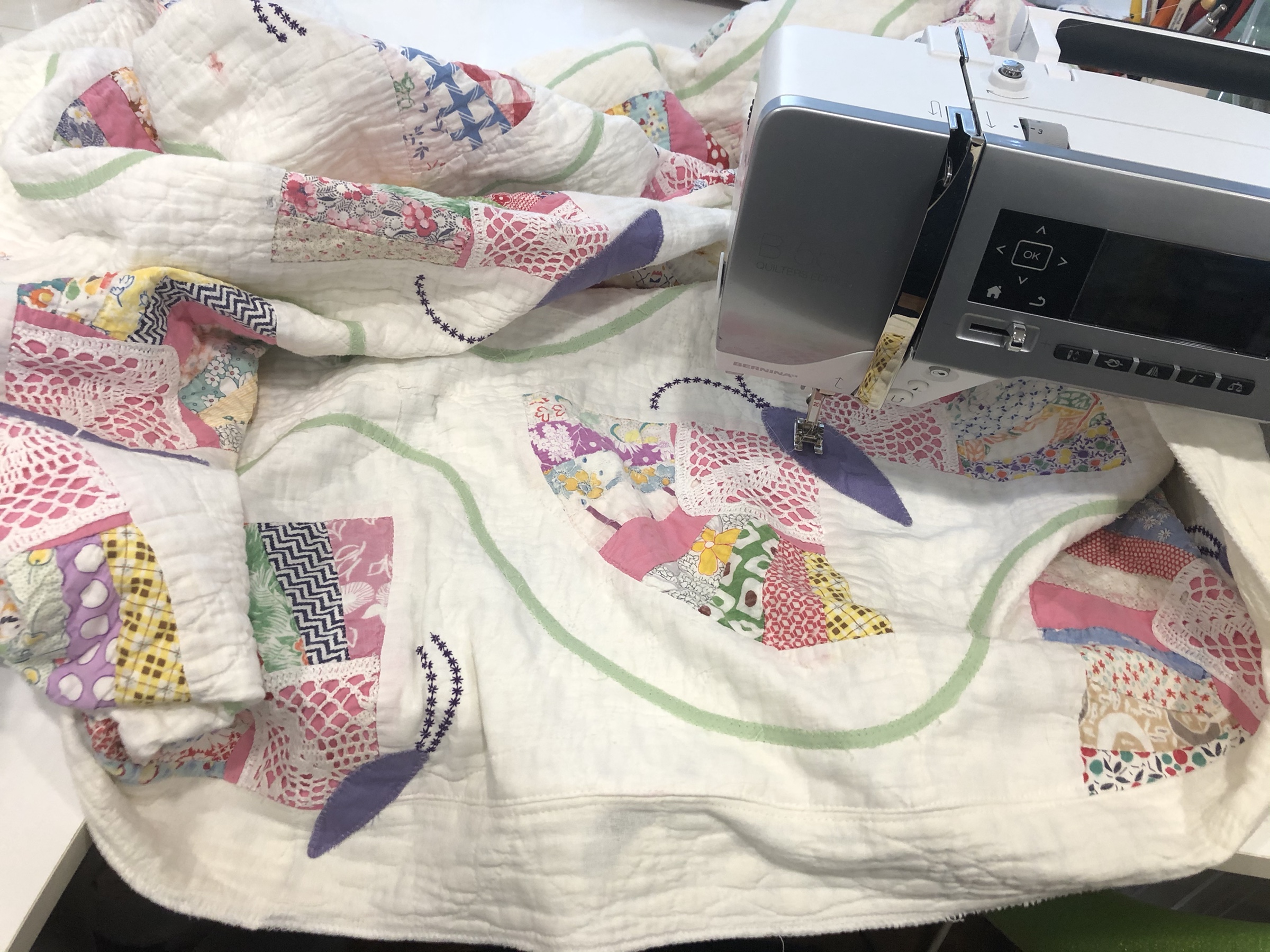 Battenburg lace, white wedding handkerchiefs, commercial new and vintage white trims provided a wonderful base to be embellished with beautiful spring green satin ribbon, new silk roses, tiny glass lavender/green and white flowers. The tiniest little multi color flowers with the size 15 Ceylon white beads are sequins!