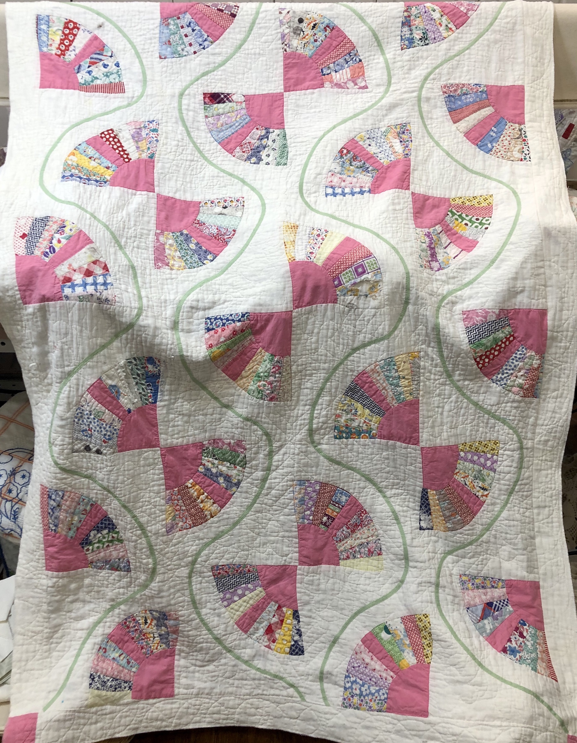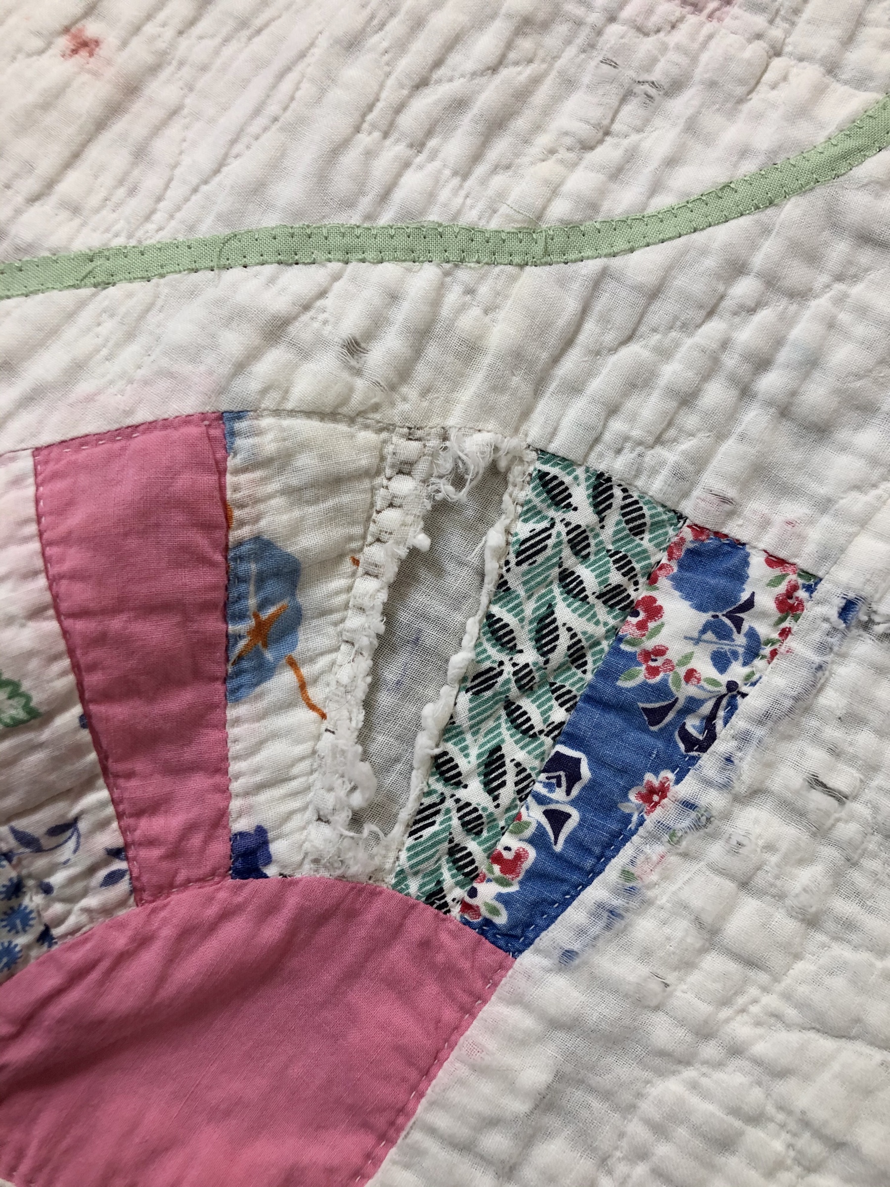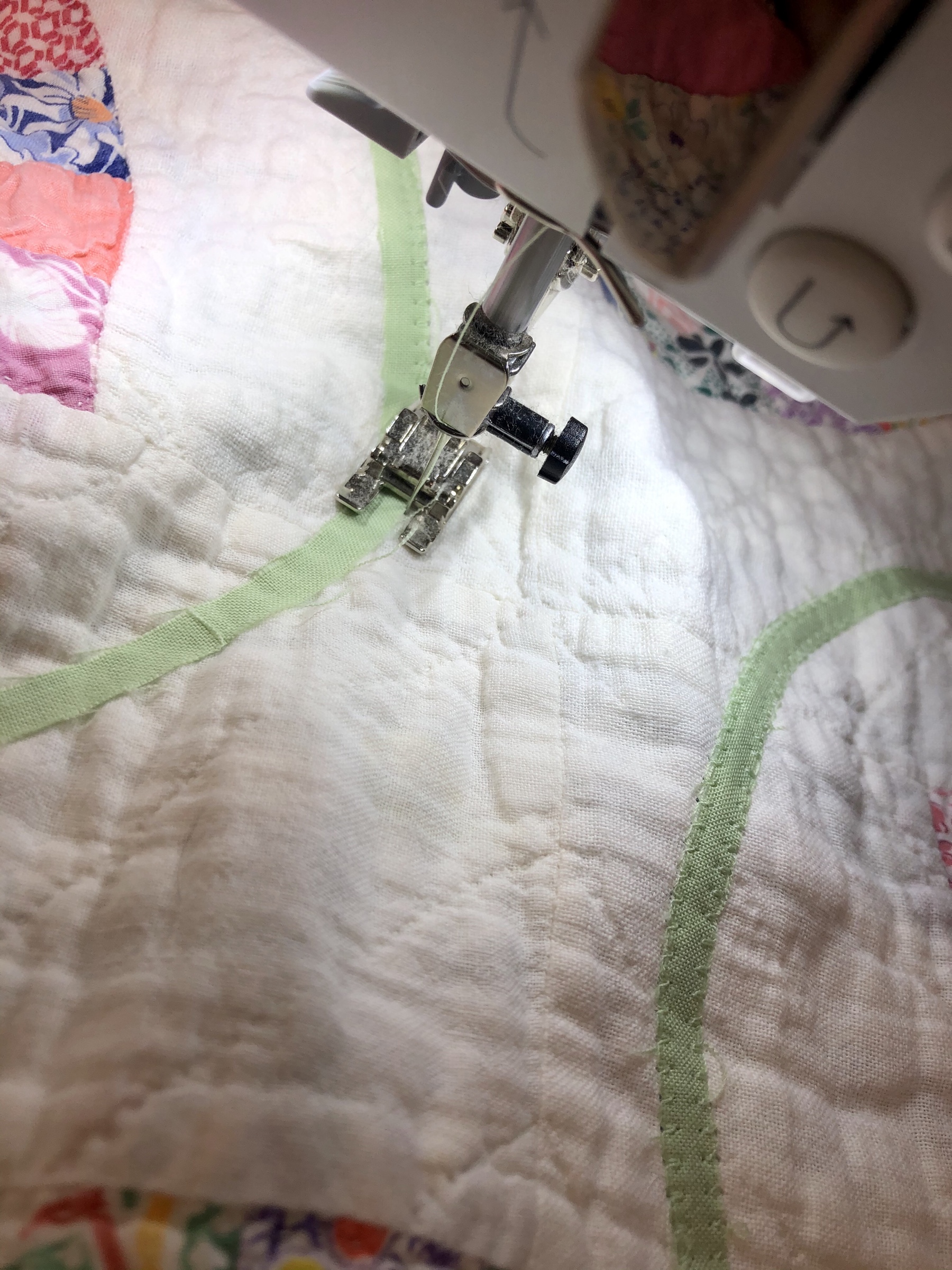 Battenburg lace, white wedding handkerchiefs, commercial new and vintage white trims provided a wonderful base to be embellished with beautiful spring green satin ribbon, new silk roses, tiny glass lavender/green and white flowers. The tiniest little multi color flowers with the size 15 Ceylon white beads are sequins!