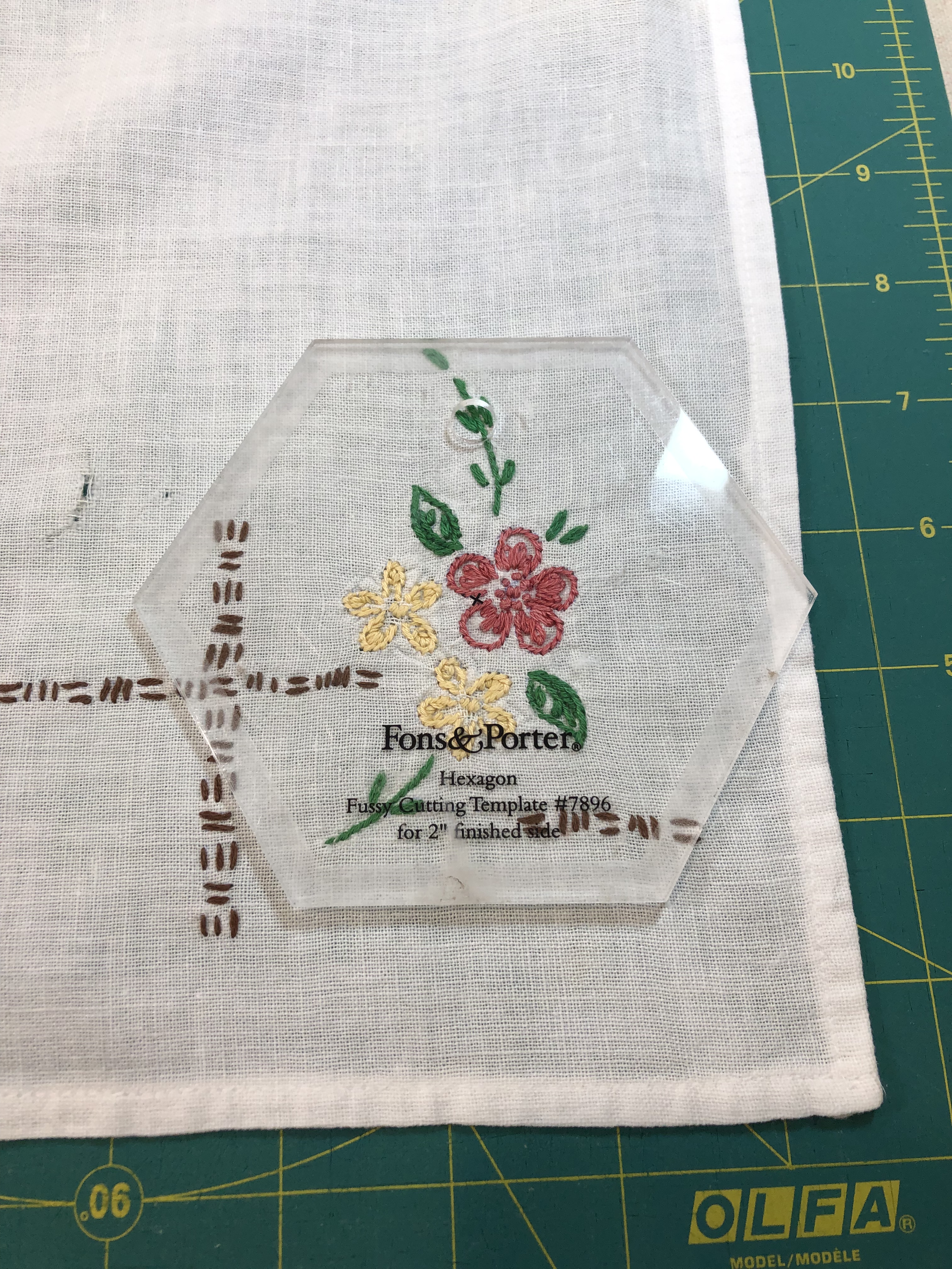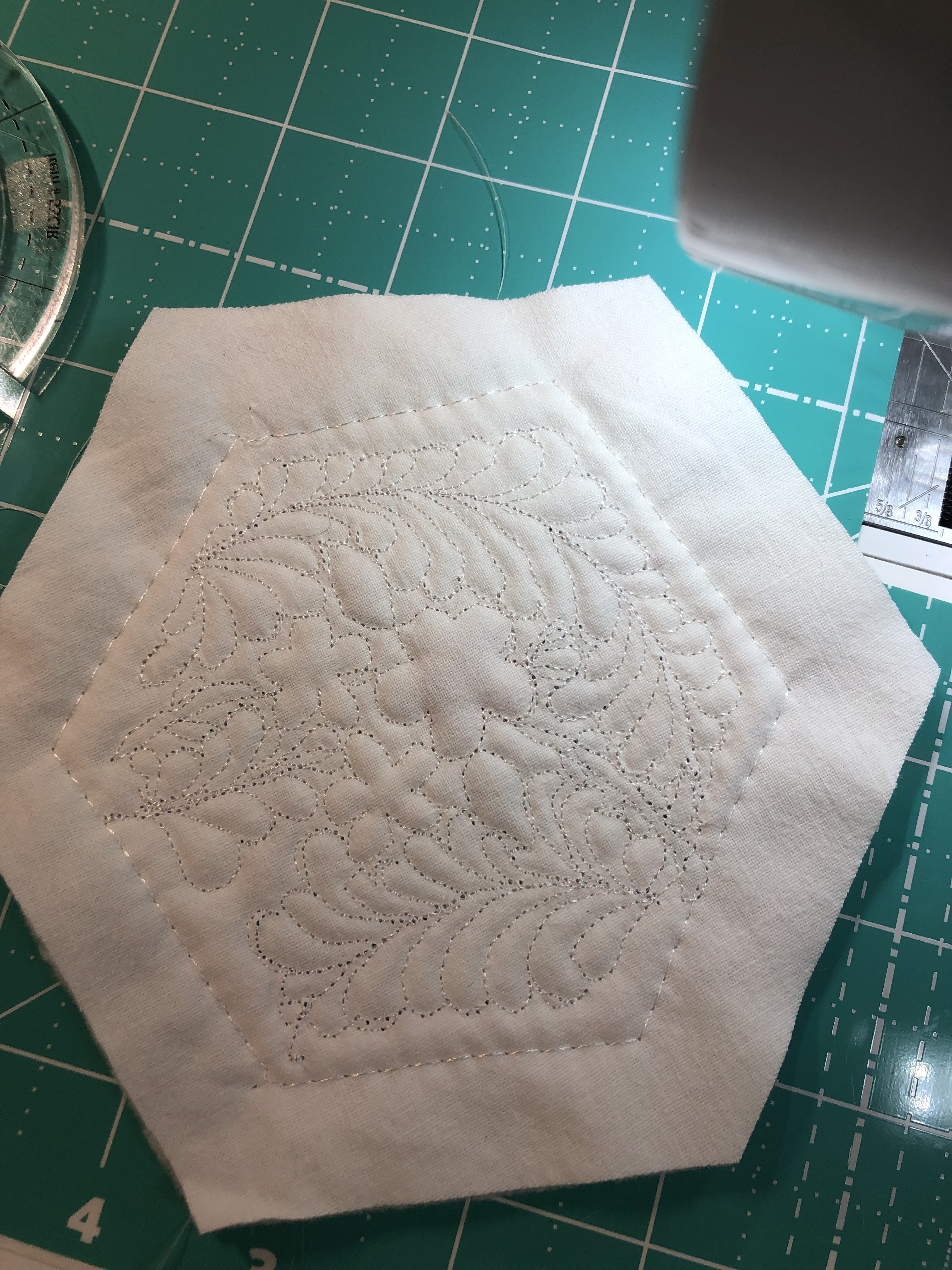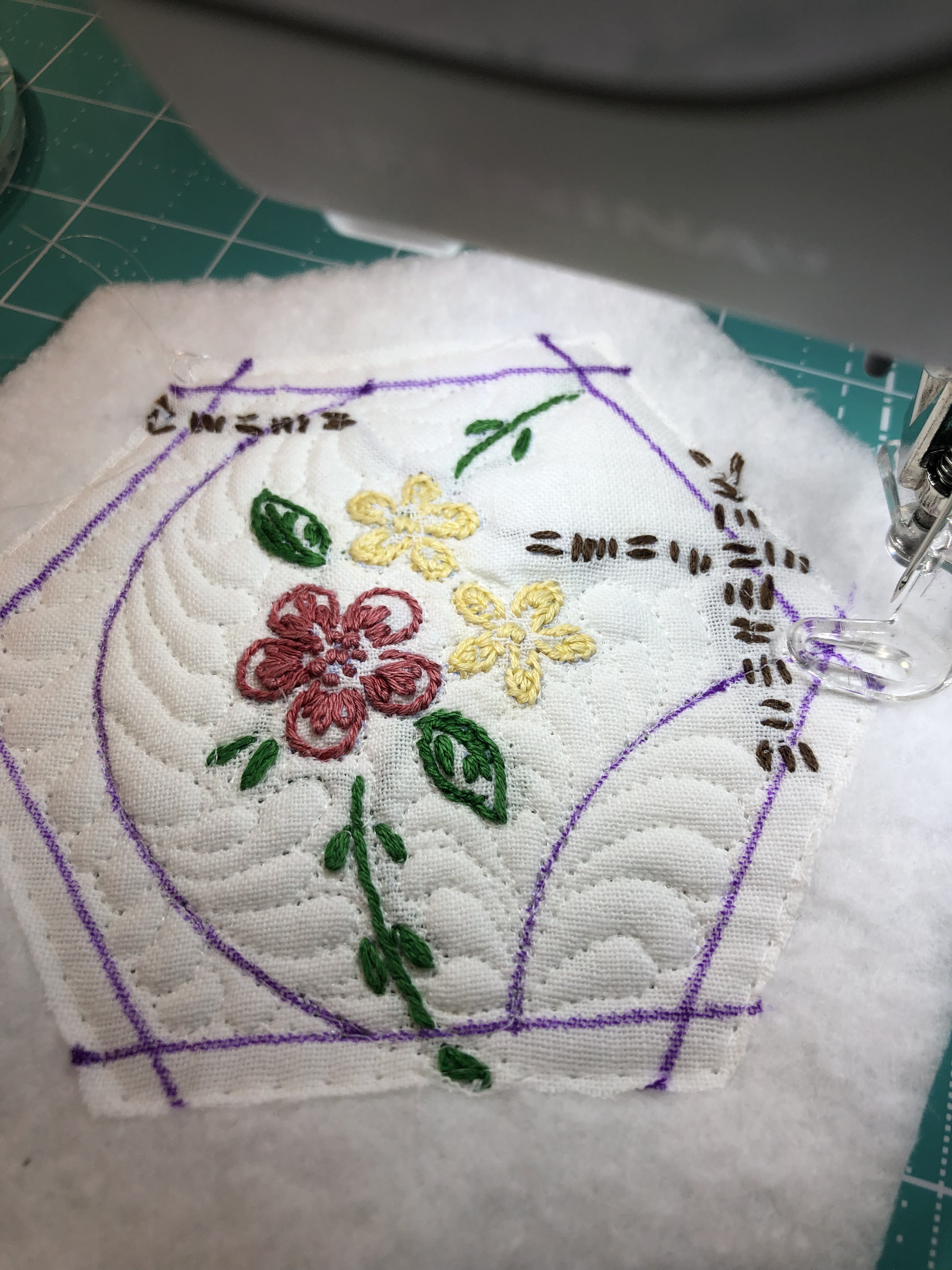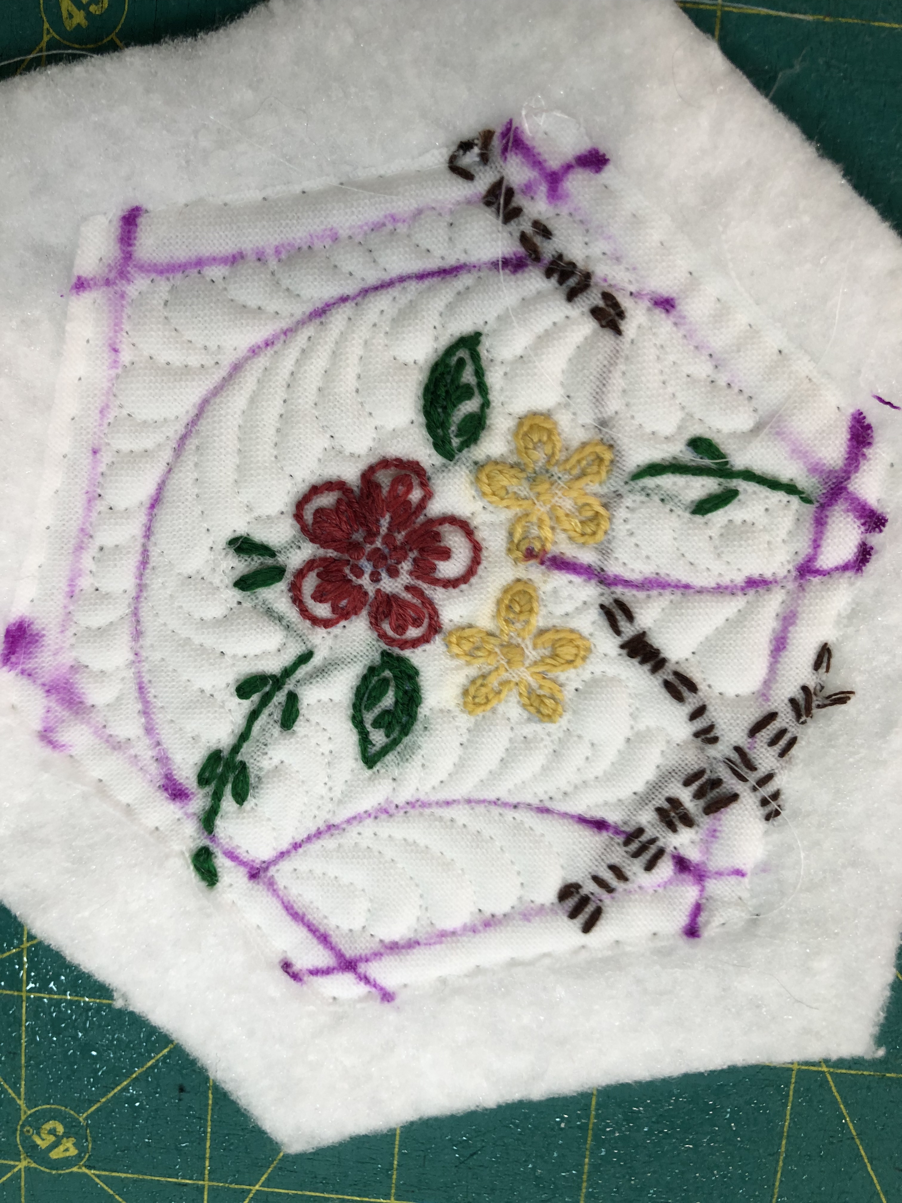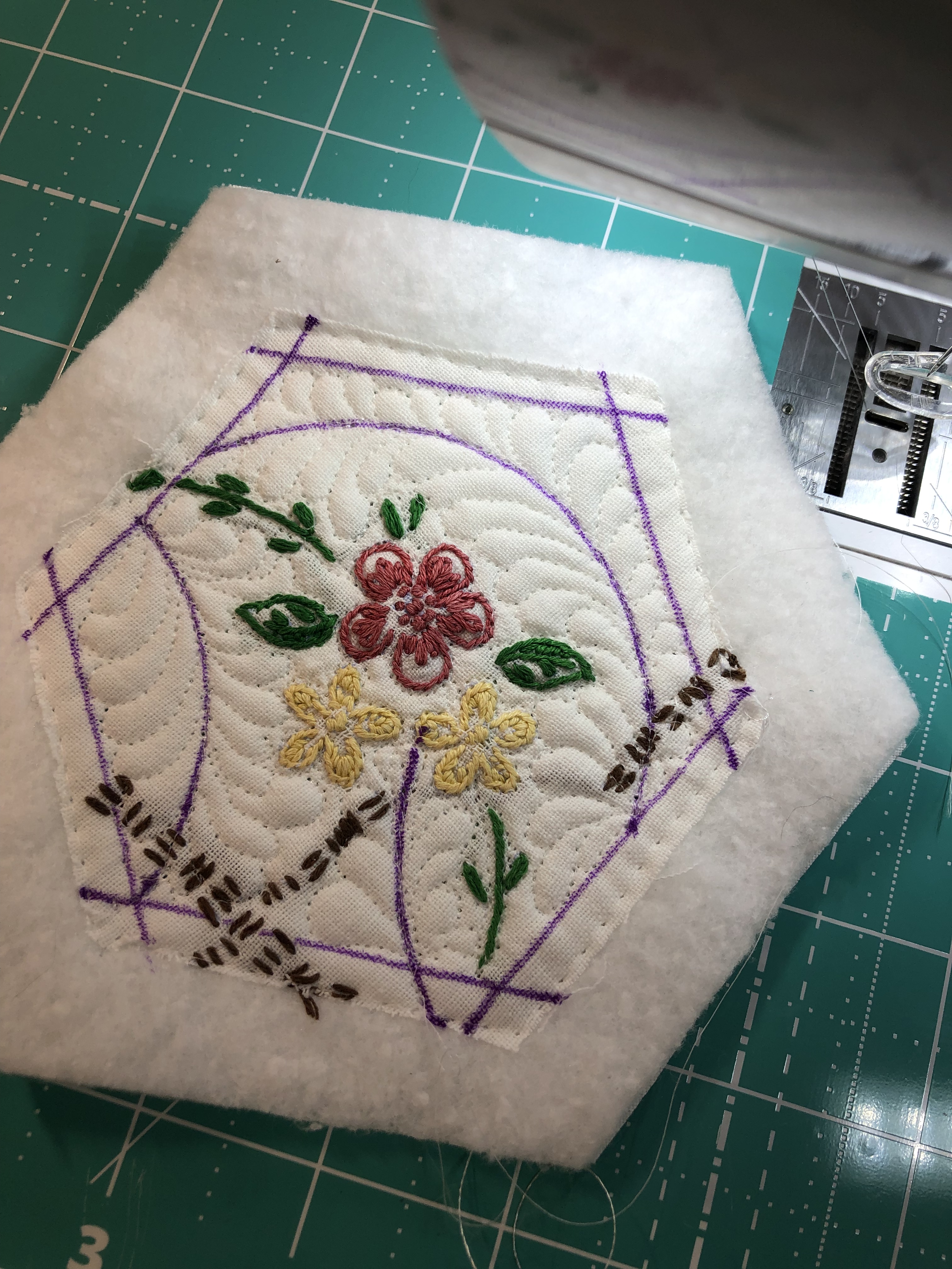 While this hexagon is not part of this particular quilt, its a good exploded example to show you the 5 layers to each of the 46 pieces. 1. the front to be embellished 2. white cotton muslin 3. white medium weight machine embroidery cut away stabilizer 4. white 50/50 cotton poly quilt batting 5. again, white cotton muslin. Just so we’re all on the same page, please know that the stabilizer is cut away, not tear away and it stays in the hexagon sandwich. As you embellish the front of your hexagon you are stitching through the front, the muslin and the stabilizer.