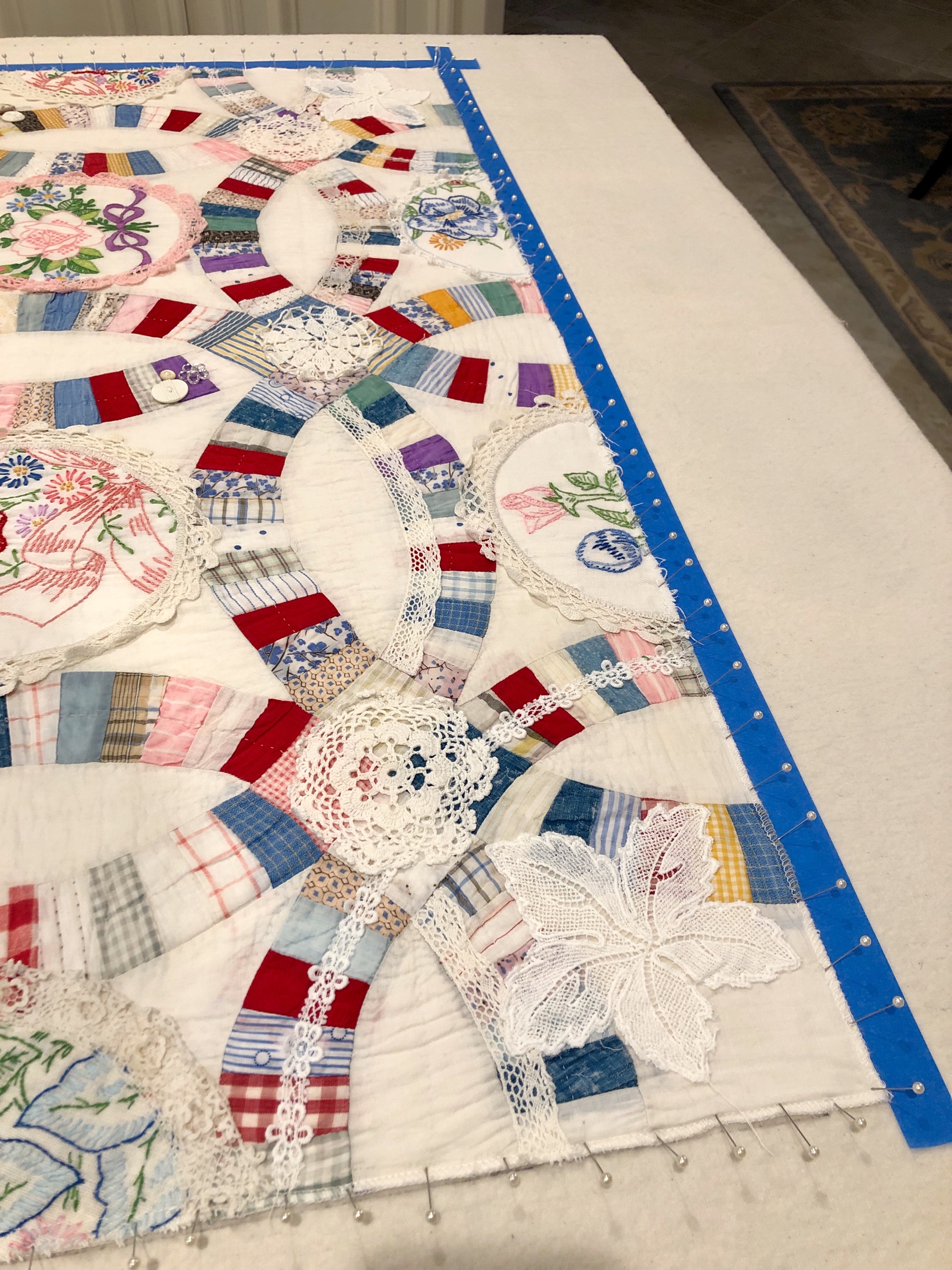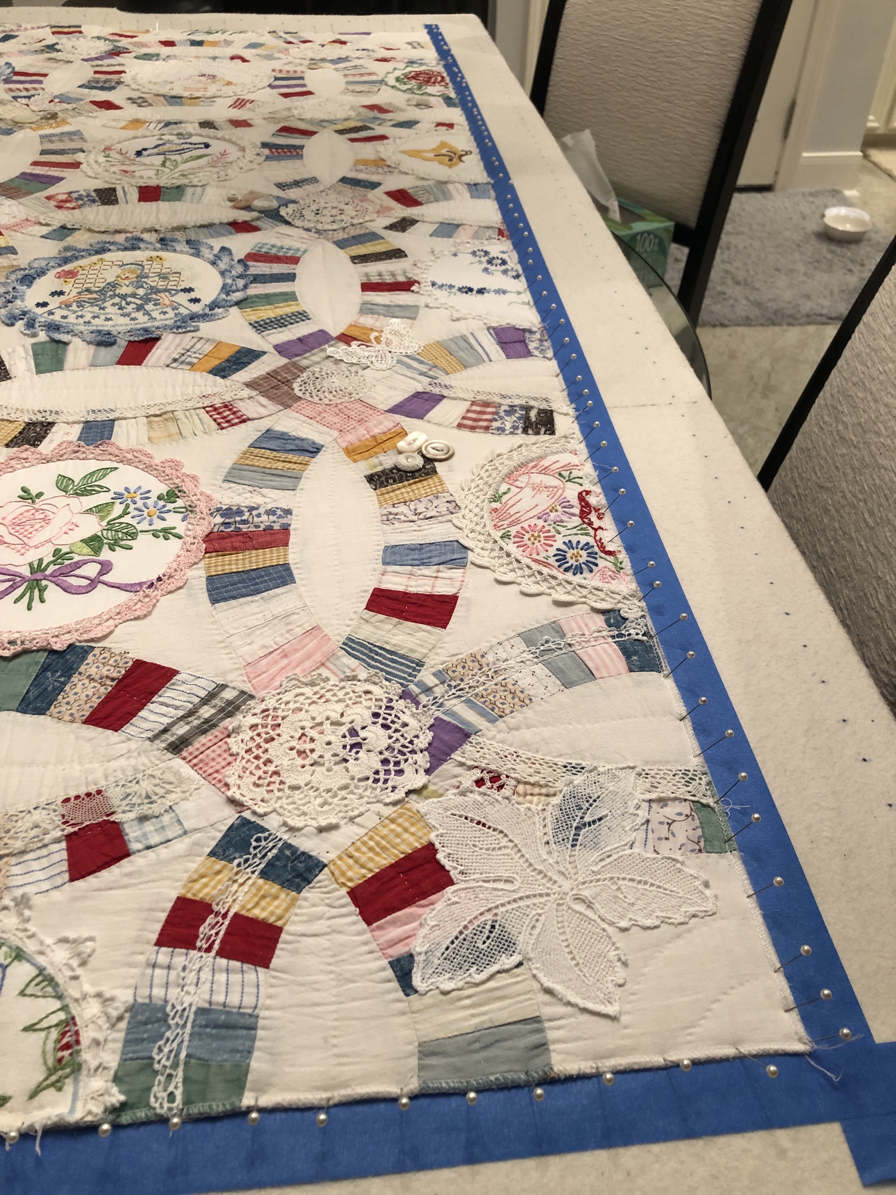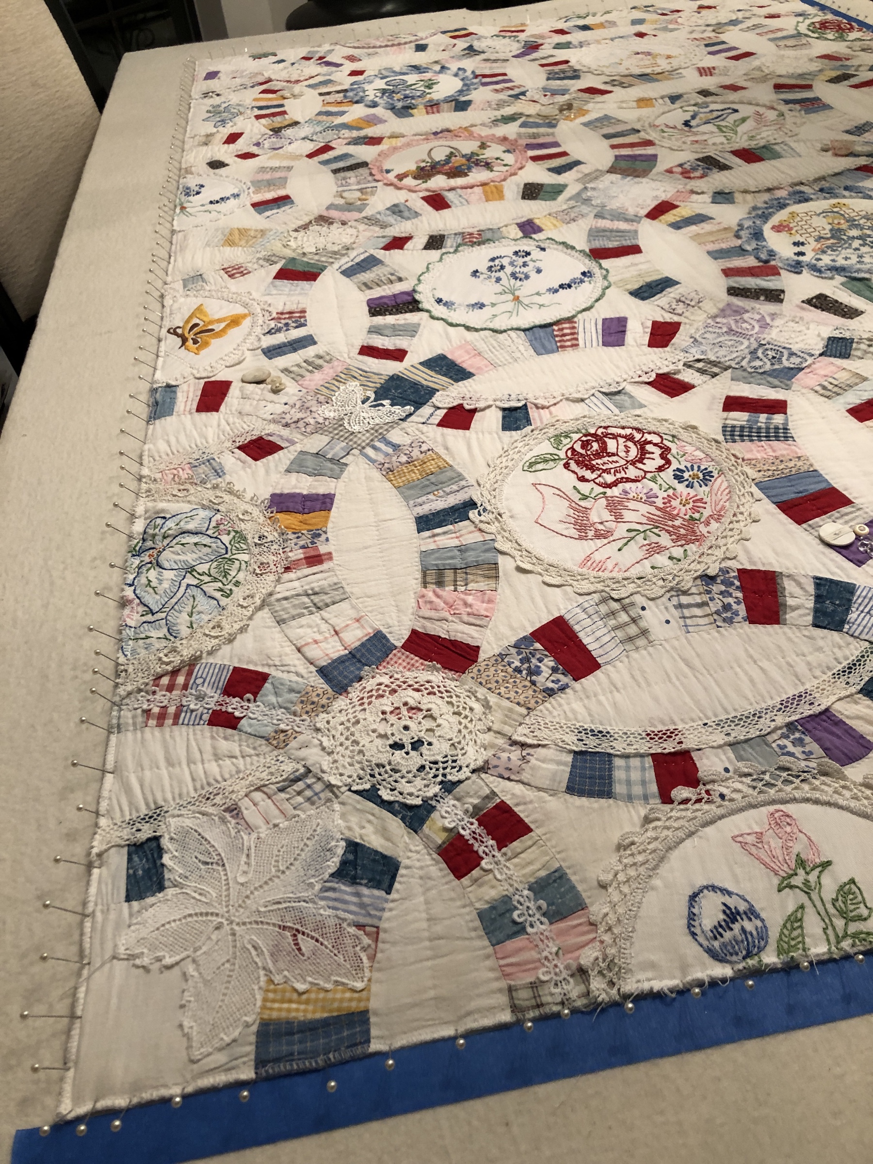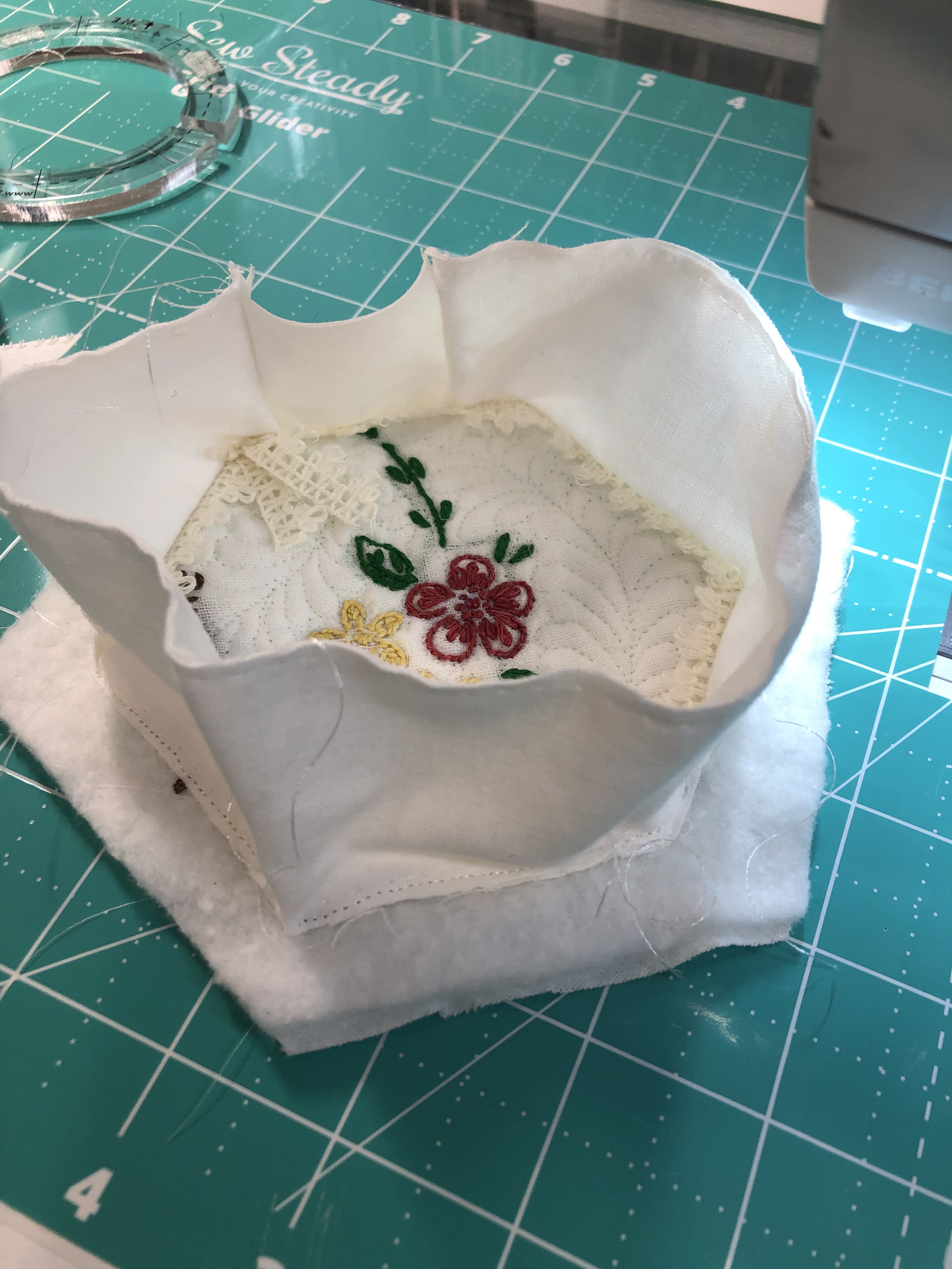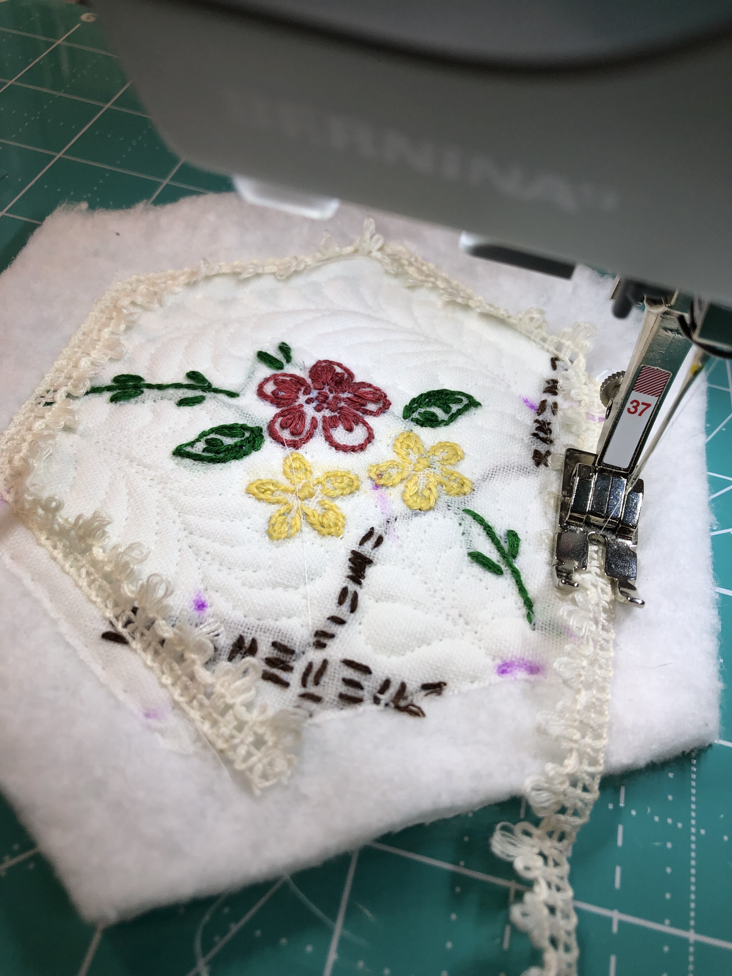 The embellishing is done through the first three layers. Once the final do-dad had been added, a layer of batting and the backing fabric are set in place.