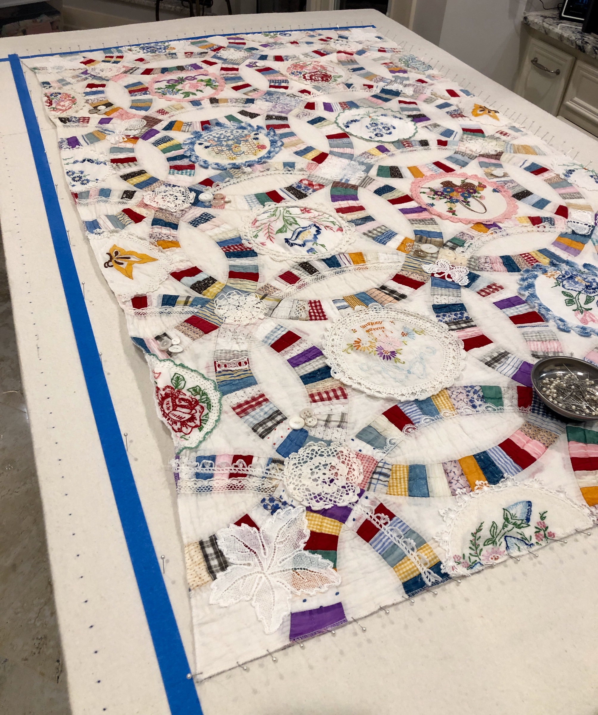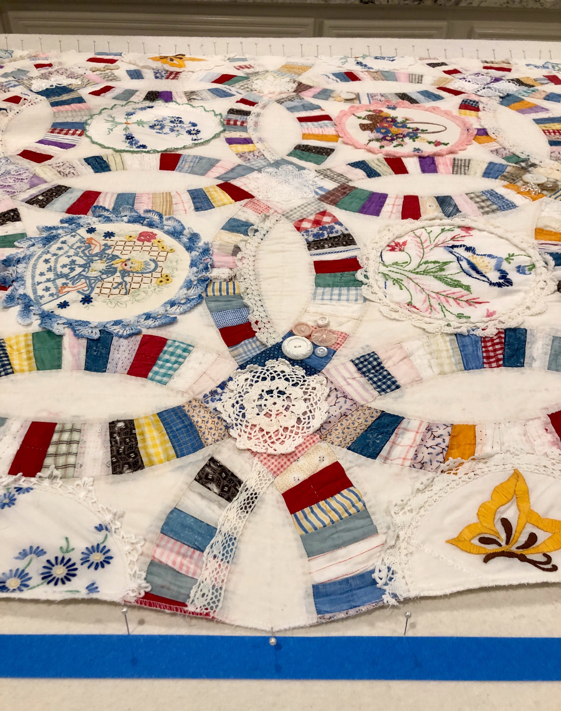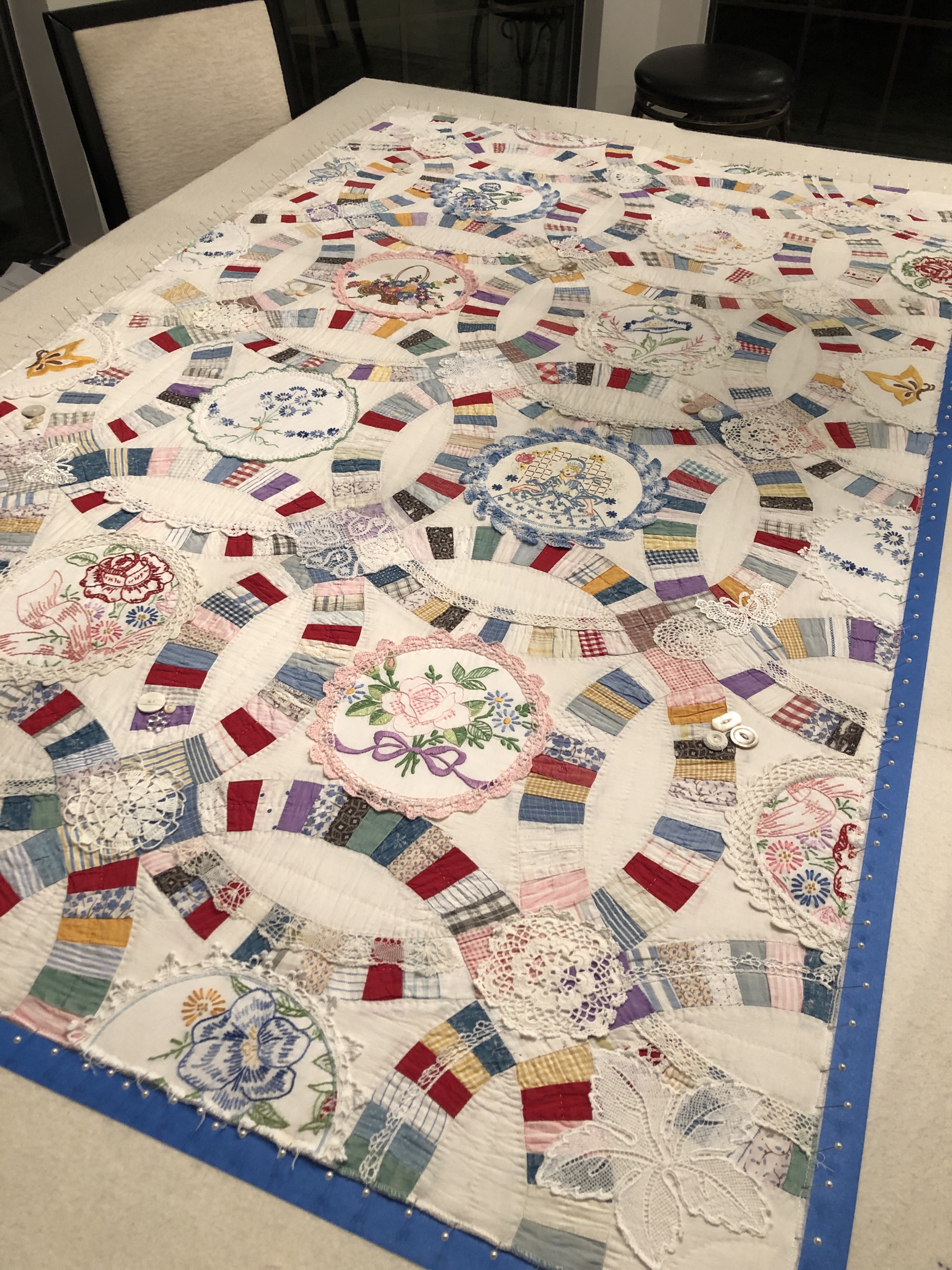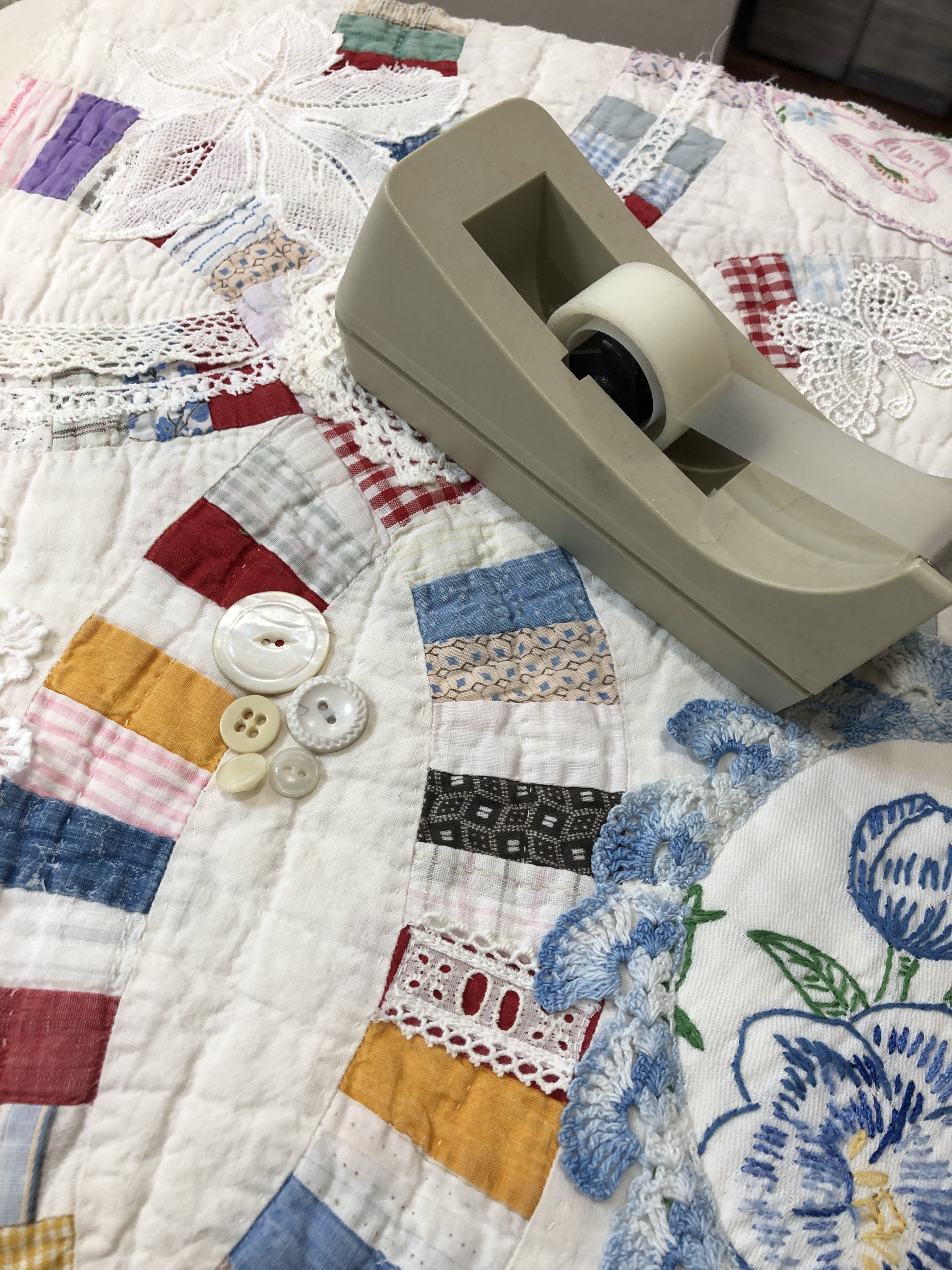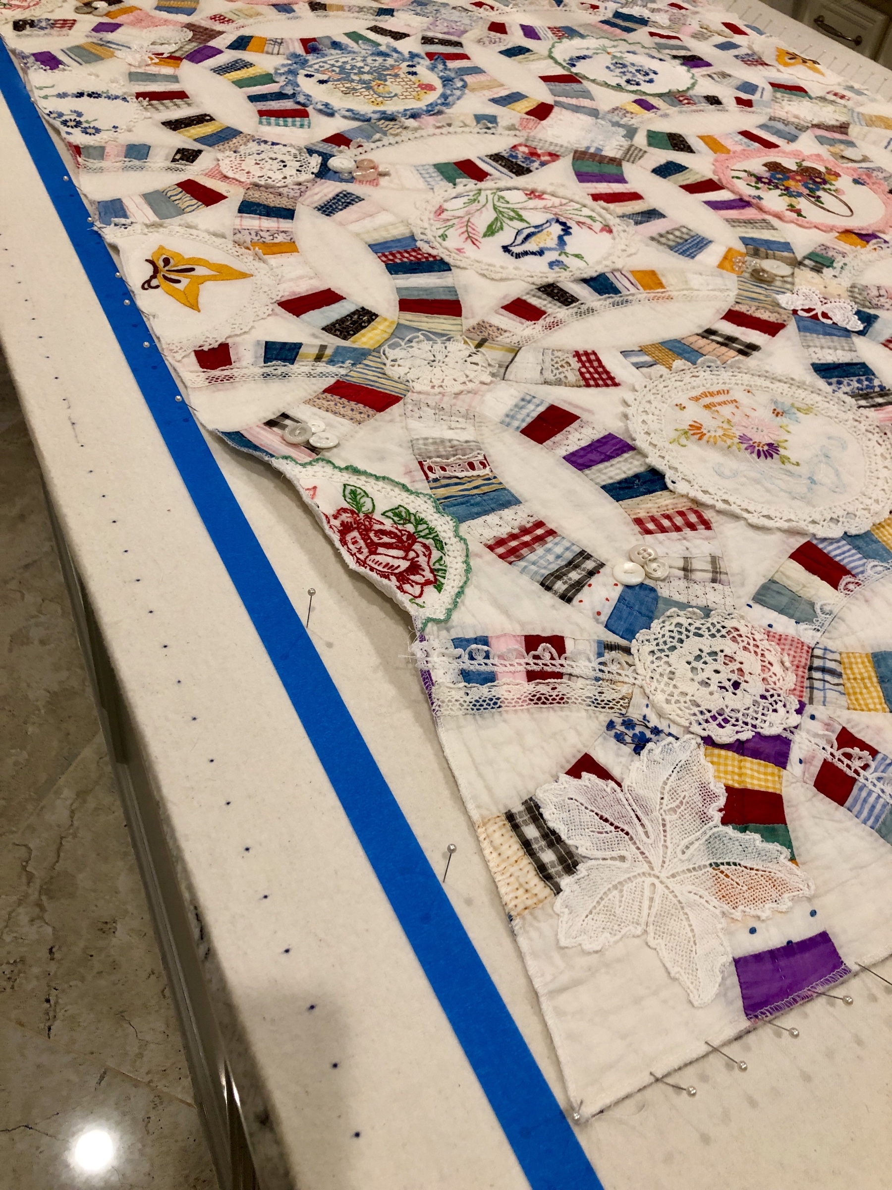 The embellishing is done through the first three layers. Once the final do-dad had been added, a layer of batting and the backing fabric are set in place.