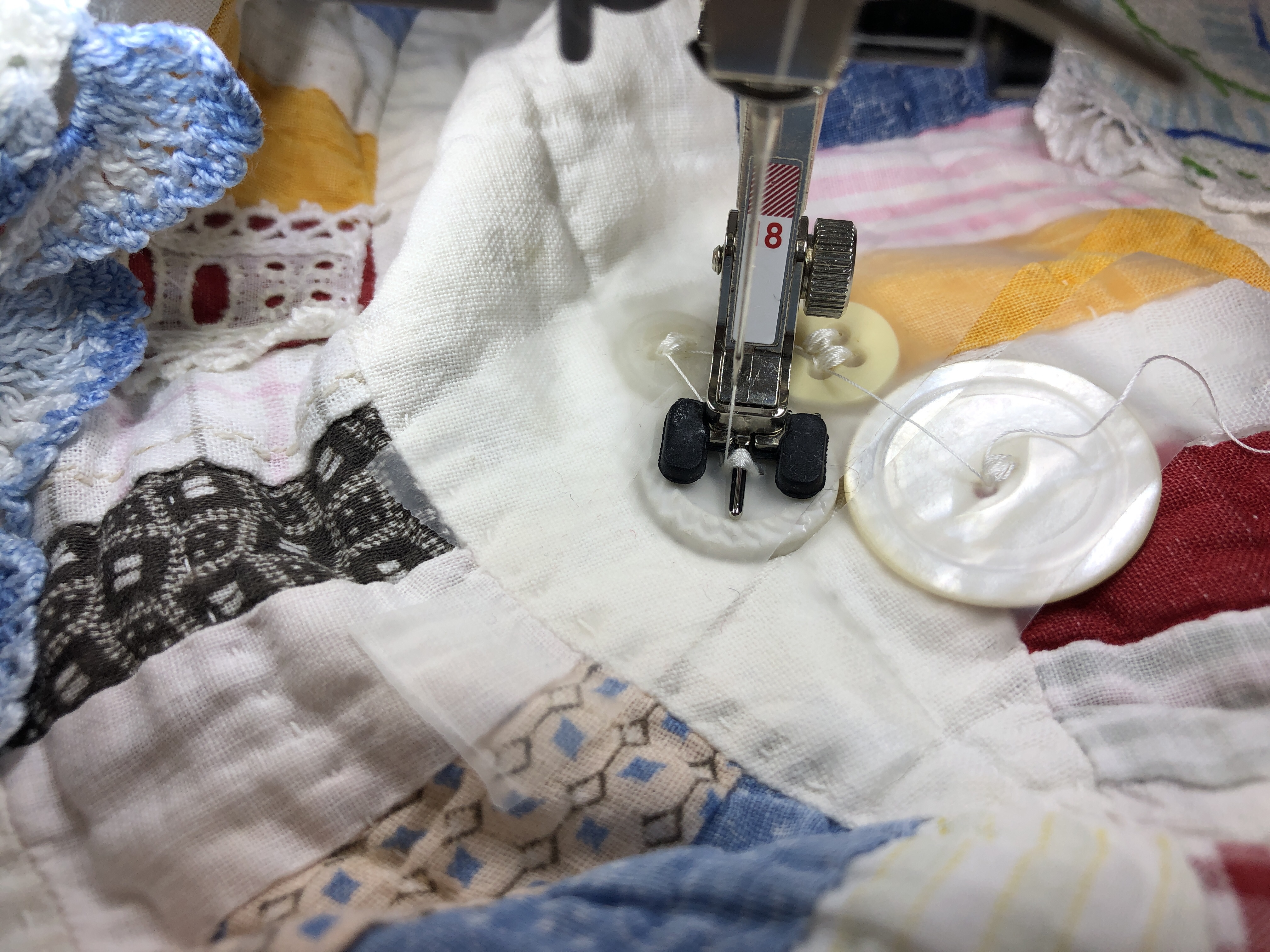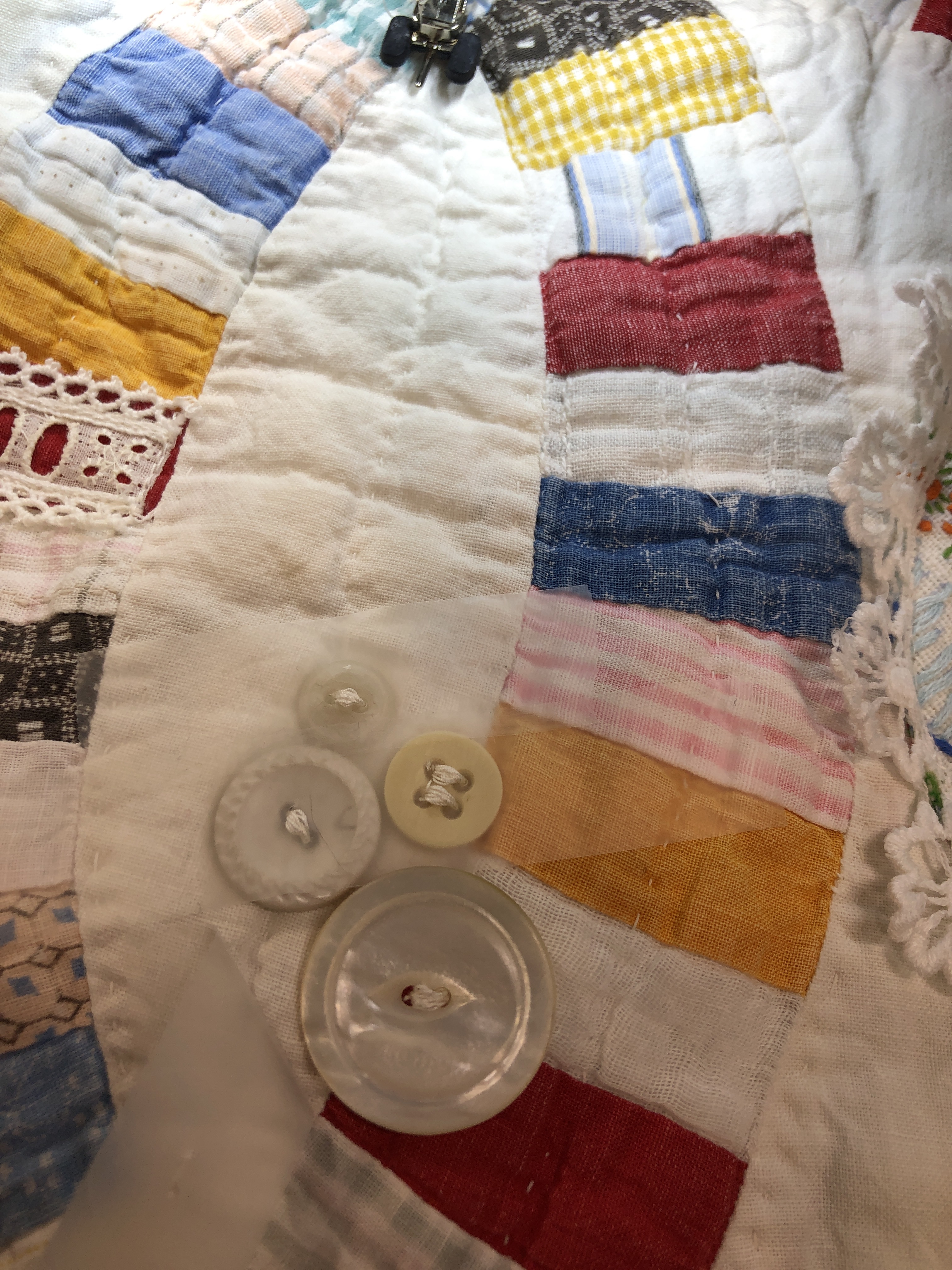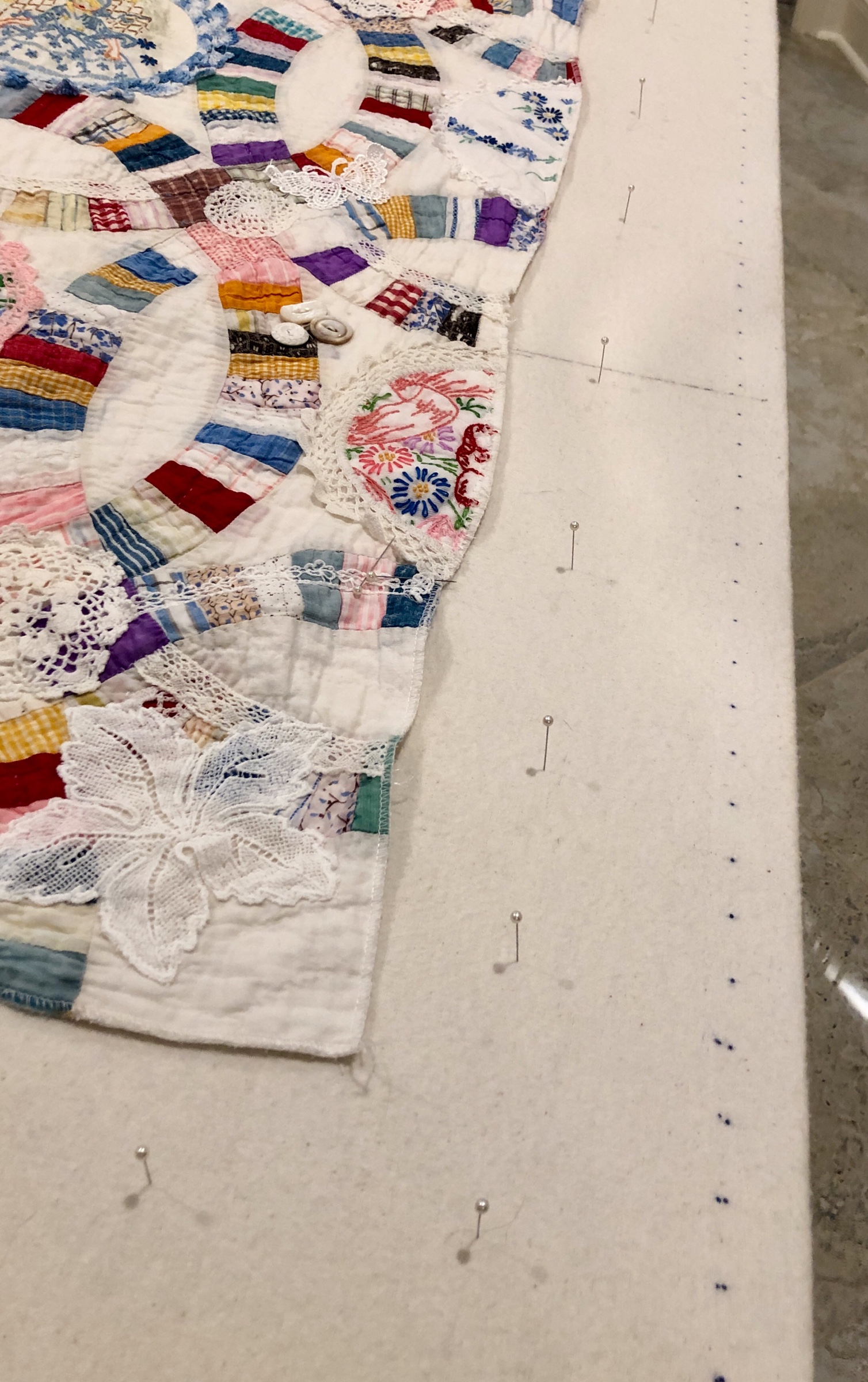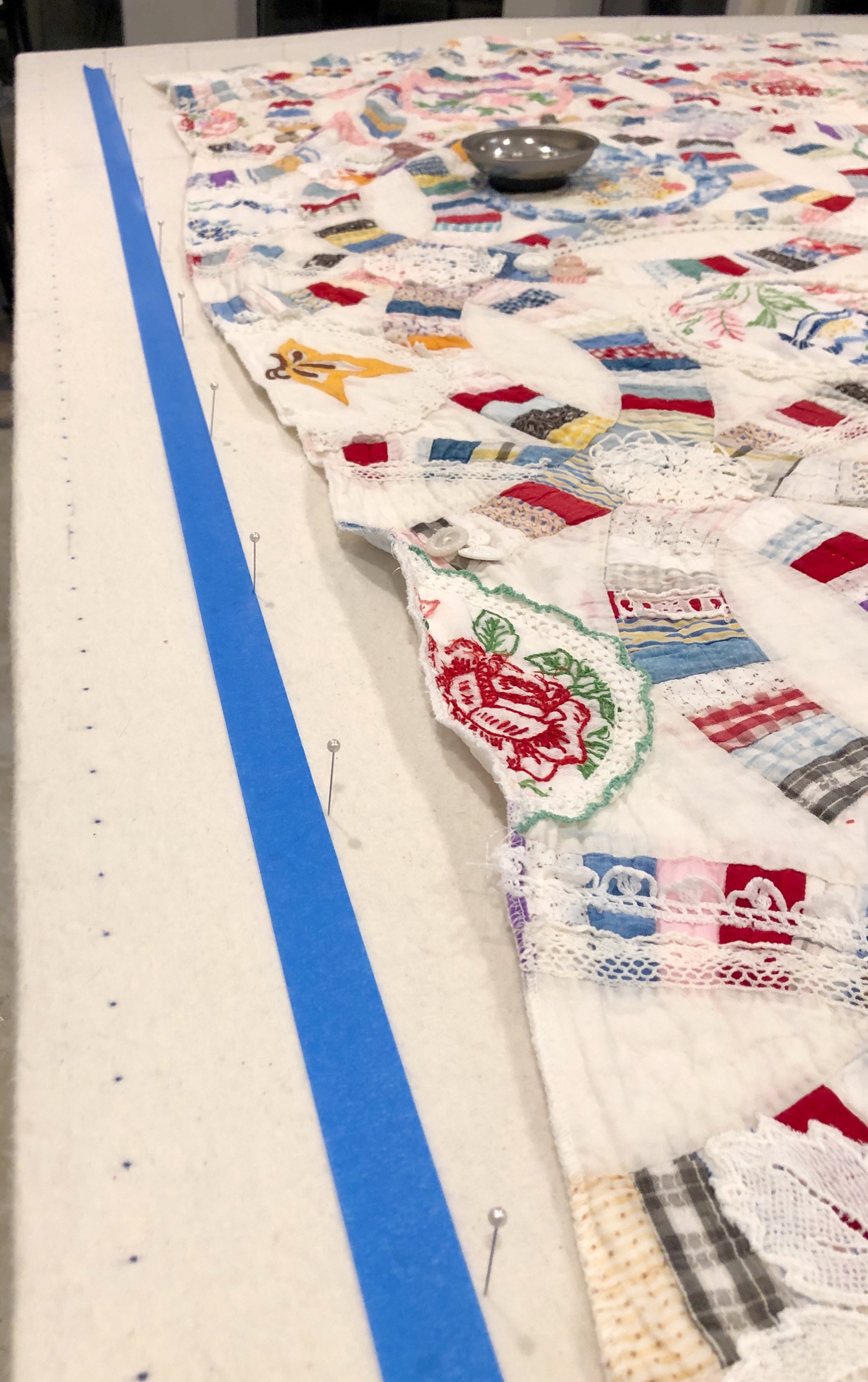 The embellishing is done through the first three layers. Once the final do-dad had been added, a layer of batting and the backing fabric are set in place.