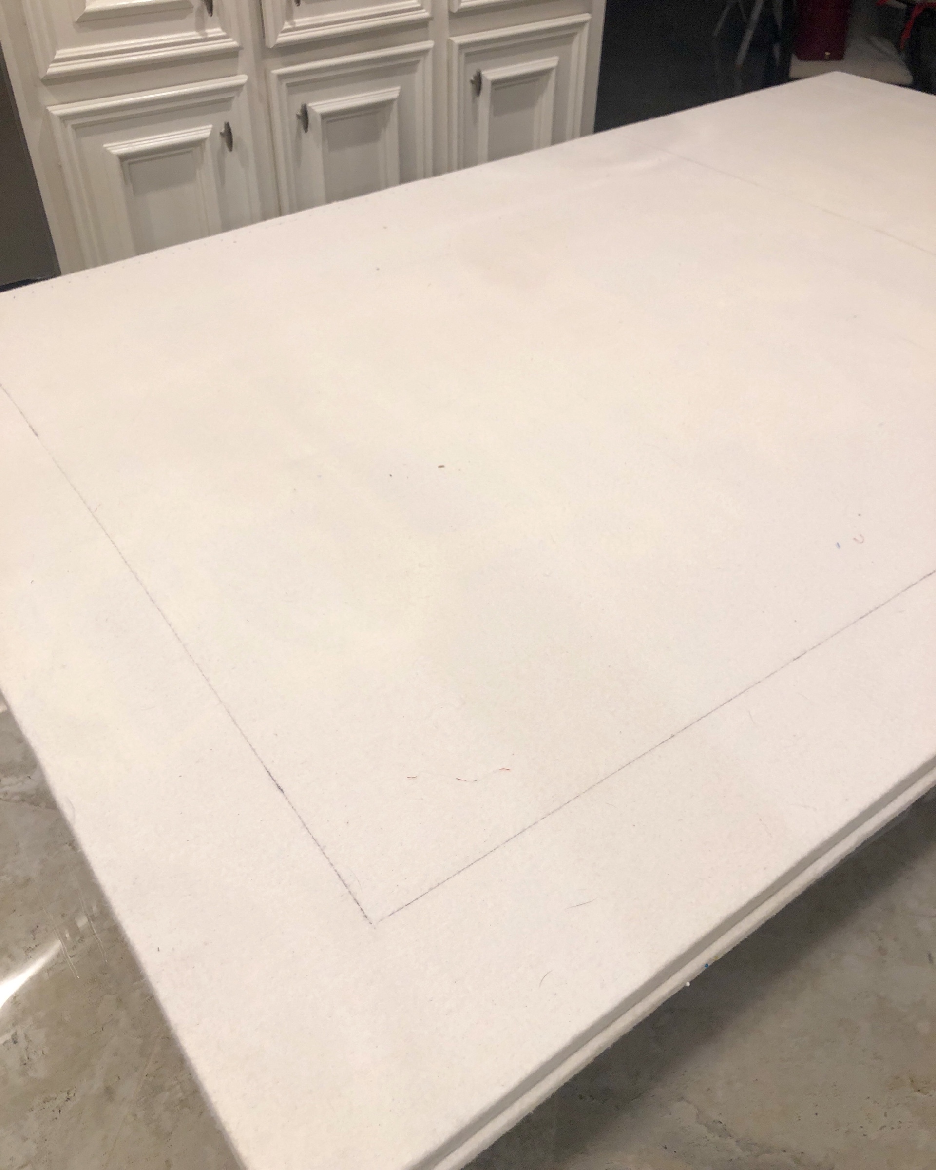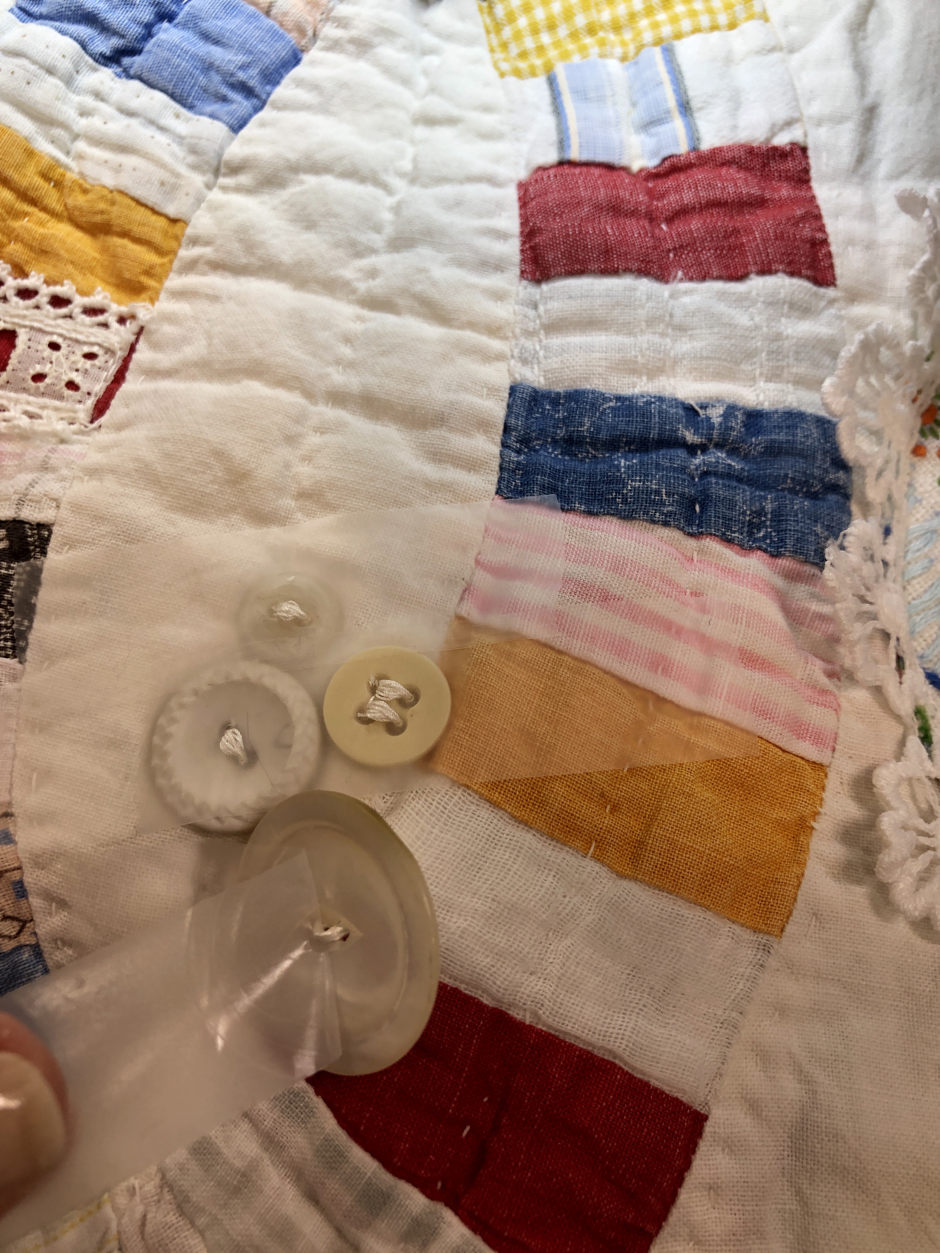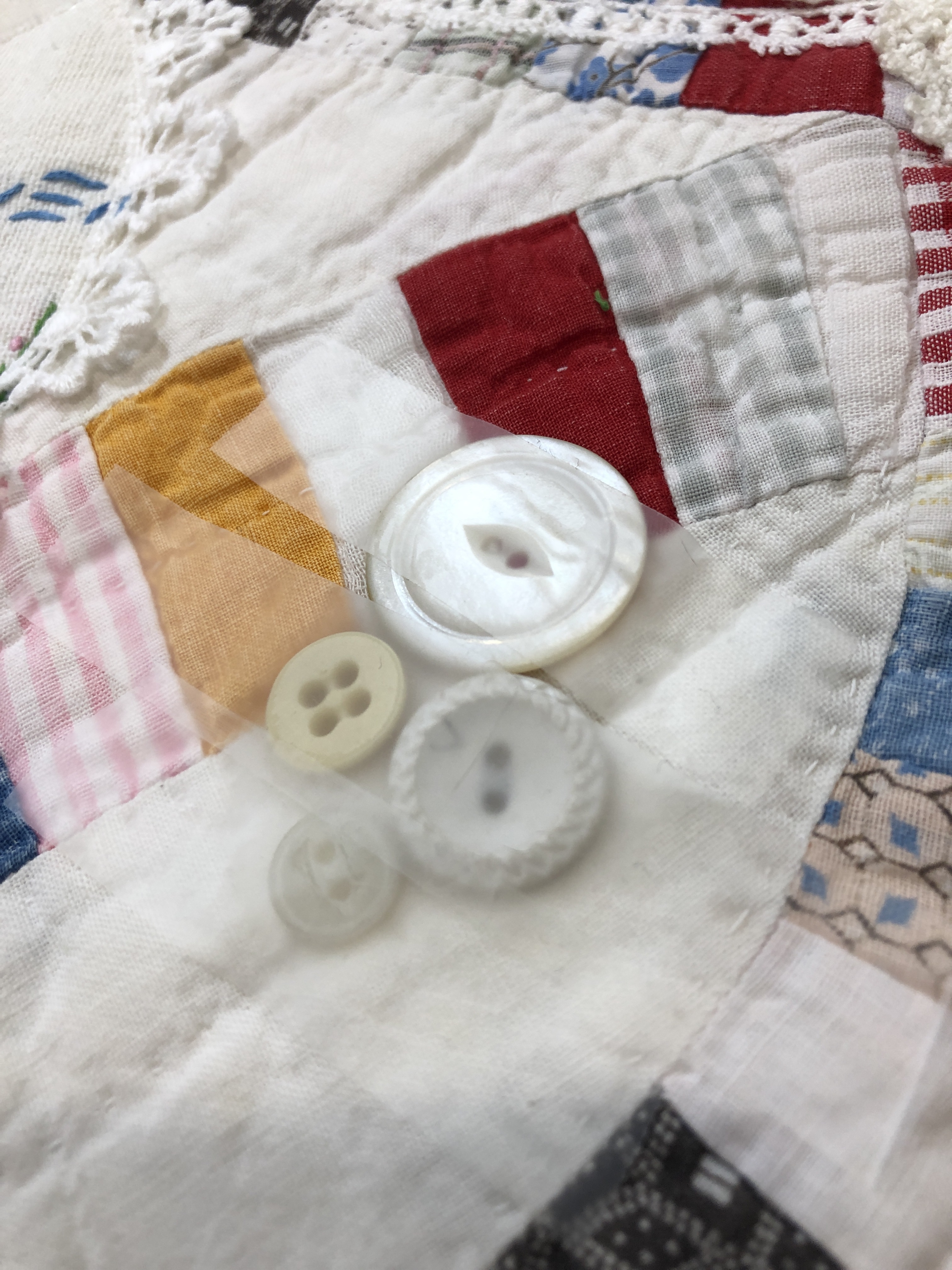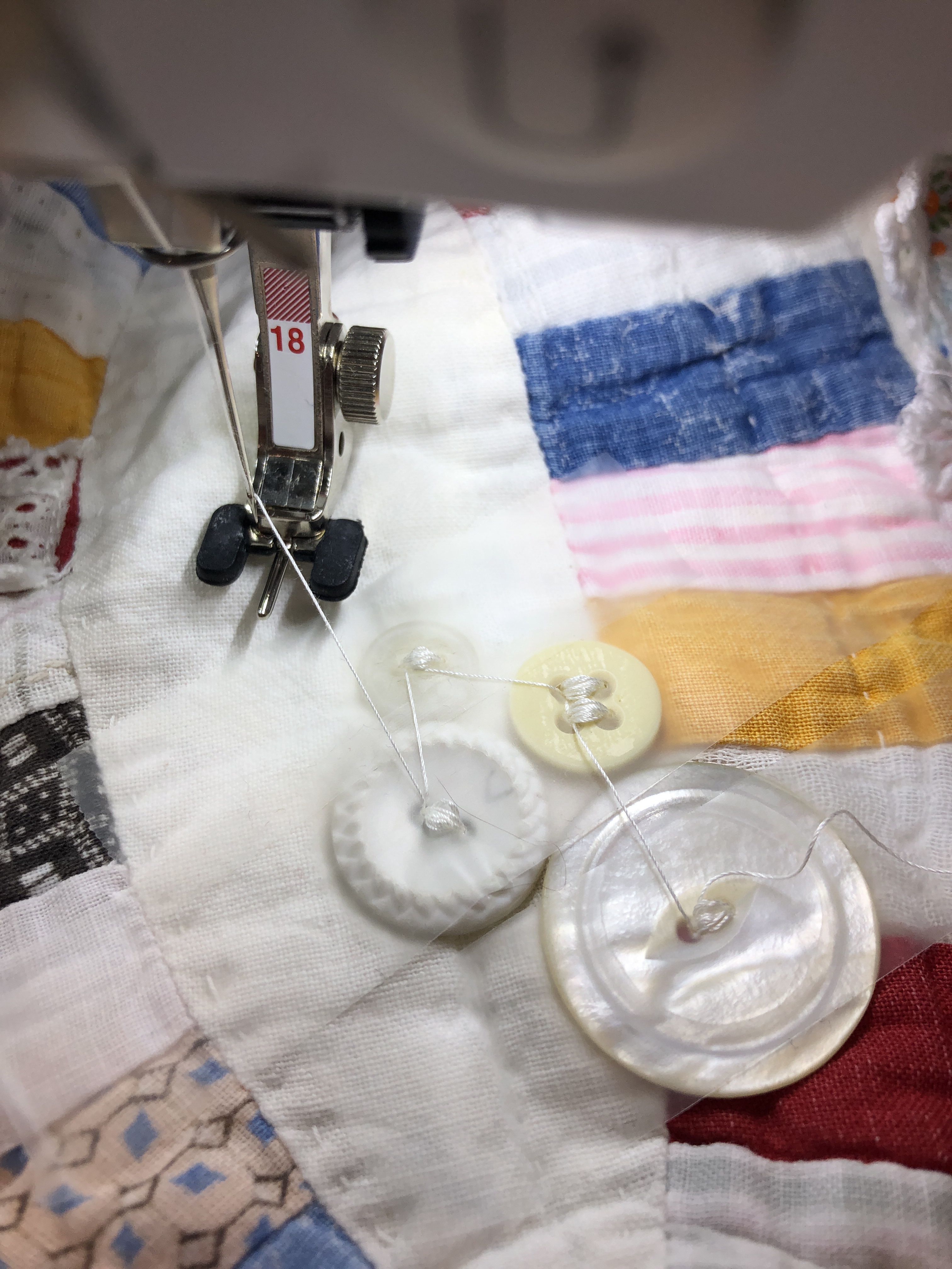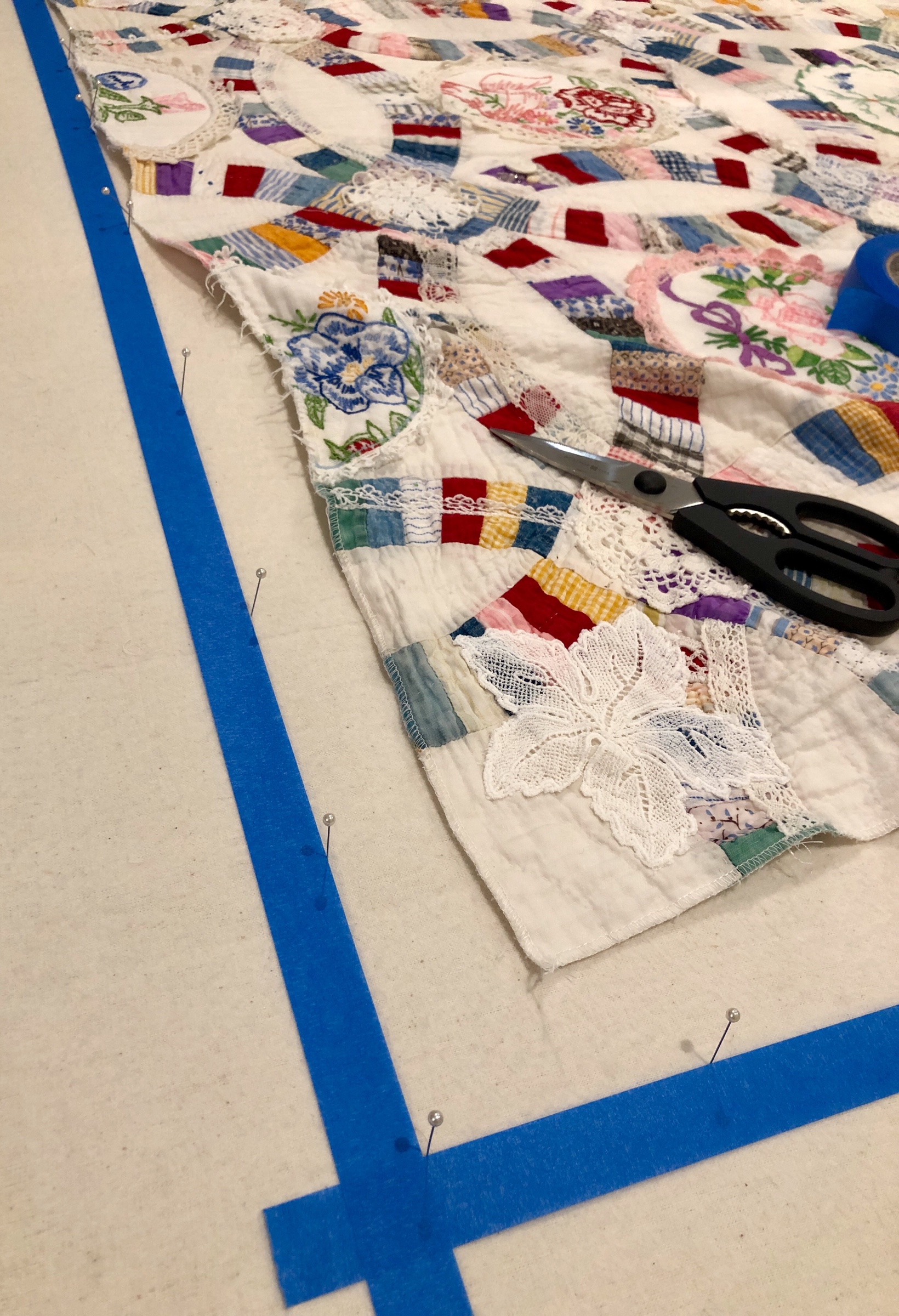 The embellishing is done through the first three layers. Once the final do-dad had been added, a layer of batting and the backing fabric are set in place.