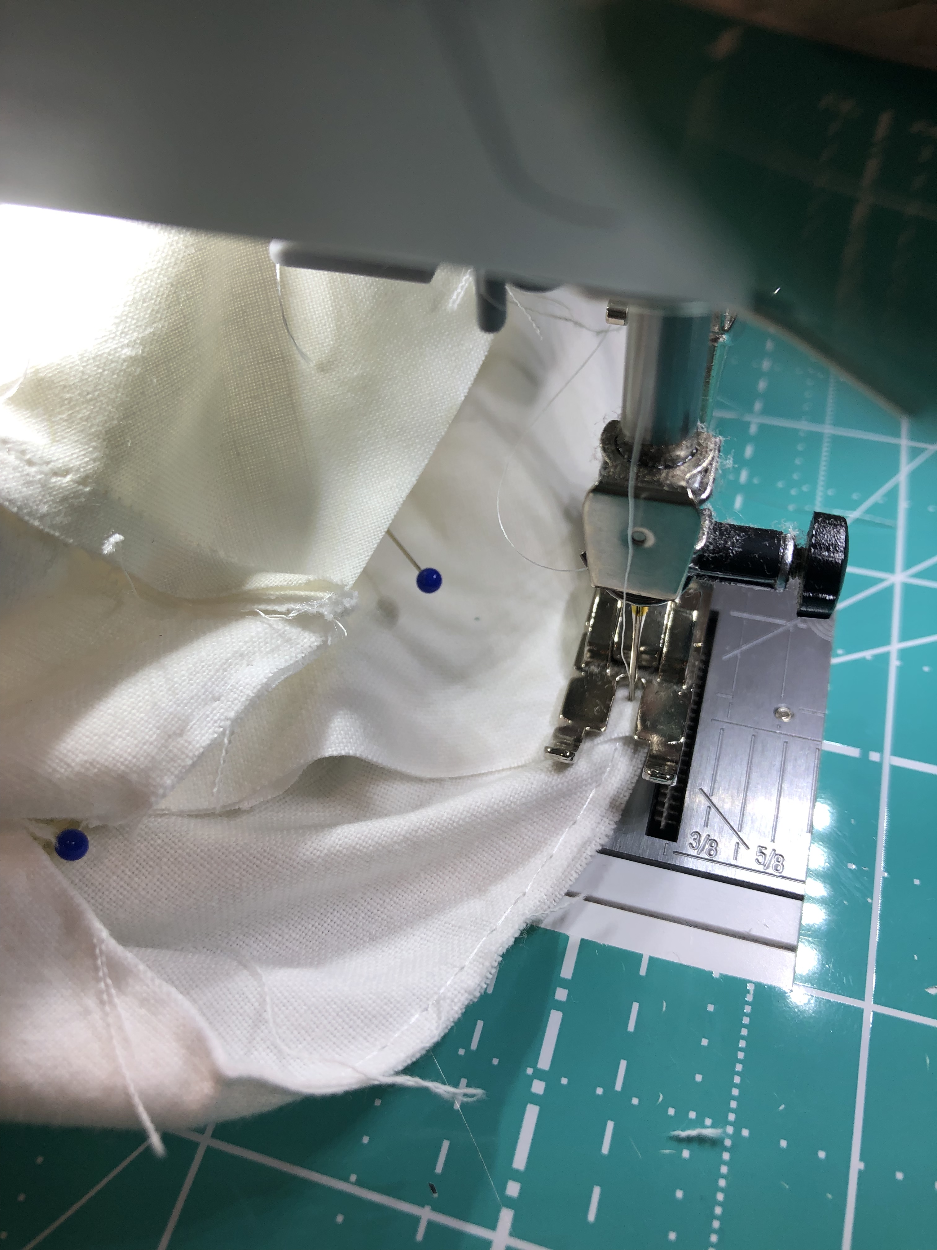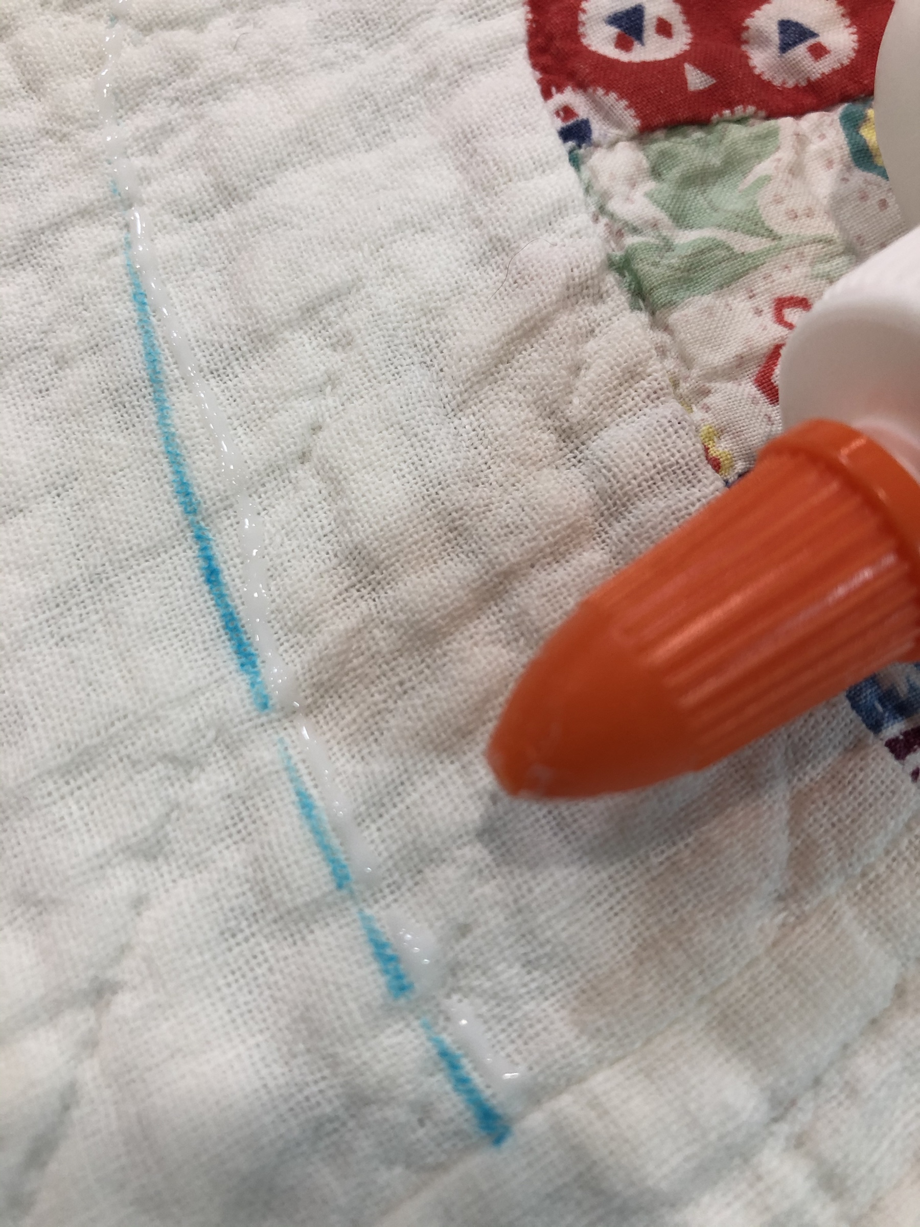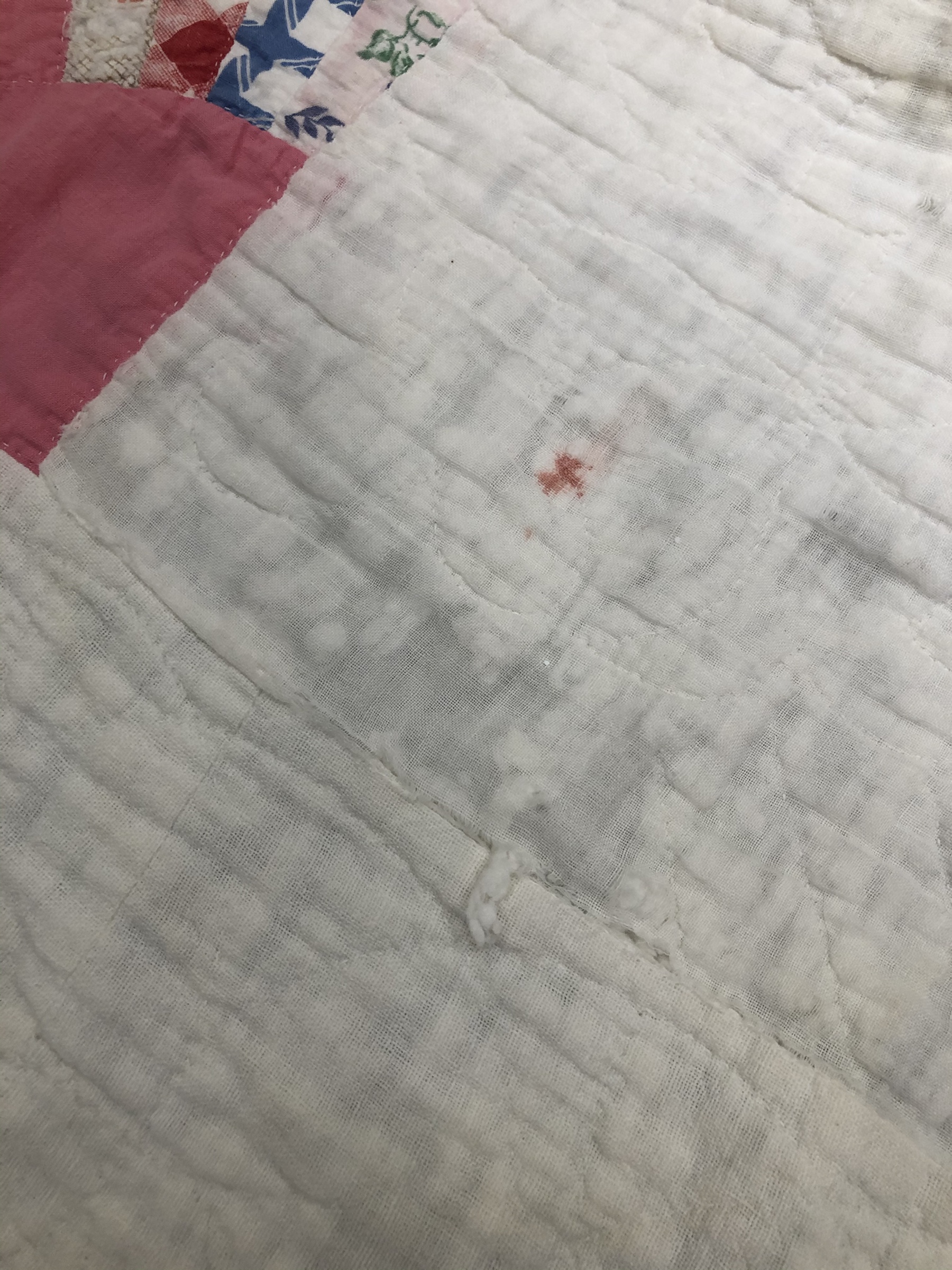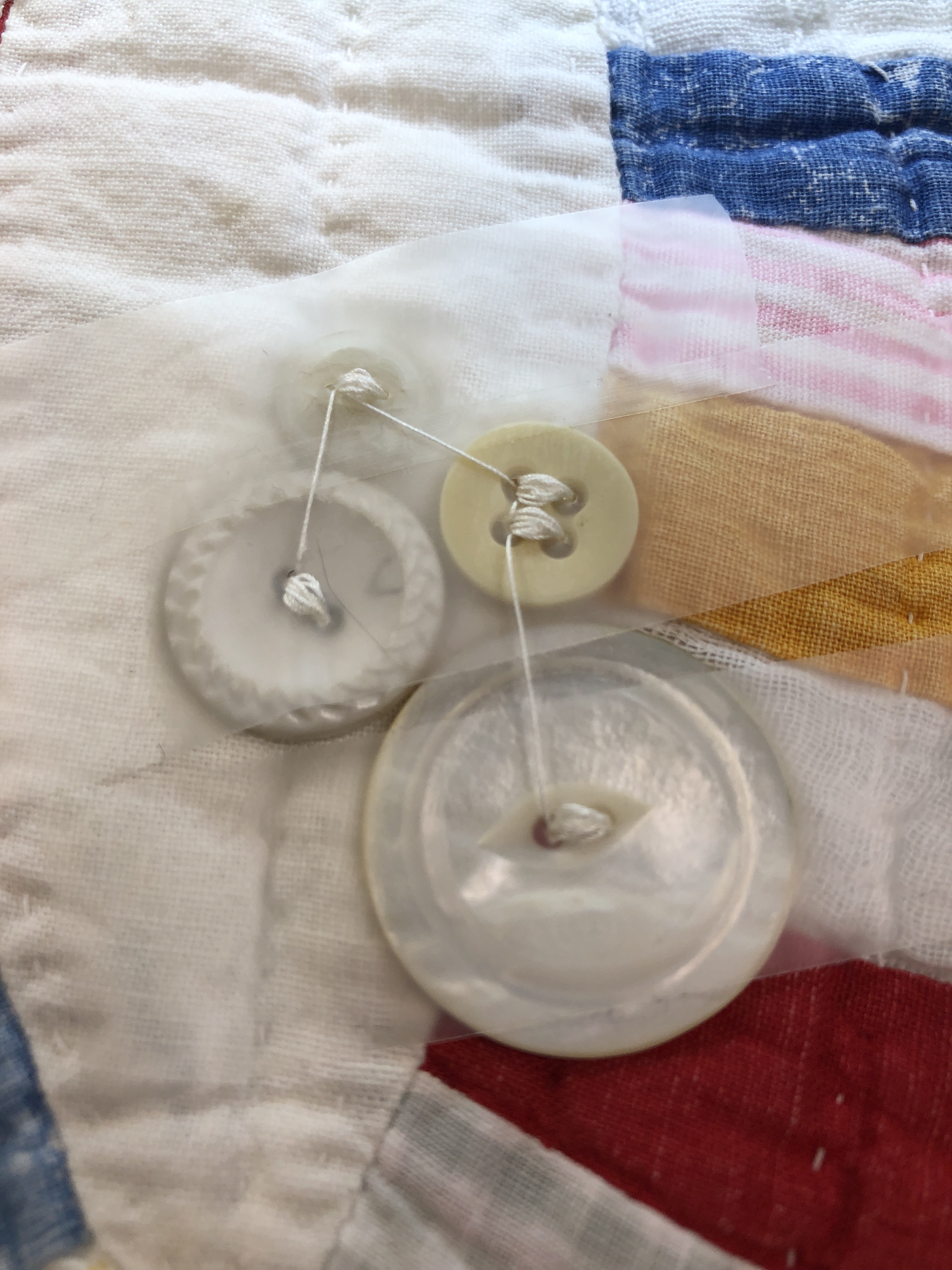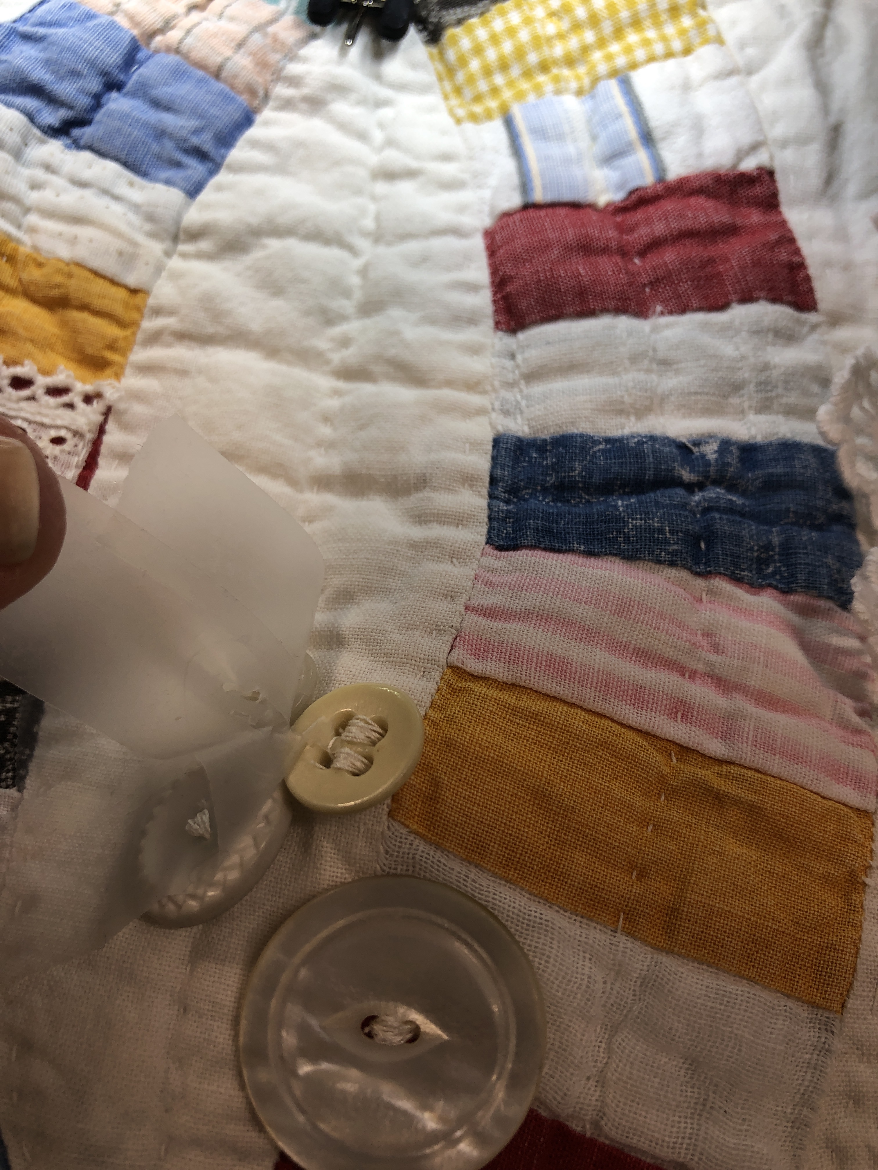 The embellishing is done through the first three layers. Once the final do-dad had been added, a layer of batting and the backing fabric are set in place.