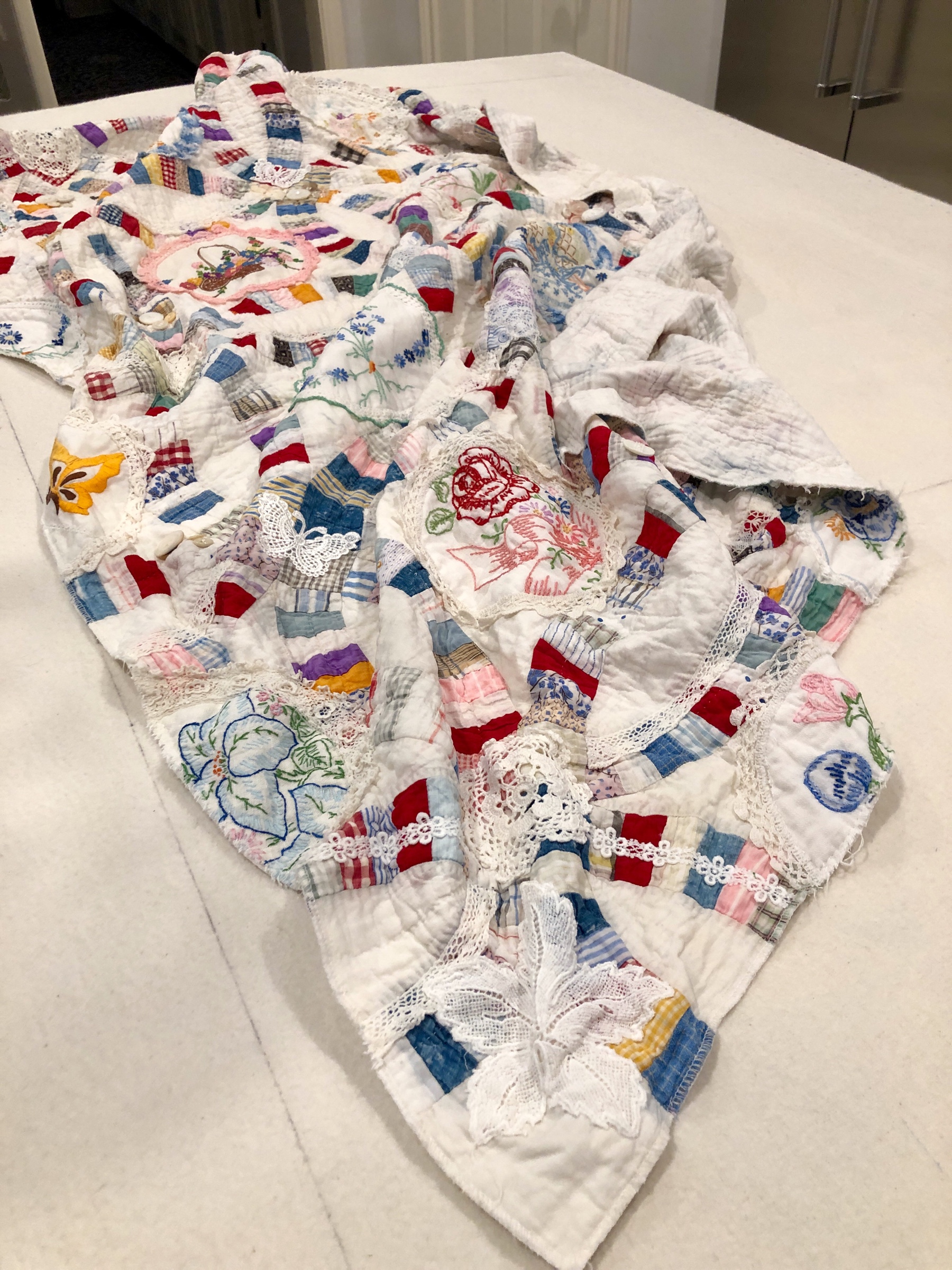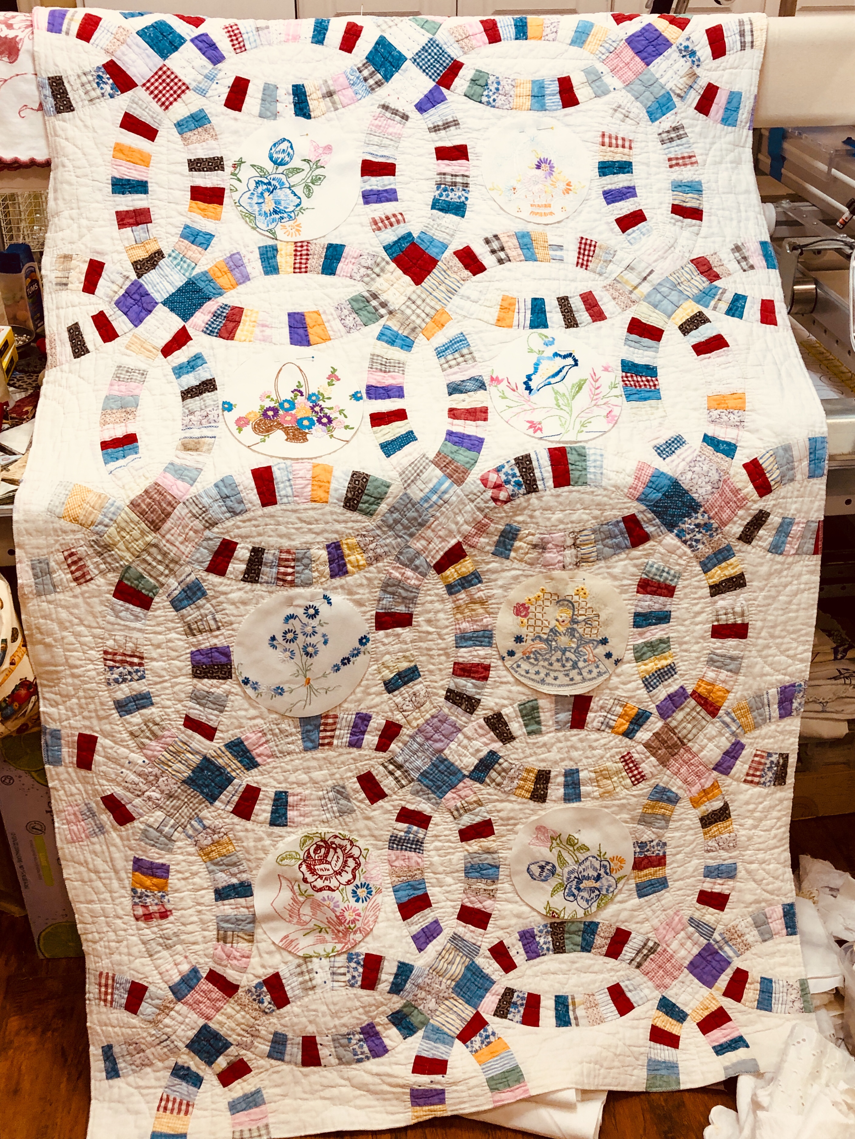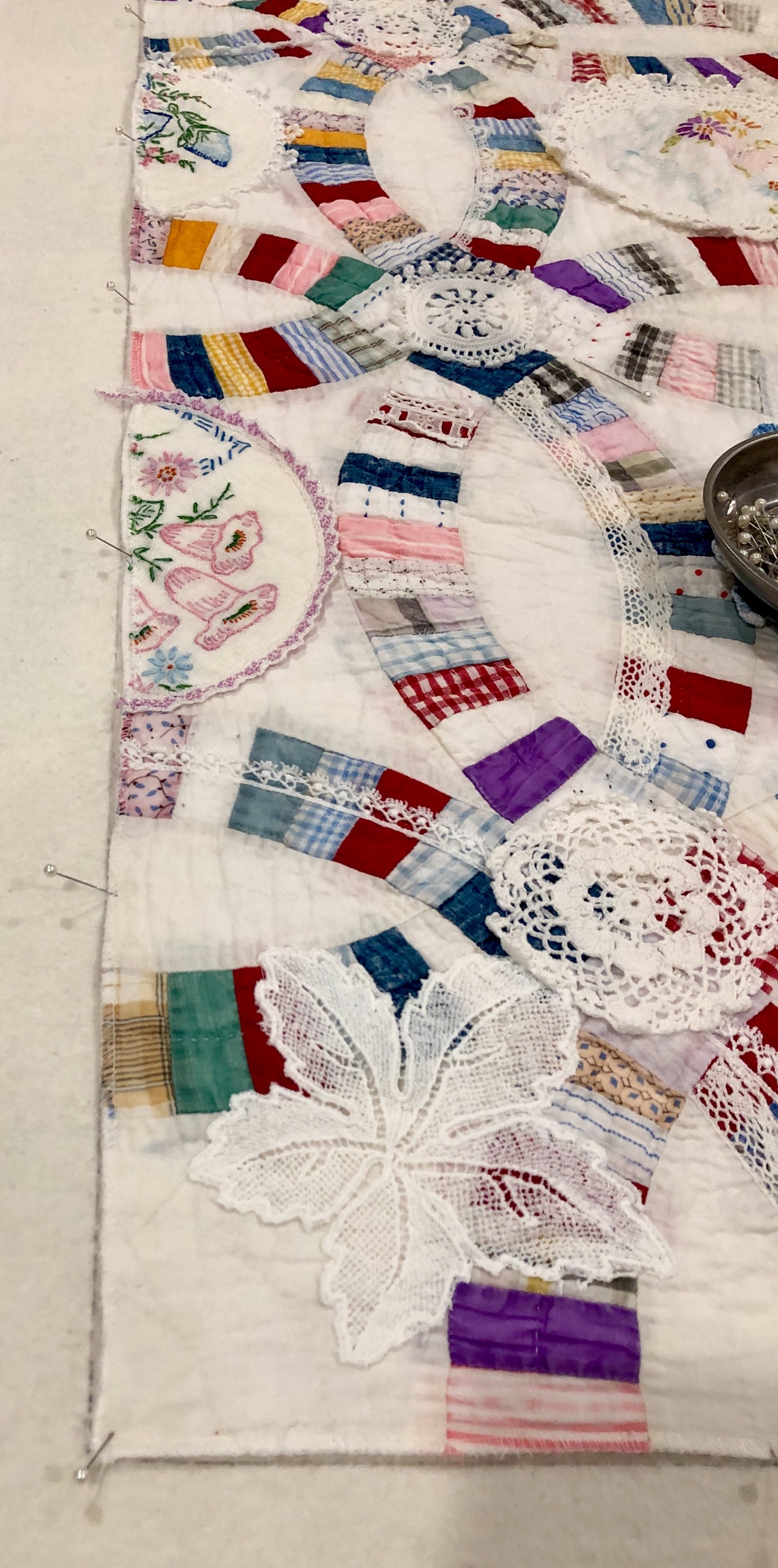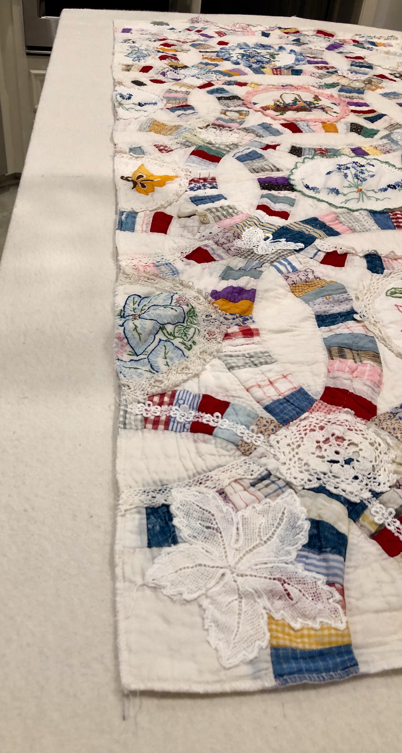 I might name this “The Project That Went On Forever” quilt. I started this in 2015 as part of the international CQJP group, the Crazy Quilt Journal Project. The idea was to make one block each month and then post the finished picture to the group. I kept up for the first 4? months and then life got in the way. If you go back to the post of 10/31/2016 you’ll see some early on pictures of how this project began. Slowly but surely I worked my way through all 15 embellished hexagons and 31 embellished equilateral triangles. Both the hexies and triangles are constructed in the same manner, backing fabric that wraps around to the front to form a 1/4″ white border/frame making each of the 46 fully finished stand alone pieces. I hand stitched them right sides together in the fashion of EPP (English Paper Piecing) using a thin strong white thread making tiny whip stitches.