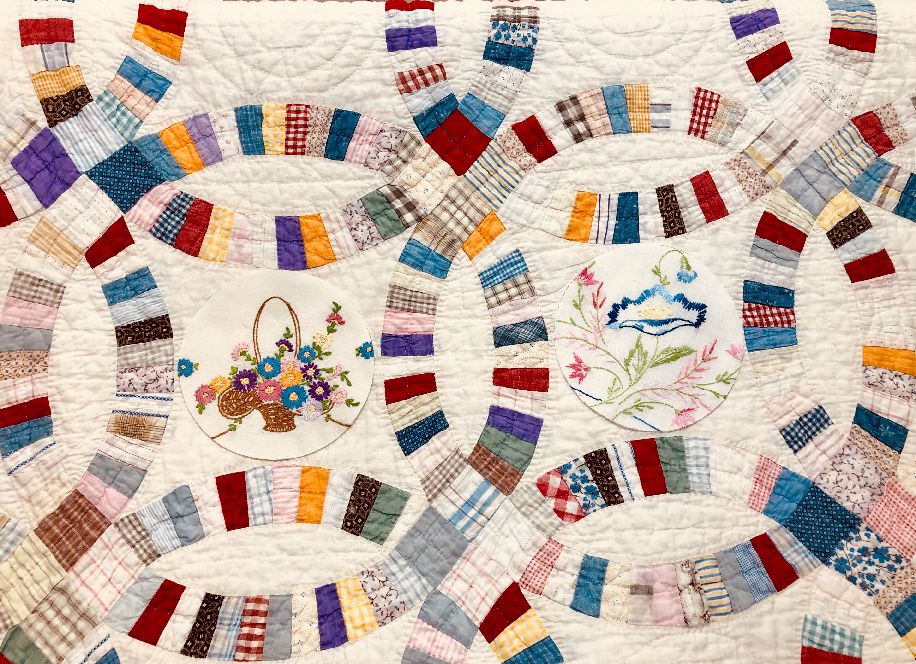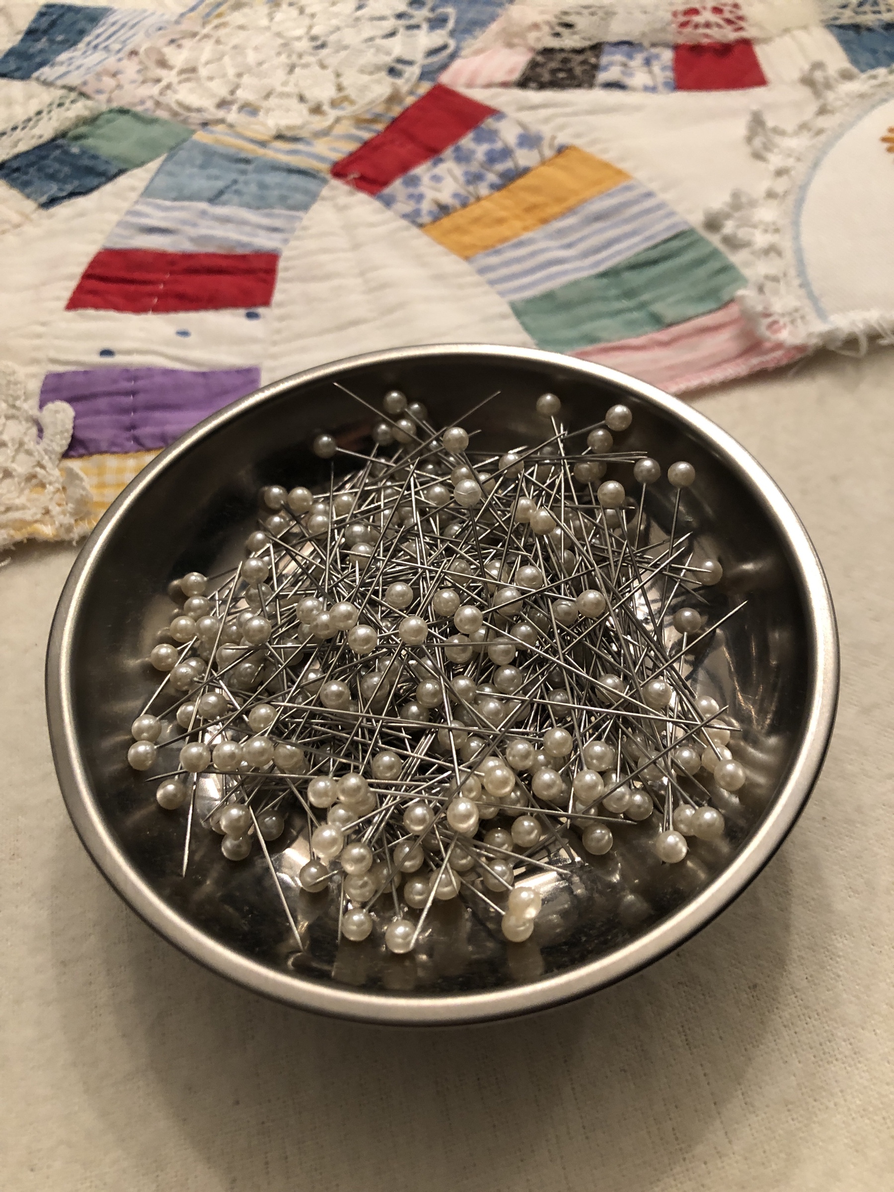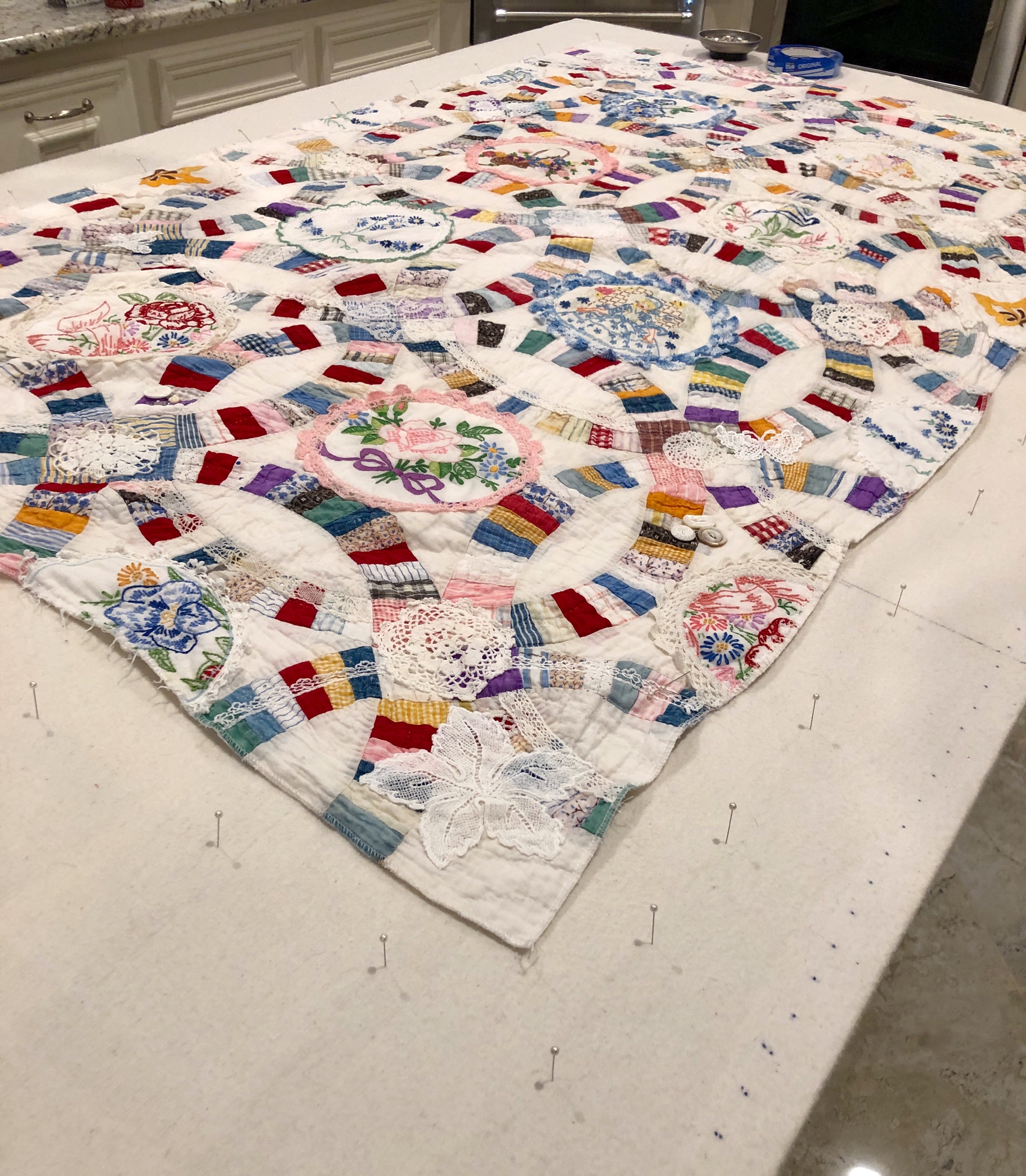 I might name this “The Project That Went On Forever” quilt. I started this in 2015 as part of the international CQJP group, the Crazy Quilt Journal Project. The idea was to make one block each month and then post the finished picture to the group. I kept up for the first 4? months and then life got in the way. If you go back to the post of 10/31/2016 you’ll see some early on pictures of how this project began. Slowly but surely I worked my way through all 15 embellished hexagons and 31 embellished equilateral triangles. Both the hexies and triangles are constructed in the same manner, backing fabric that wraps around to the front to form a 1/4″ white border/frame making each of the 46 fully finished stand alone pieces. I hand stitched them right sides together in the fashion of EPP (English Paper Piecing) using a thin strong white thread making tiny whip stitches.