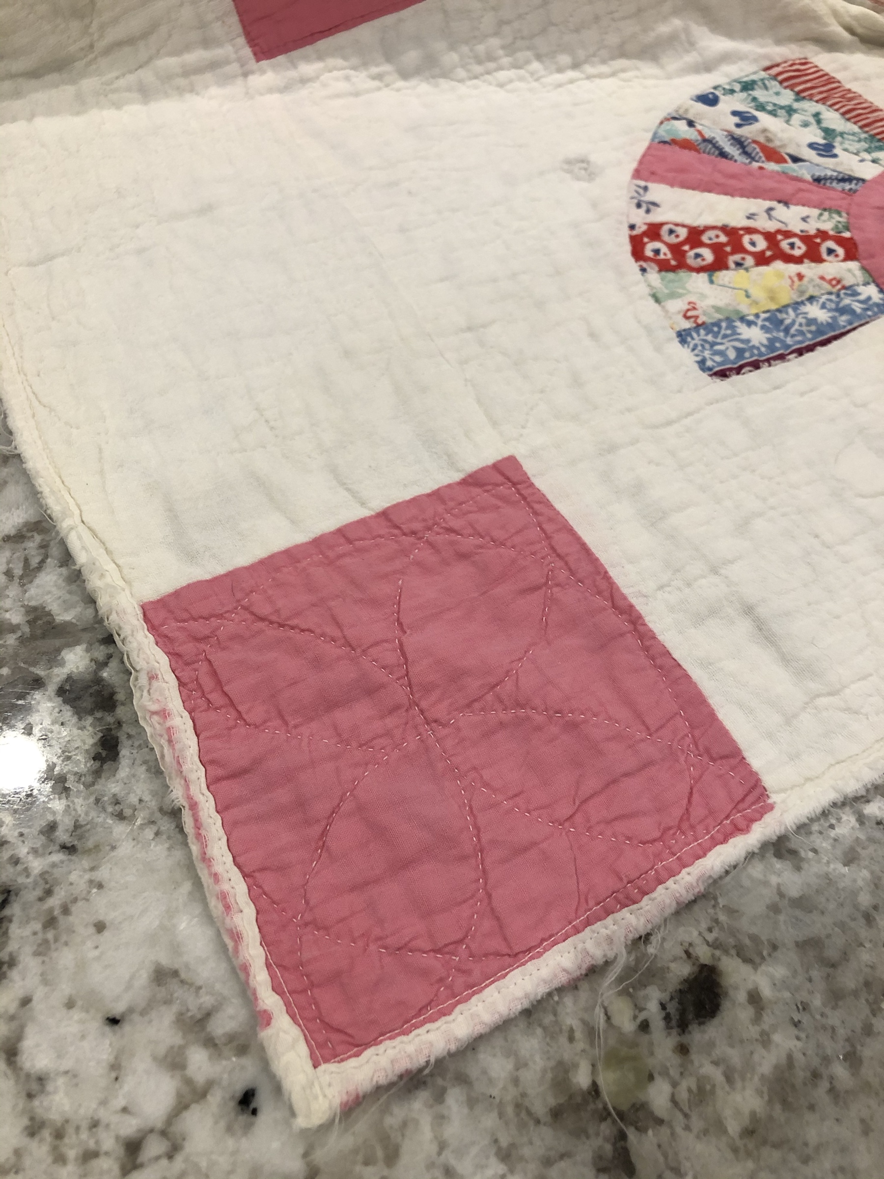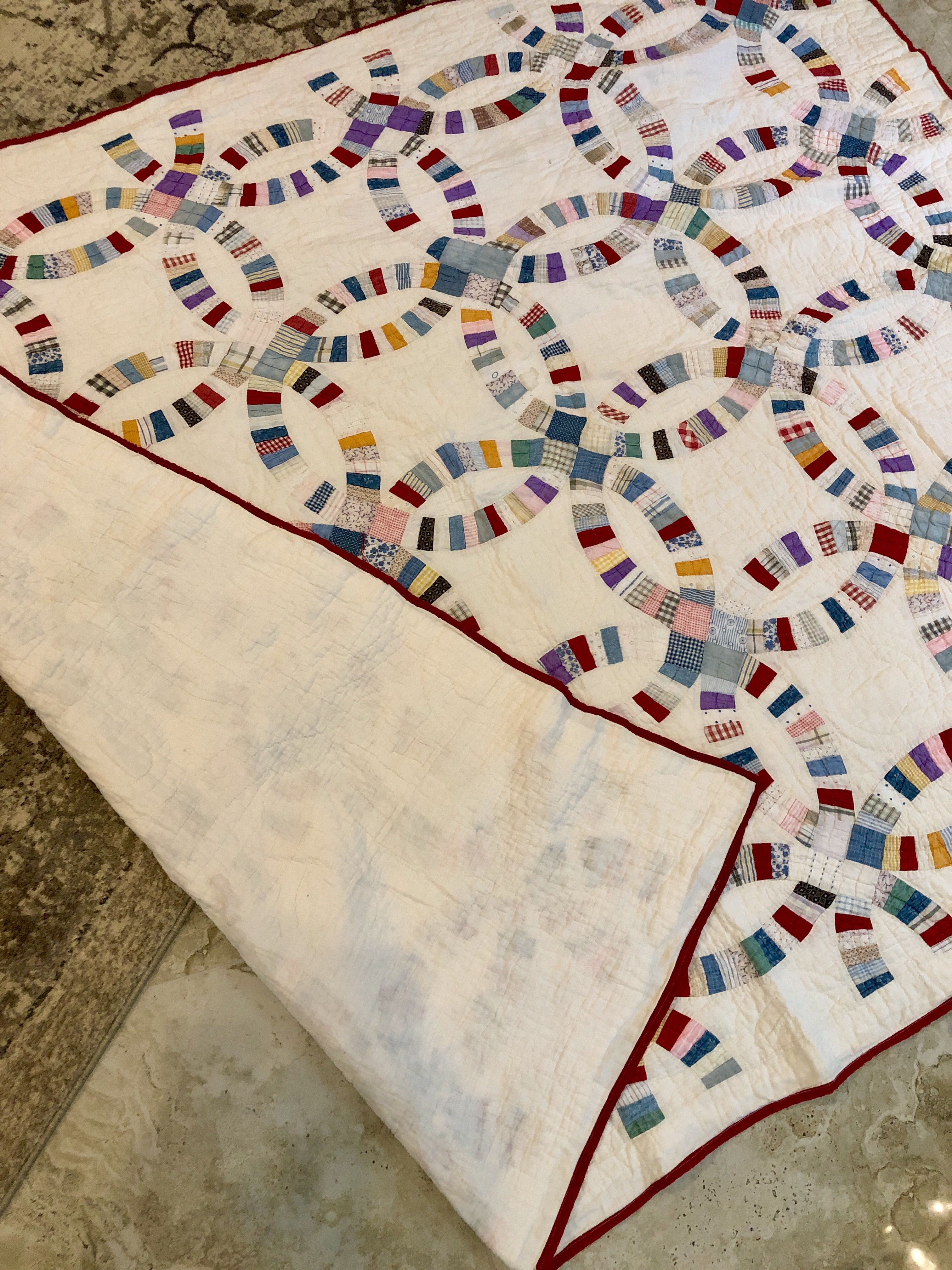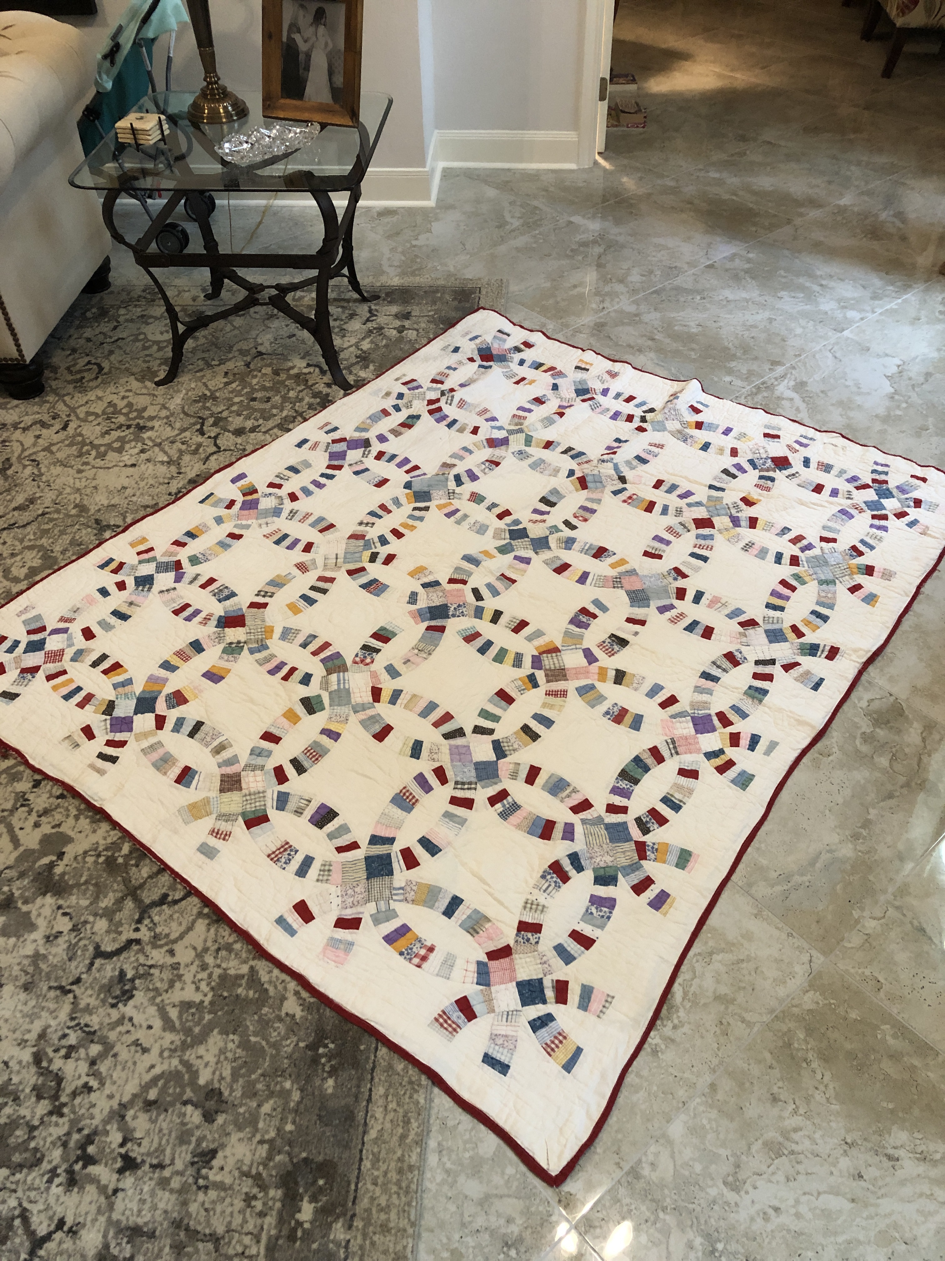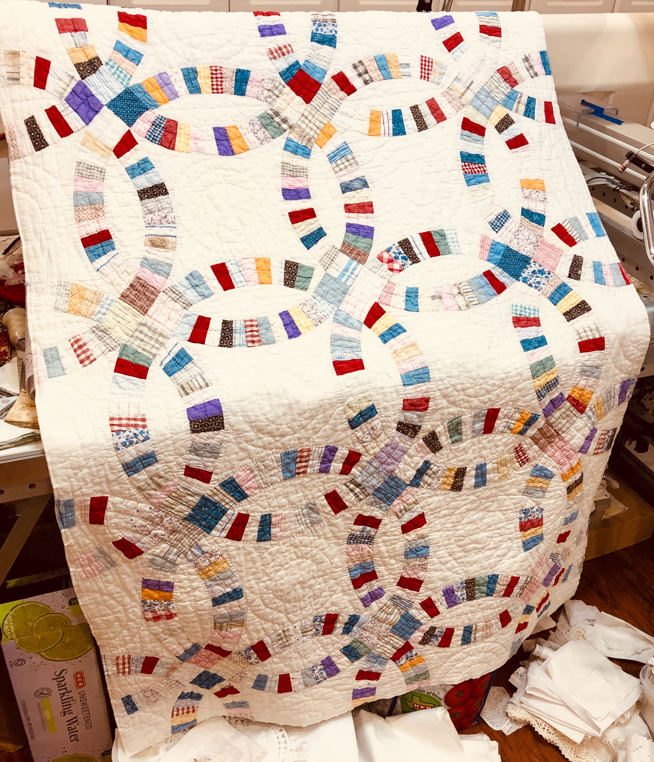 I might name this “The Project That Went On Forever” quilt. I started this in 2015 as part of the international CQJP group, the Crazy Quilt Journal Project. The idea was to make one block each month and then post the finished picture to the group. I kept up for the first 4? months and then life got in the way. If you go back to the post of 10/31/2016 you’ll see some early on pictures of how this project began. Slowly but surely I worked my way through all 15 embellished hexagons and 31 embellished equilateral triangles. Both the hexies and triangles are constructed in the same manner, backing fabric that wraps around to the front to form a 1/4″ white border/frame making each of the 46 fully finished stand alone pieces. I hand stitched them right sides together in the fashion of EPP (English Paper Piecing) using a thin strong white thread making tiny whip stitches.