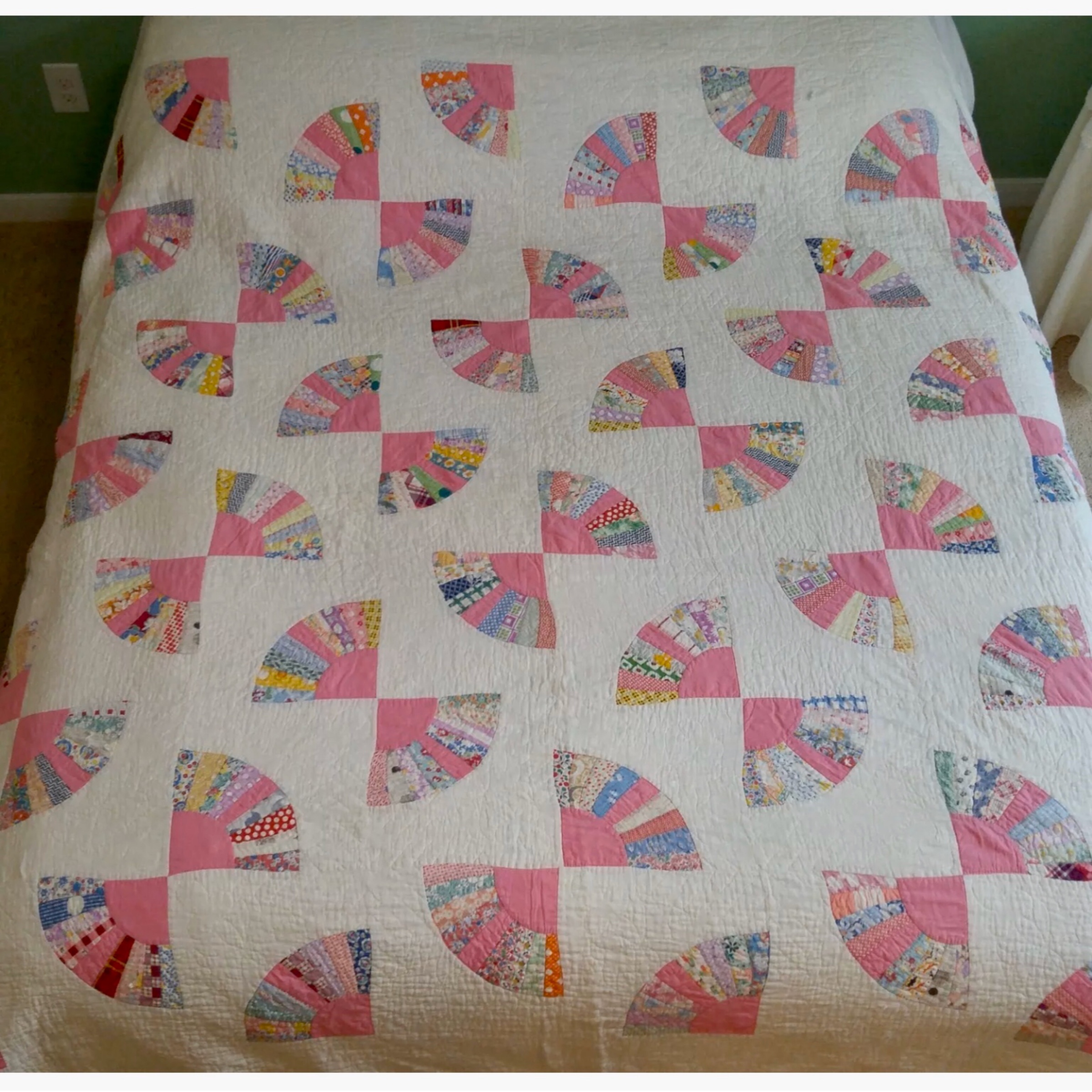 The hexagons vary, each one completely different, the white triangles are uniform in appearance. This hexie above, while 6 sided is made by sewing strips to each of the 5 sides of the center pentagon.