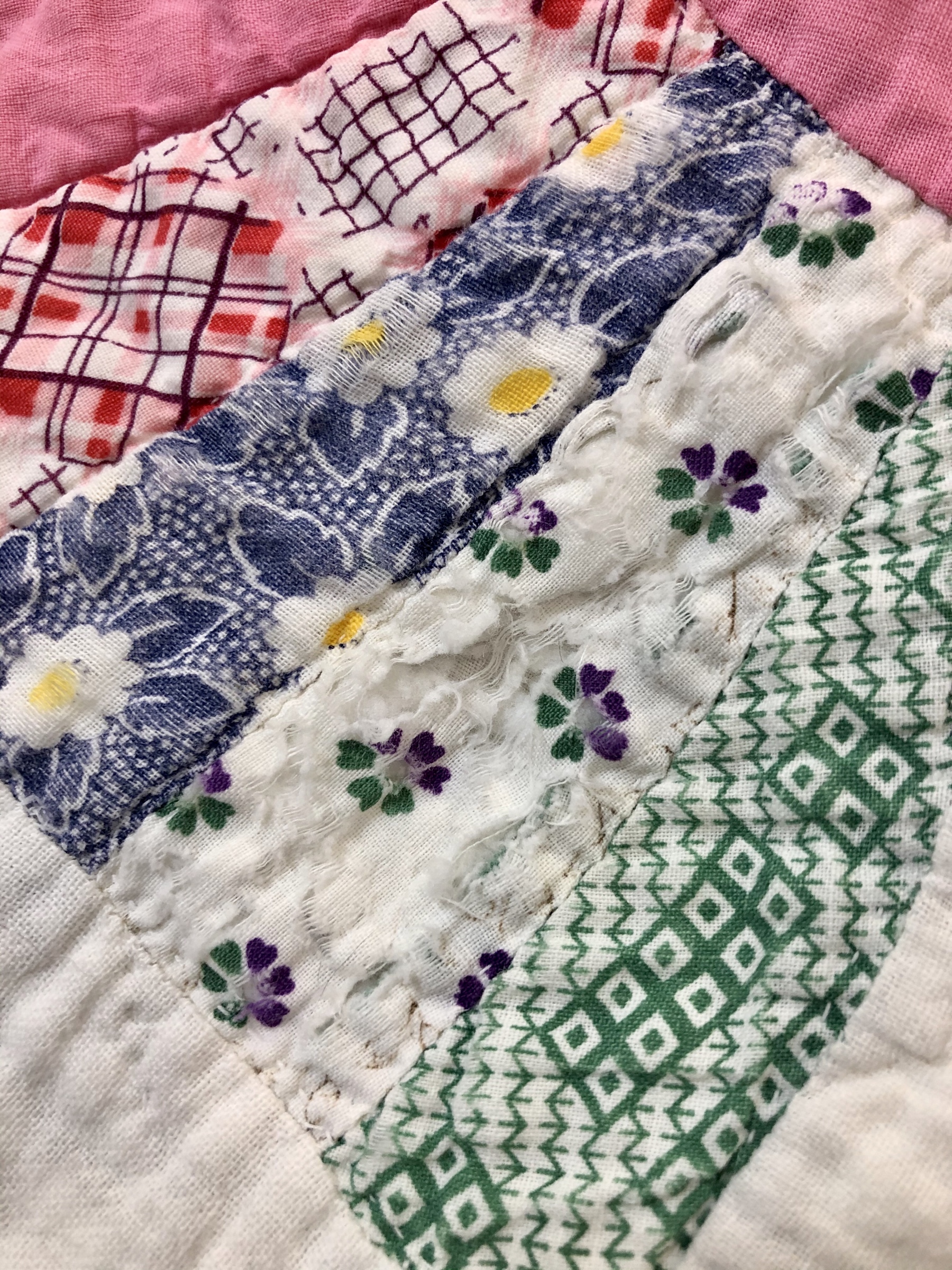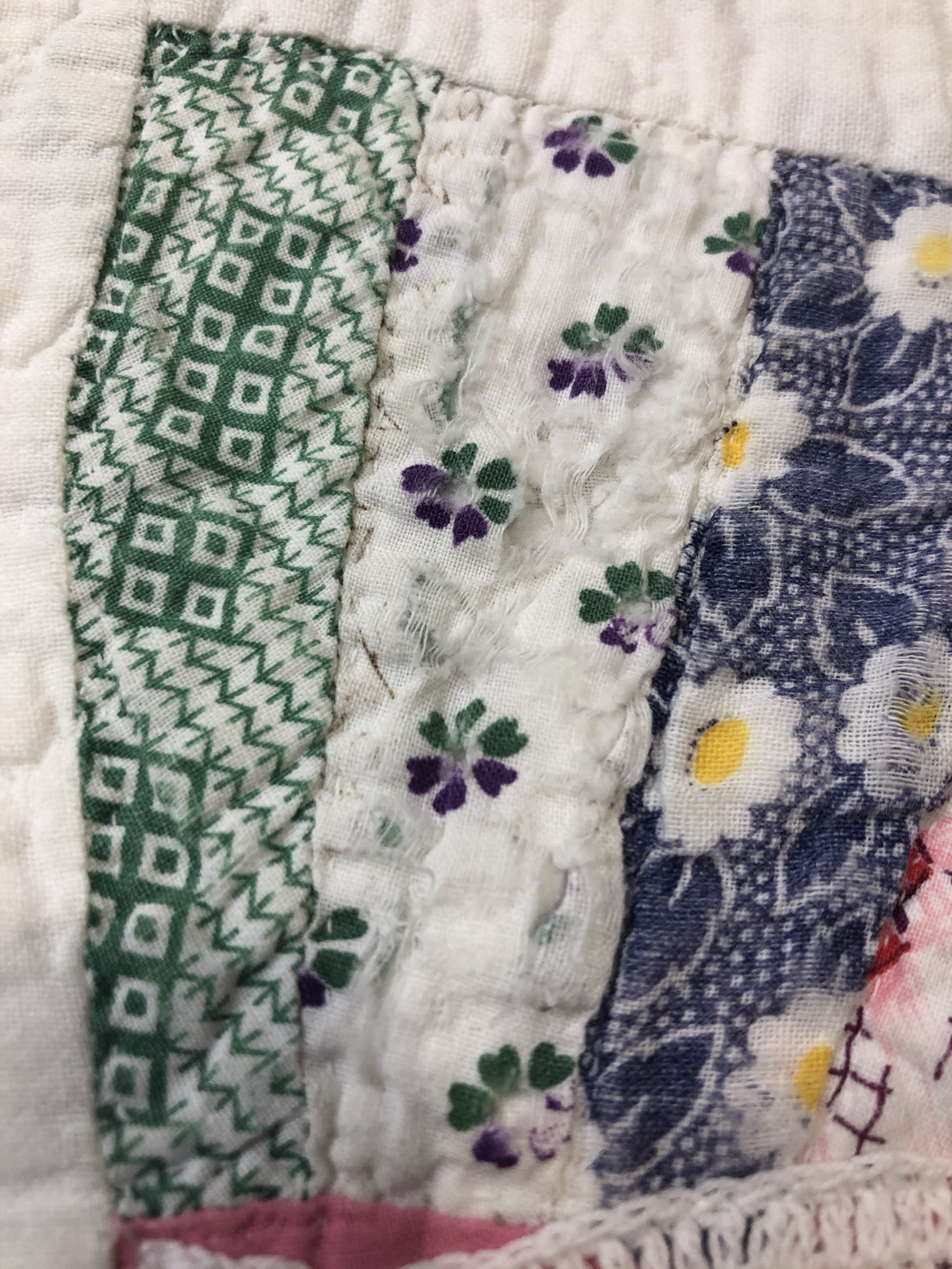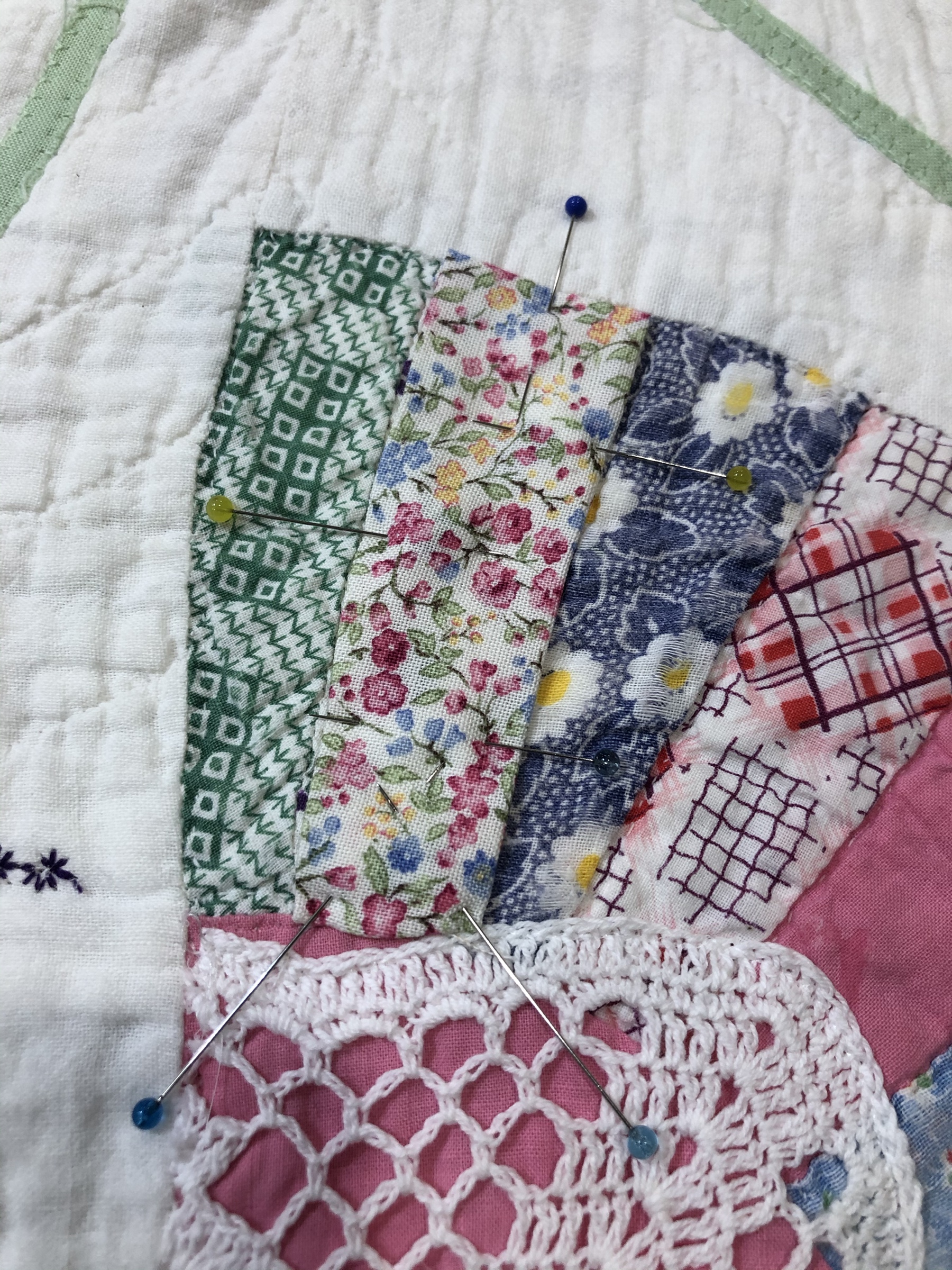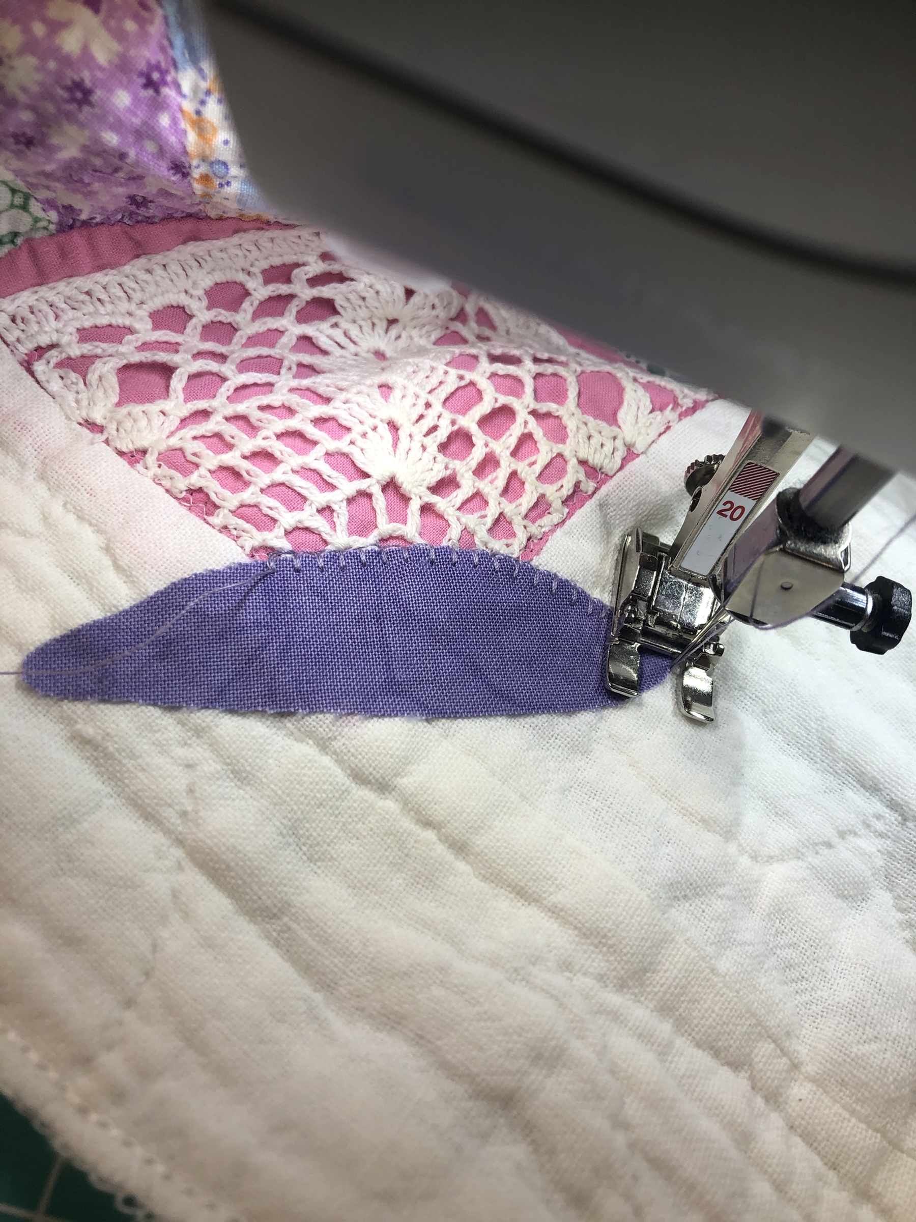Beautiful purple/lavender flowers crown this hexagon. They were cut from a seriously damaged vintage table-topper I found at an antique shop in Huntsville, TX. Visually they are very strong and needed a softer base on which to sit. The band of ivory trim separating them from the soft flowers beneath give the eye a place to find comfort.